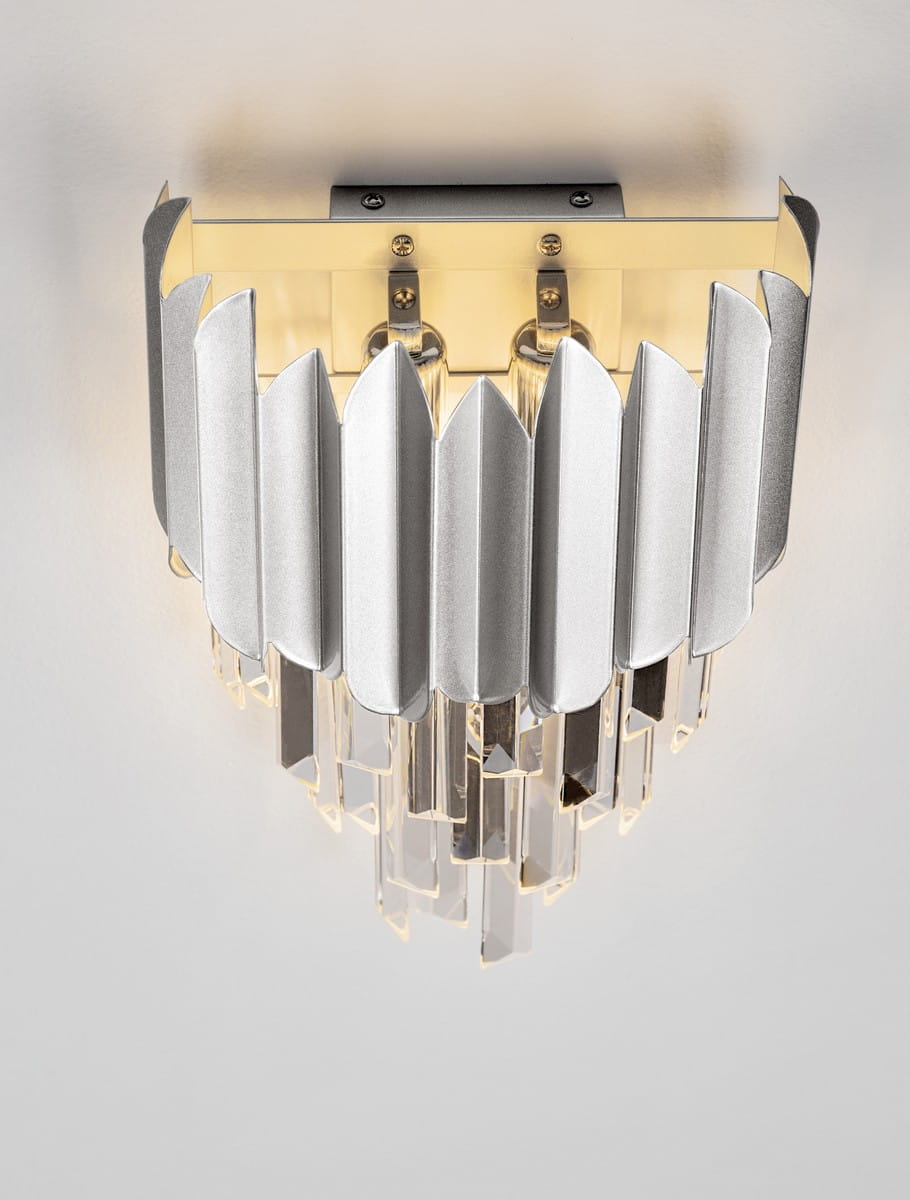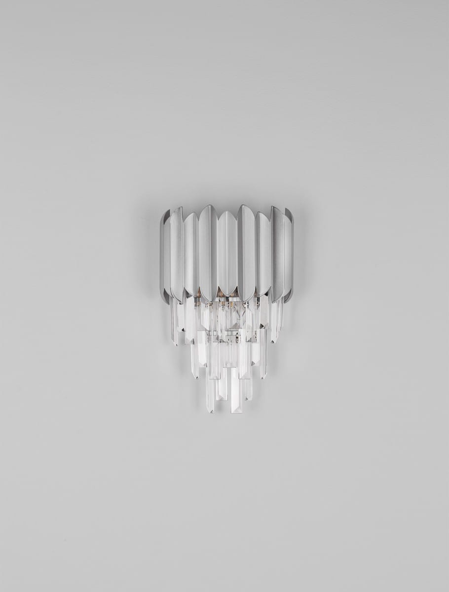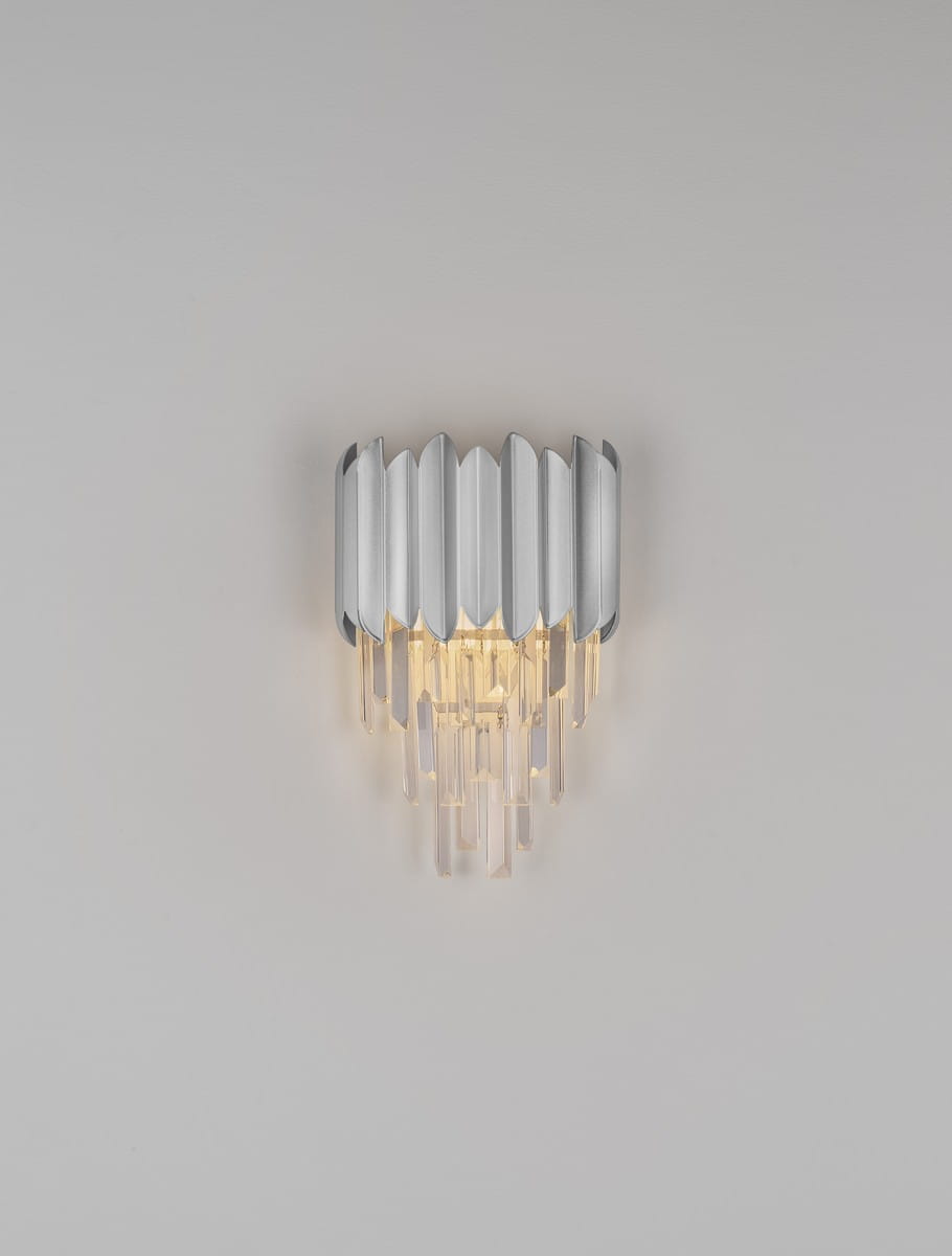 Pelavro to kinkiet ścienny, który zachwyca dopracowanym detalem i szlachetnym połączeniem materiałów. Srebrna, metalowa konstrukcja w zestawieniu z połyskującymi kryształowymi elementami tworzy kompozycję, która przyciąga wzrok i nadaje wnętrzu wyjątkowego charakteru. Subtelna gra światła wśród kryształów buduje atmosferę elegancji i spokoju, jednocześnie stanowiąc ozdobę samą w sobie.