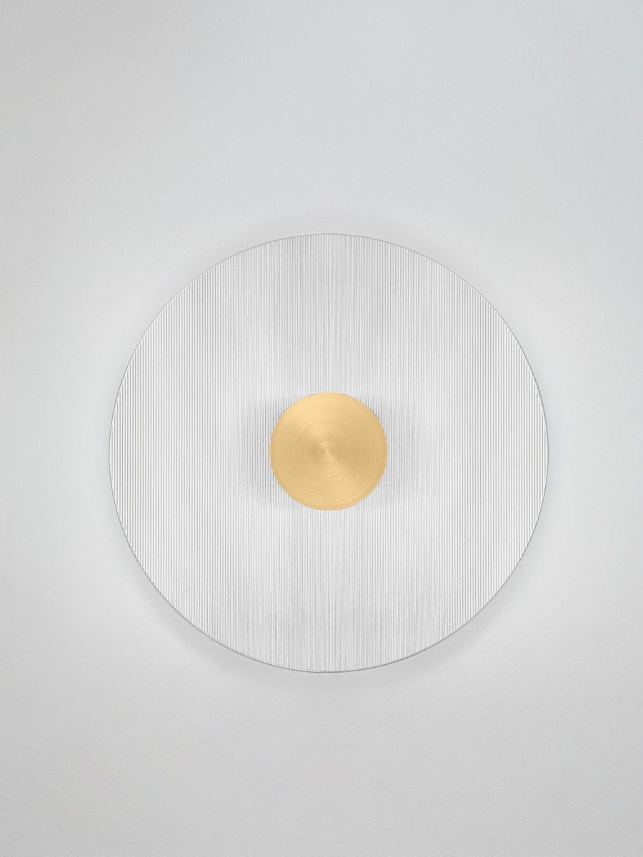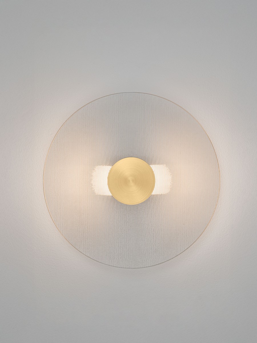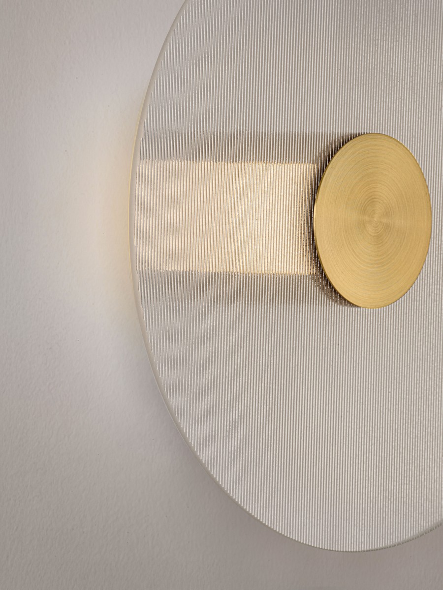 Kinkiet Tacoro o zwiększonej średnicy 30 cm od marki Nova Luce to propozycja, która doskonale łączy biżuteryjny urok z minimalistyczną lekkością. Konstrukcja oprawy opiera się na okrągłej, transparentnej tarczy z ryflowanego szkła, na której tle wyeksponowano centralny element maskujący. Ten gładki, metalowy detal wykończony w szlachetnym, mosiężnym złocie przyciąga wzrok i nadaje całości niezwykle wyrafinowany, elegancki wyraz.