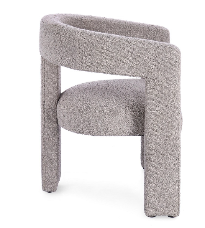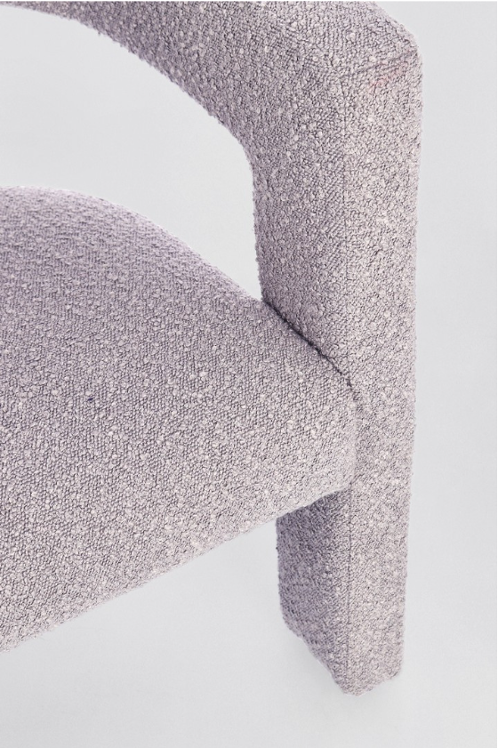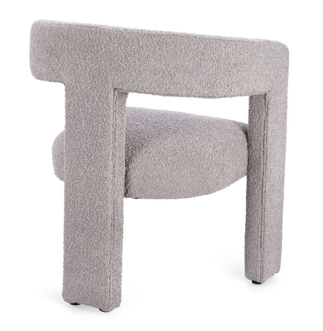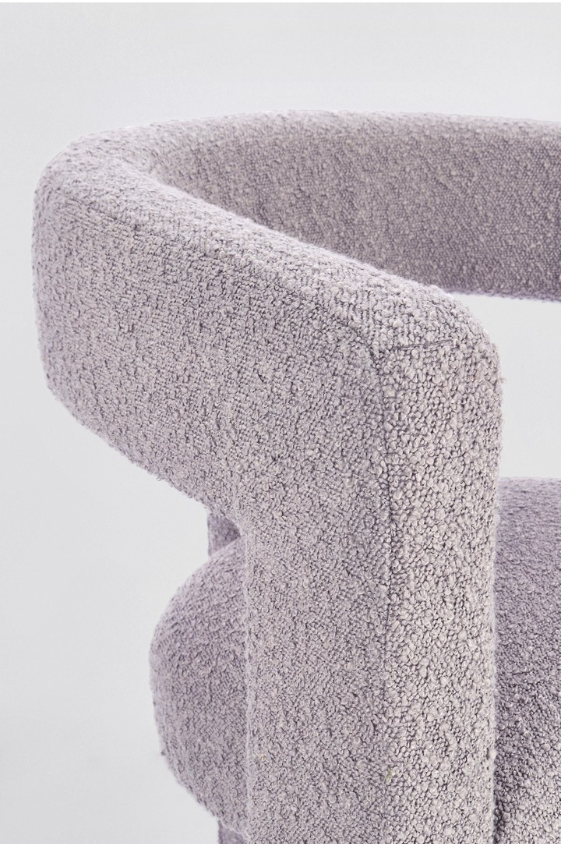 Konstrukcja typu "total look" oznacza, że każdy element mebla – łącznie z solidnymi nogami – został pokryty tą samą, efektowną tkaniną o strukturze baranka. Materiał w kolorze perłowej szarości jest nie tylko przyjemny w dotyku, ale także niezwykle praktyczny i łatwy do skomponowania z inną kolorystyką pomieszczenia. Pod warstwą tapicerki kryje się pianka o wysokiej gęstości (twardsza na siedzisku dla zachowania kształtu, bardziej miękka na oparciu), co gwarantuje komfort nawet podczas długich spotkań przy stole.