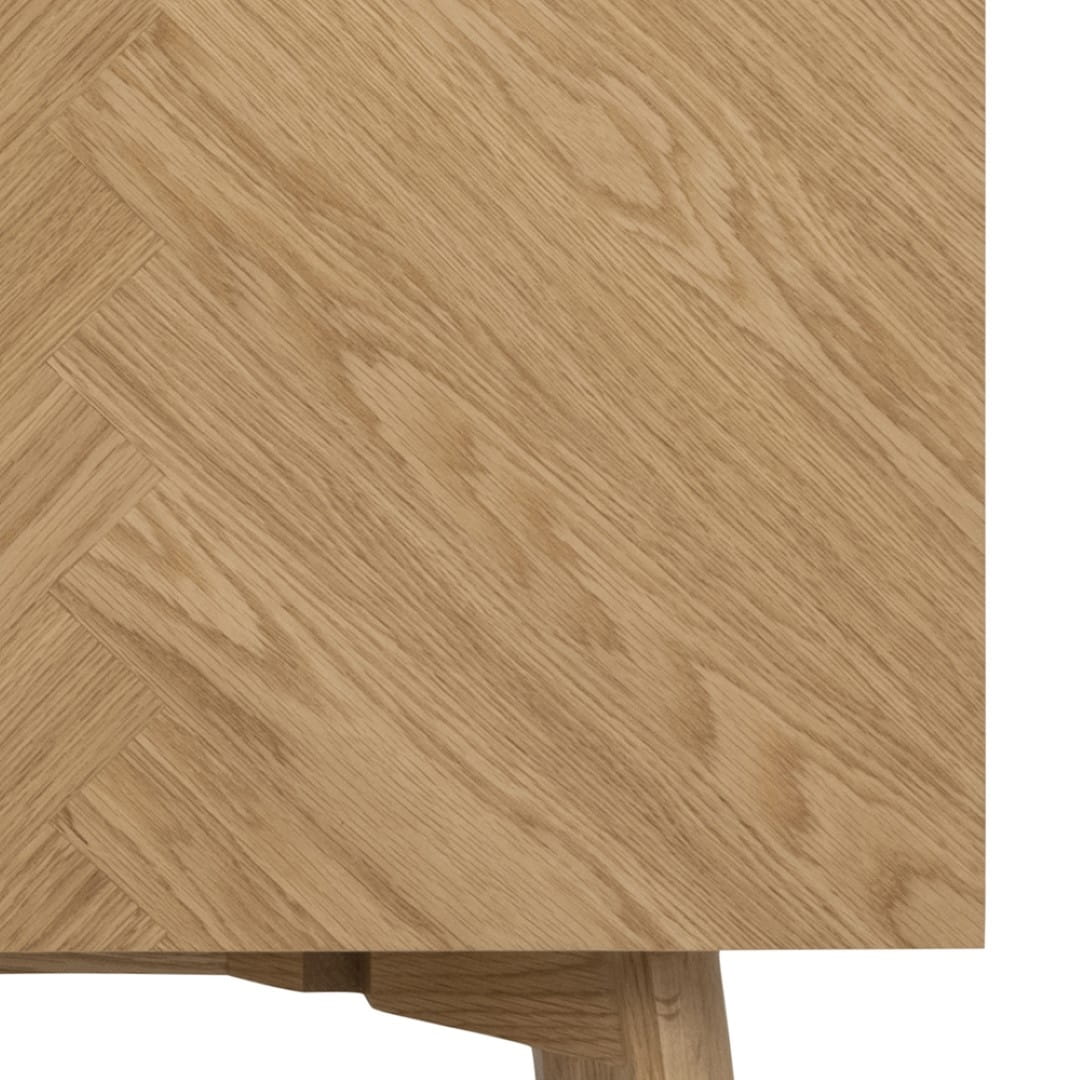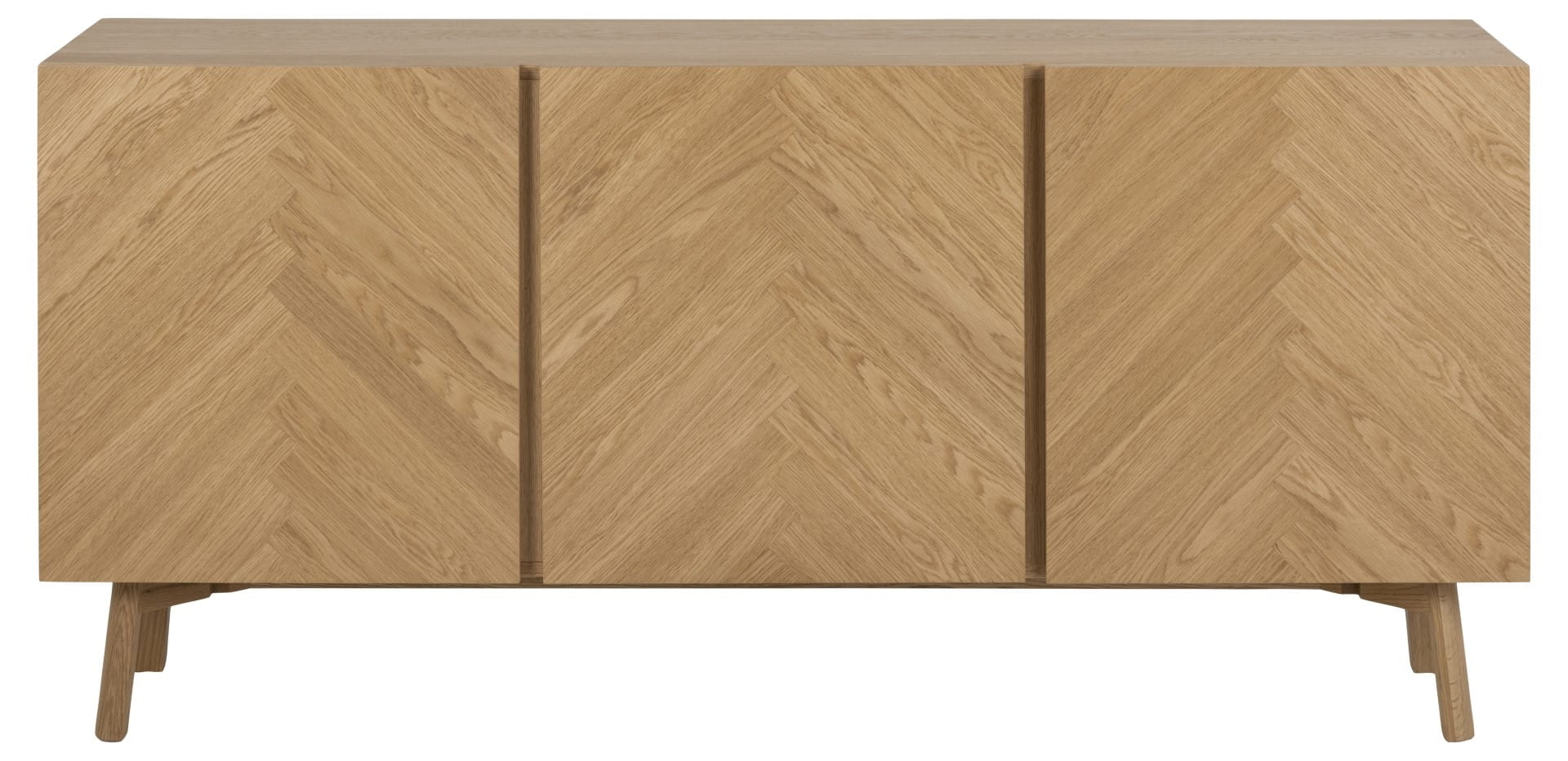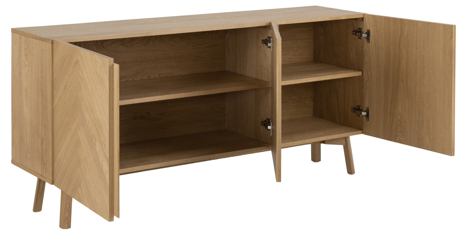 Komoda Galway to skandynawskie wzornictwo w nowoczesnym wydaniu. Wykonana z płyty meblowej, która została wykończona dębowym olejowanym fornirem. Komodę wyróżniają jej ciekawe fronty szafek. Fornir ułożony w jodełkę dodaje meblowi wyrazu i oryginalnego wyglądu. Całość podkreślają cztery nogi z litego, olejowanego drewna dębu, które zamontowane są pod lekkim kątem. Komoda posiada pojemne szafki, w których z łatwością będziesz przechowywać różnego rodzaju akcesoria, podręczne rzeczy czy inne bibeloty.