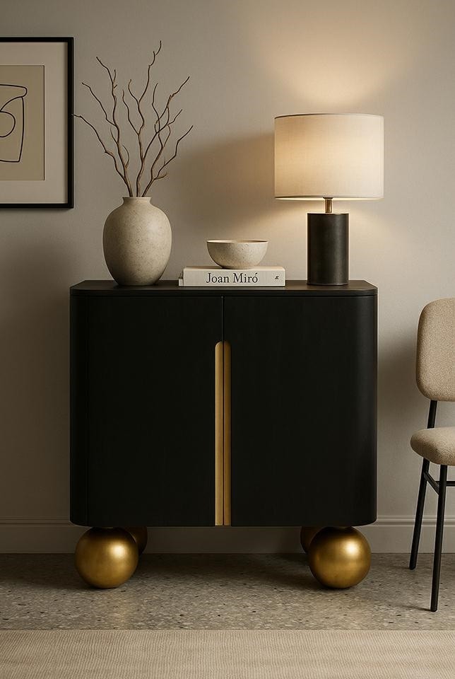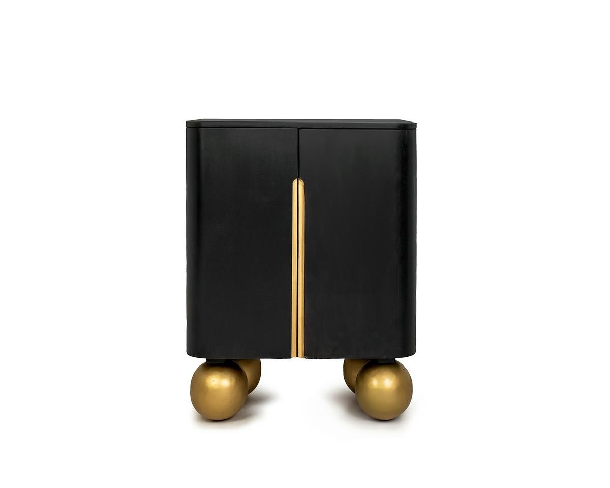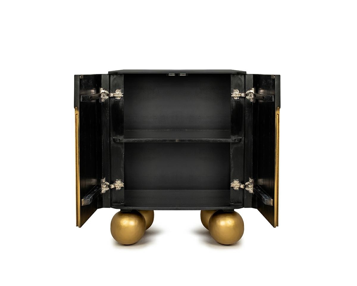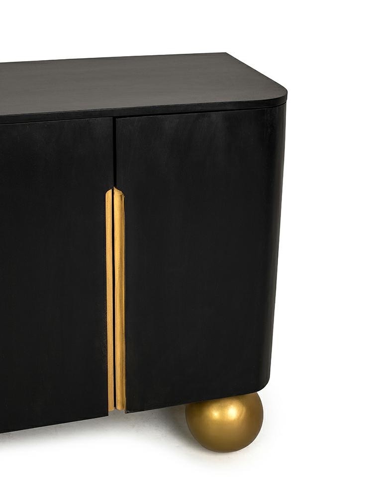 Wykonana z litego drewna mango – naturalnego, wytrzymałego surowca o pięknym, głębokim usłojeniu – przyciąga uwagę wysoką jakością wykonania. Gładka, czarna powierzchnia w matowym wykończeniu tworzy harmonijny kontrast z uchwytami i kulistymi nogami w eleganckim, satynowym odcieniu złota. To połączenie dodaje wnętrzu subtelnego luksusu i nowoczesnej lekkości.