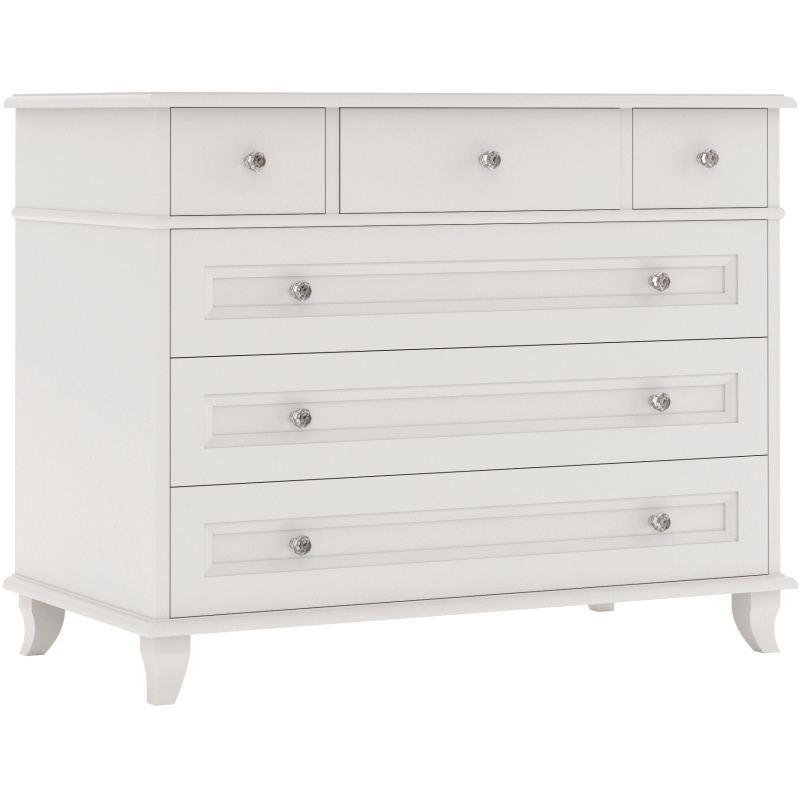 Sześć szuflad, cichy domyk ''soft close'' – piękna i funkcjonalna komoda w połączeniu stylu glamour oraz klasycznego została zaprojektowana z myślą o rodzicach, którzy potrzebują dobrej i sprawnej organizacji, szczególnie podczas pierwszych dni życia maluszka.