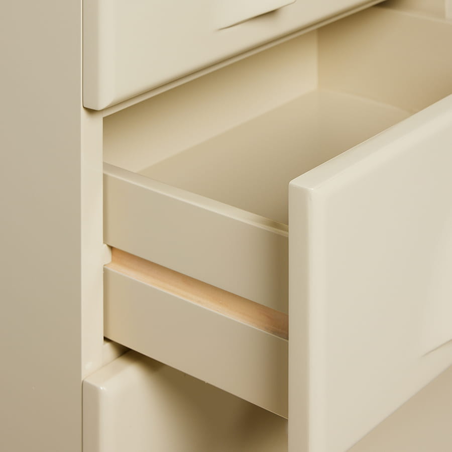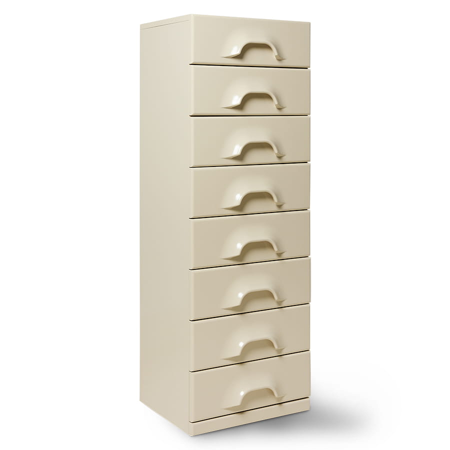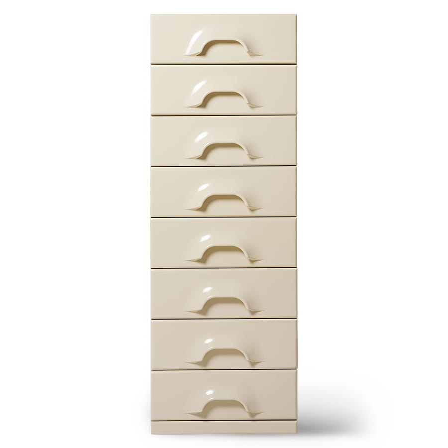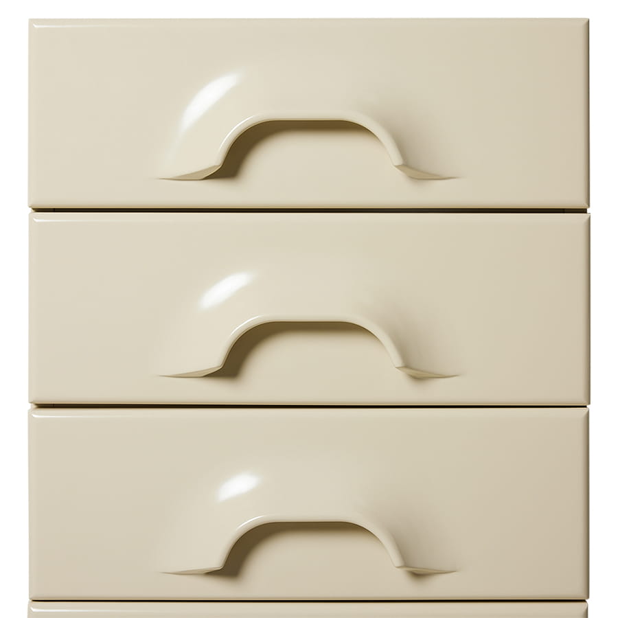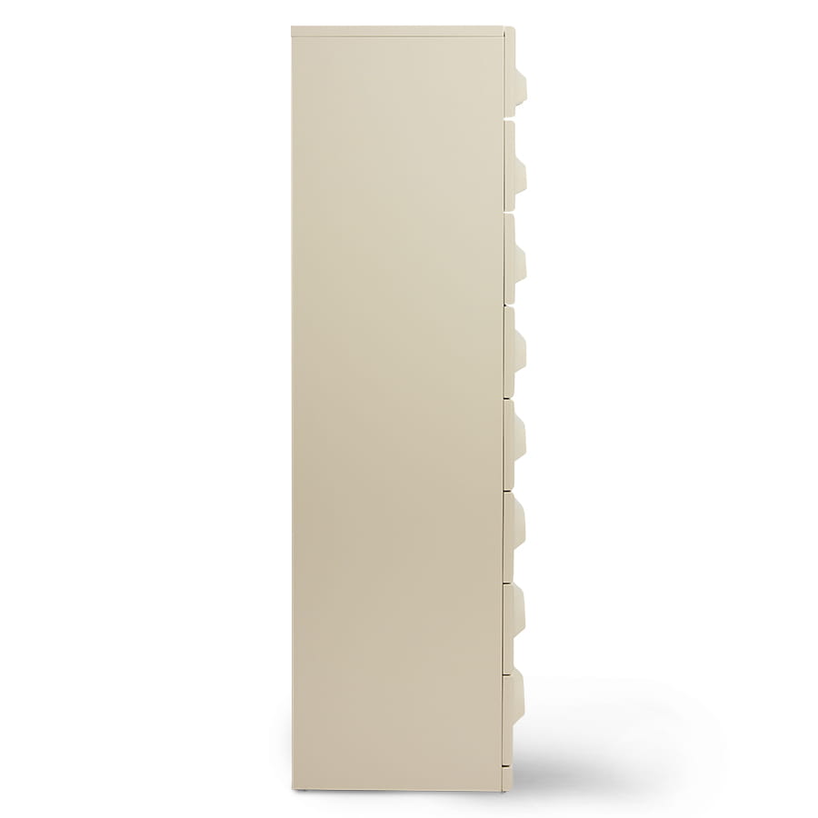Kremowa komoda ma ponad metr wysokości i składa się z ośmiu szuflad - pomoże zorganizować i uporządkować przestrzeń.