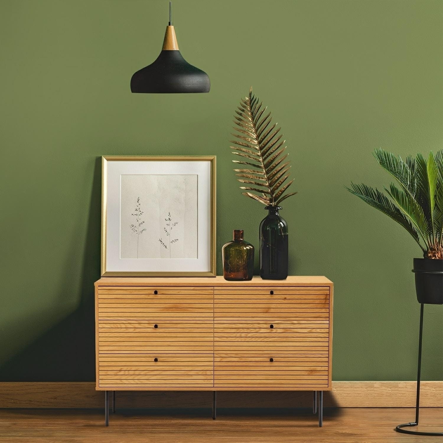 Podstawę wykonano z metalu lakierowanego proszkowo na czarno z matowym wykończeniem. Klasyczna czerń tworzy ciekawy kontrast z pozostałymi elementami komody, przełamując stonowaną i jasną kolorystykę.