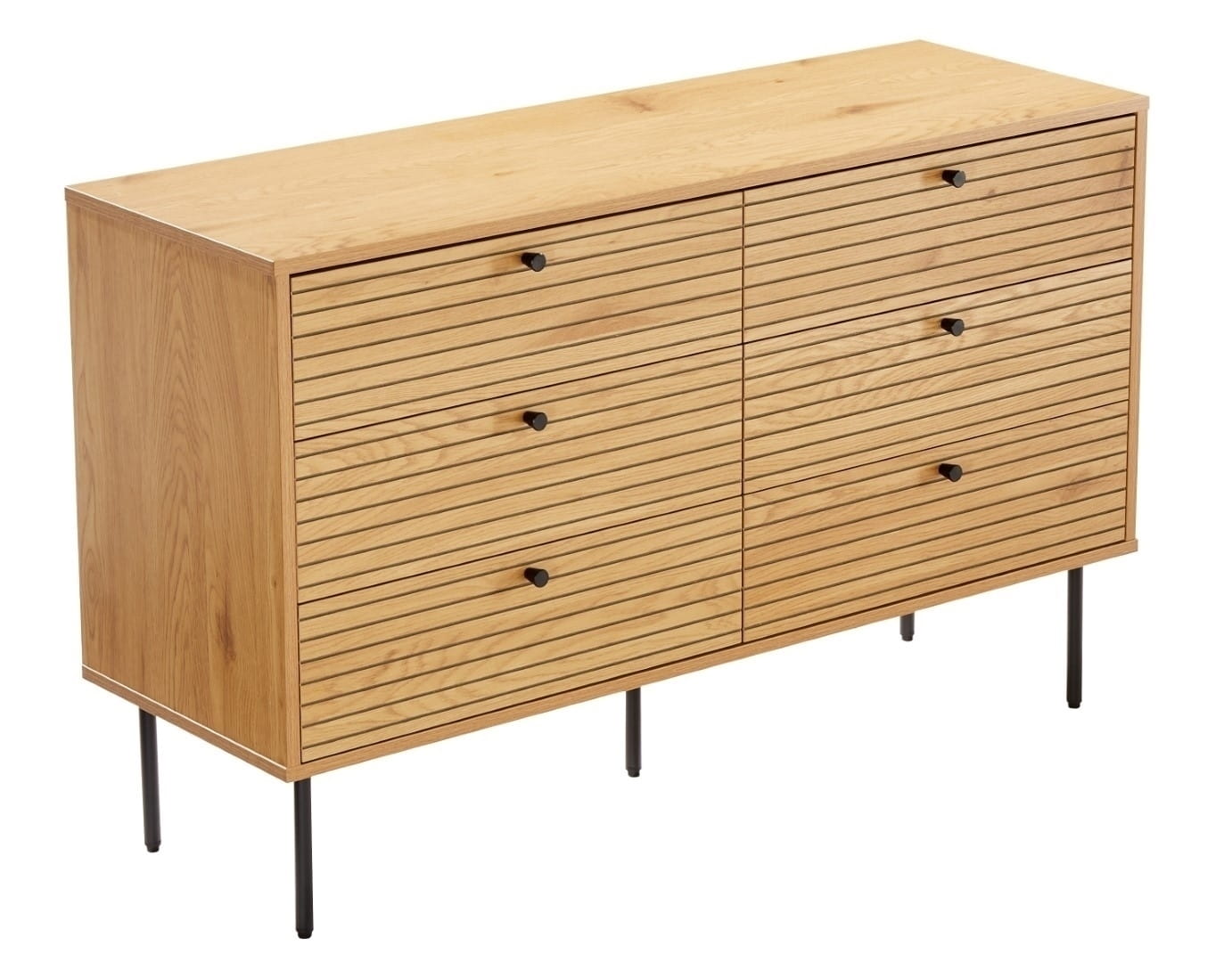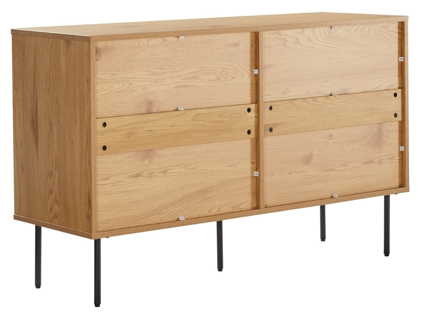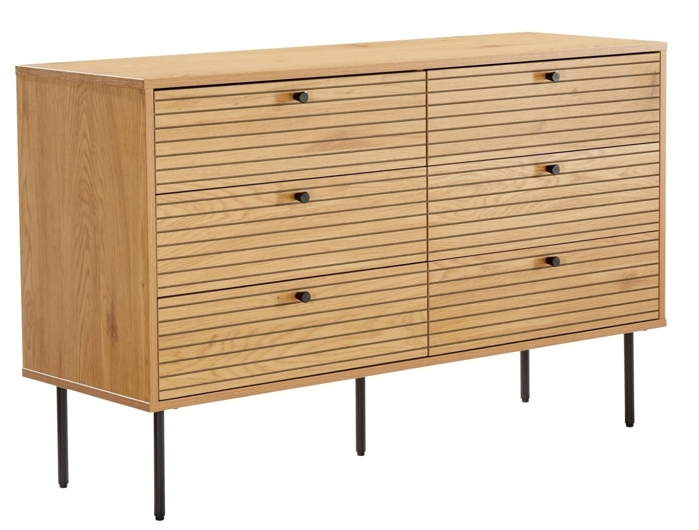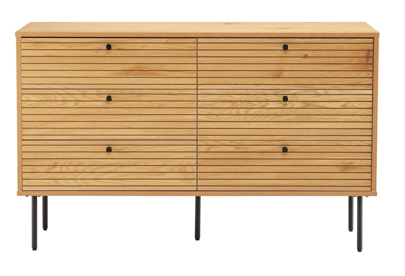 Fronty szuflad o ciekawym wyflowanym poziomo wzorze wyglądają jak lamele. Każda z szuflad wyposażona została w czarny, metalowy uchwyt. Minimalistyczne uchwyty ciekawie korespondują z czarną metalową podstawą komody. Jasny, ciepły odcień drewna doskonale współgra z naturalnymi barwami, takimi jak beże czy delikatne brązy, sprawiając, że komoda będzie idealnym wyborem do przytulnych, jasnych wnętrz. Mebel wymaga montażu.