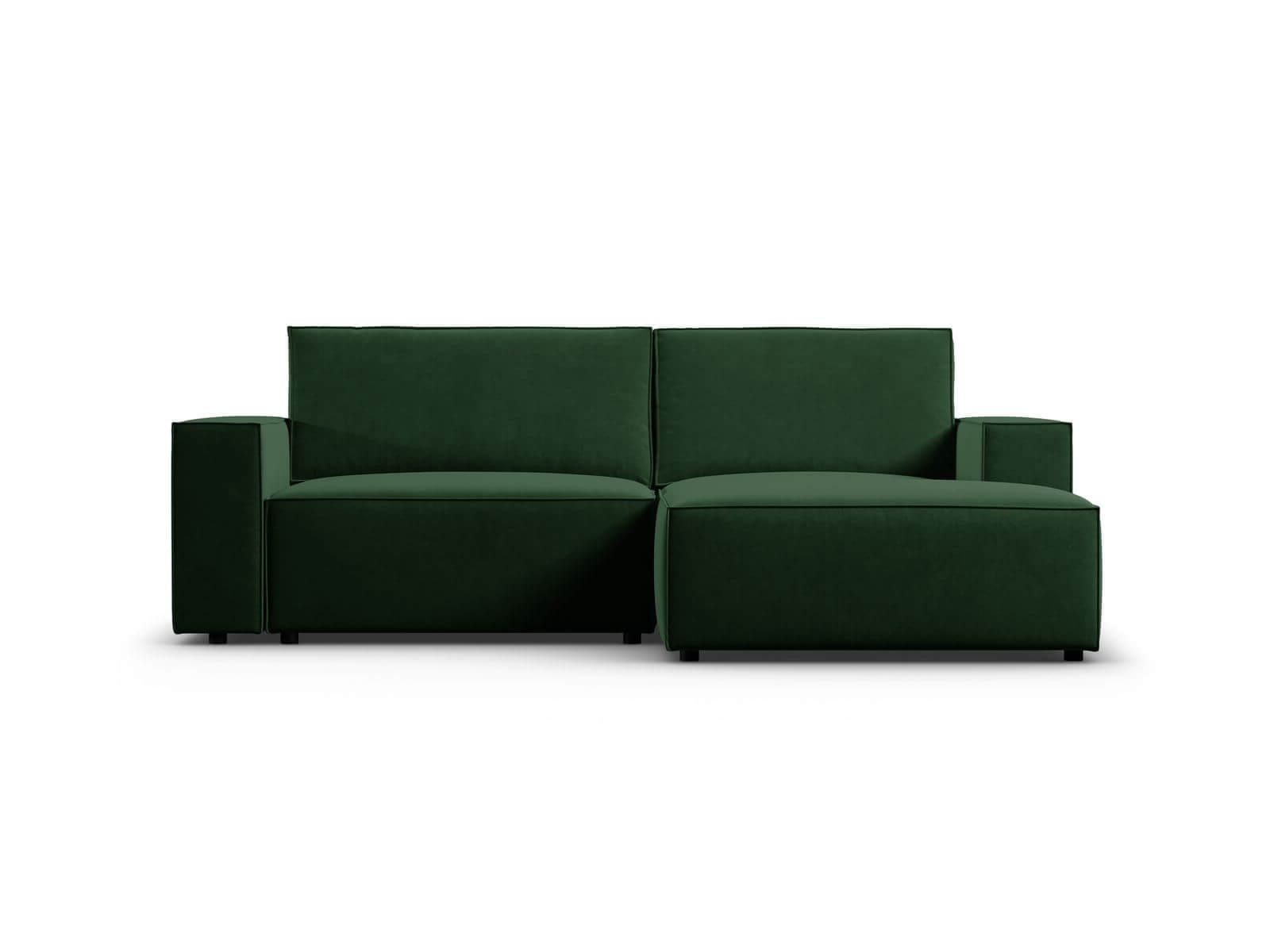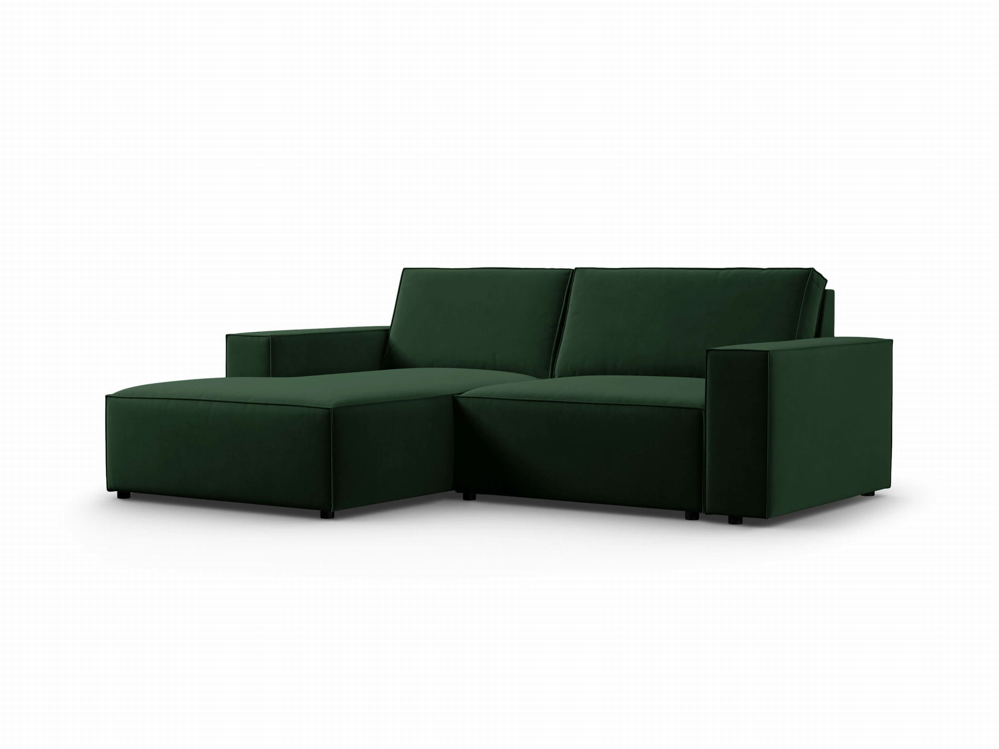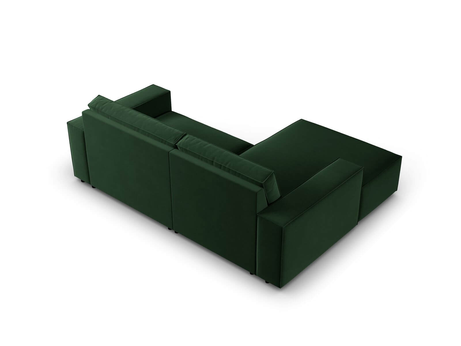 Geometryczna sofa narożna tapicerowana jest syntetyczną tkaniną imitującą aksamit - Bluvel 78. Delikatny połysk materiału sprawia, że jest on dobrym wyborem do eleganckich projektów wnętrz.