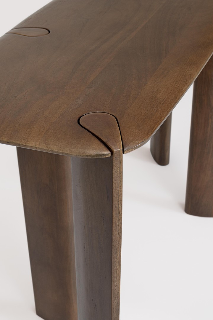Konsola STERLING to elegancki mebel wykonany z litego drewna mango, wykończony wodną bejcą podkreślającą naturalny rysunek słojów. Jej prosty, a zarazem dopracowany design nadaje wnętrzu charakteru i nowoczesnej lekkości.