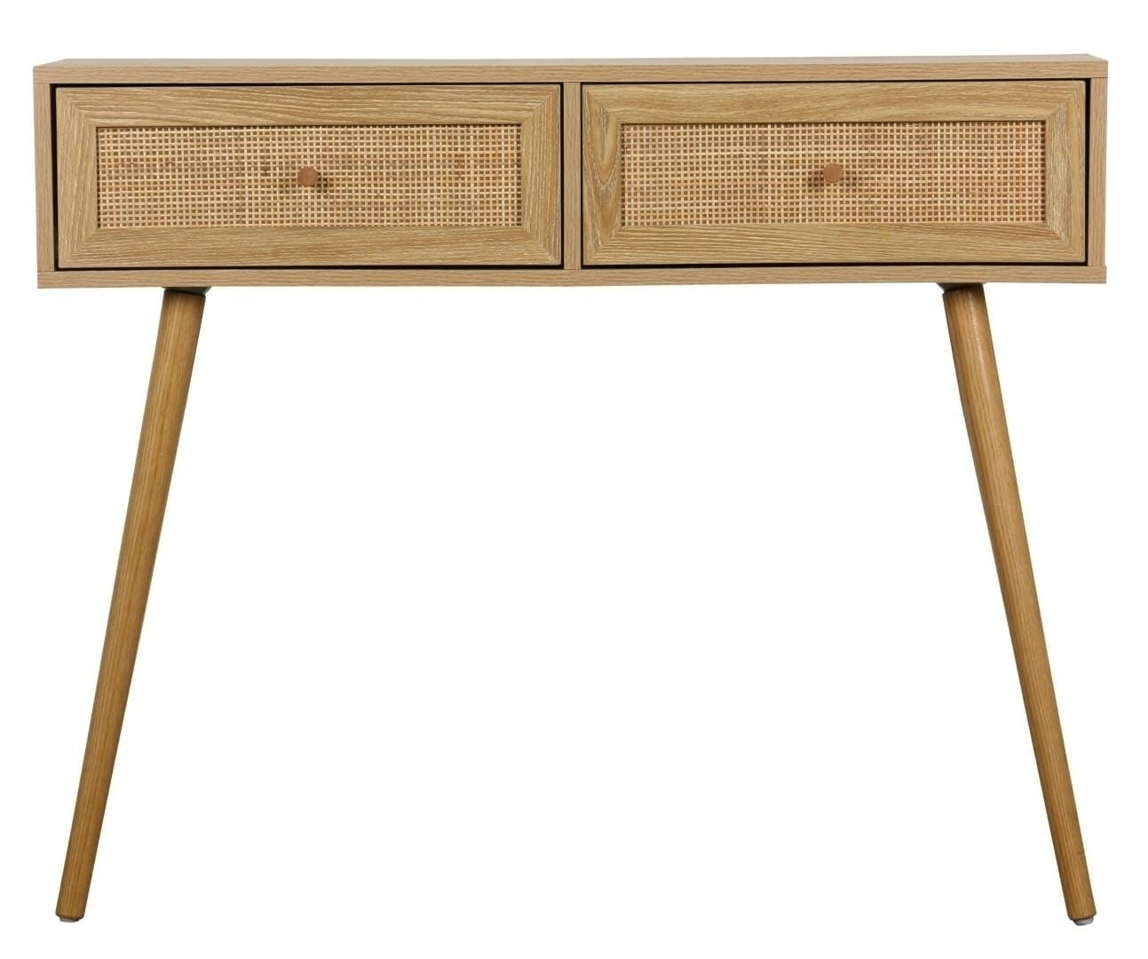Konsola z 2 szufladami z serii Ballo to stylowy mebel w nowoczesnym stylu boho, który łączy prostotę formy z naturalnym charakterem. Jej minimalistyczna konstrukcja, ozdobiona elementami z rattanu i litego drewna, doskonale pasuje do wnętrz utrzymanych w naturalnej kolorystyce.