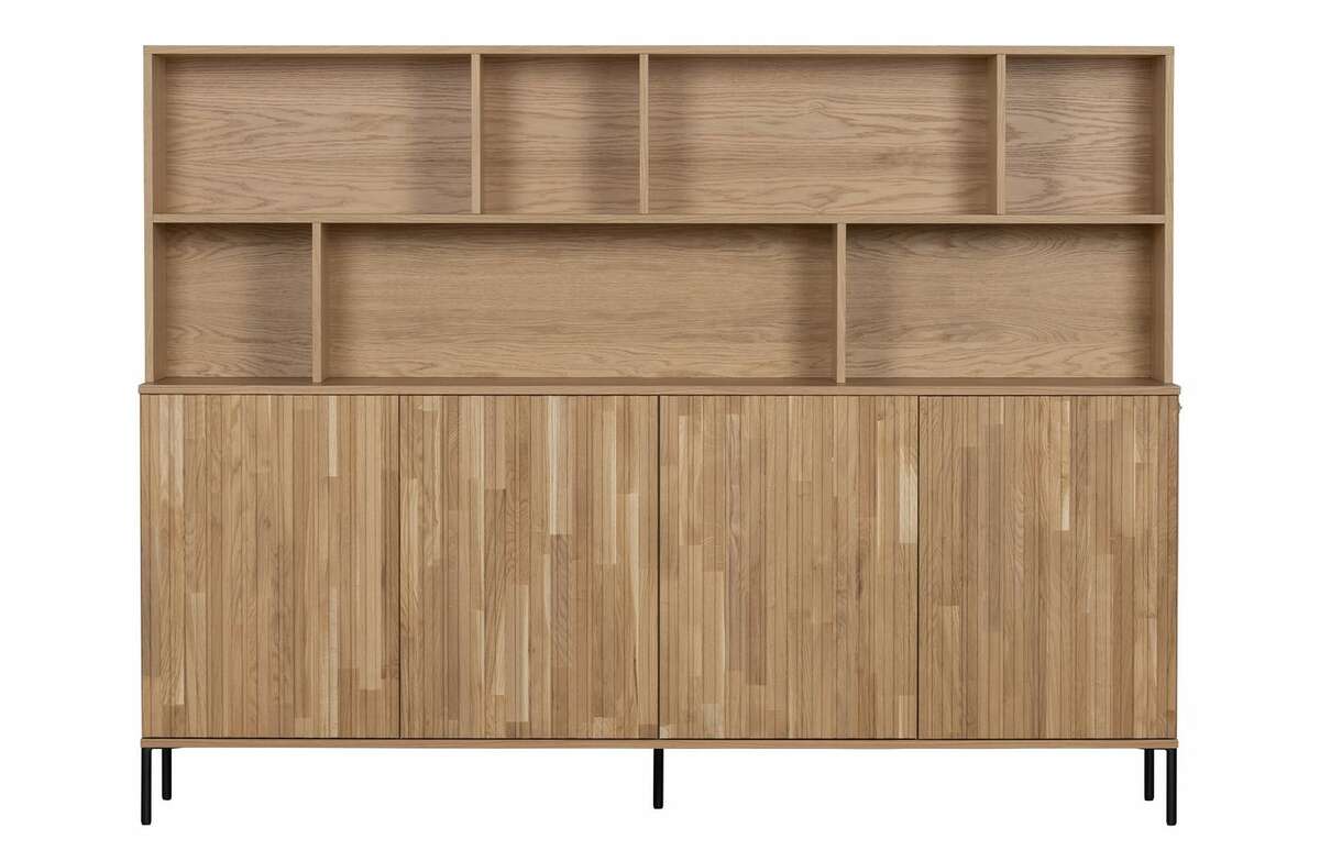 Szykowny kredens Gravure Dąb Naturalny pochodzi z kolekcji holenderskiej marki wnętrzarskiej WOOOD. Wykonany jest z forniru dębowego z przezroczystą bejcą. Całość jest solidna, trwała i ma bezpretensjonalny urok, który wprowadza do wnętrza wyrafinowany klimat. Designerski motyw lameli dodaje wykwintnego smaku. Doskonale rozplanowano przestrzeń do przechowywania - nie brakuje tam półek, na których można wyeksponować pamiątkowe przedmioty, zdjęcia, gustowną zastawę, piękne kieliszki, czy zabytkową ceramikę. Wspaniale będzie służyć również jako regał na książki. Dolna część kredensu jest zasłonięta drzwiczkami, i tam możesz przechować to czego nie chcesz akurat prezentować.