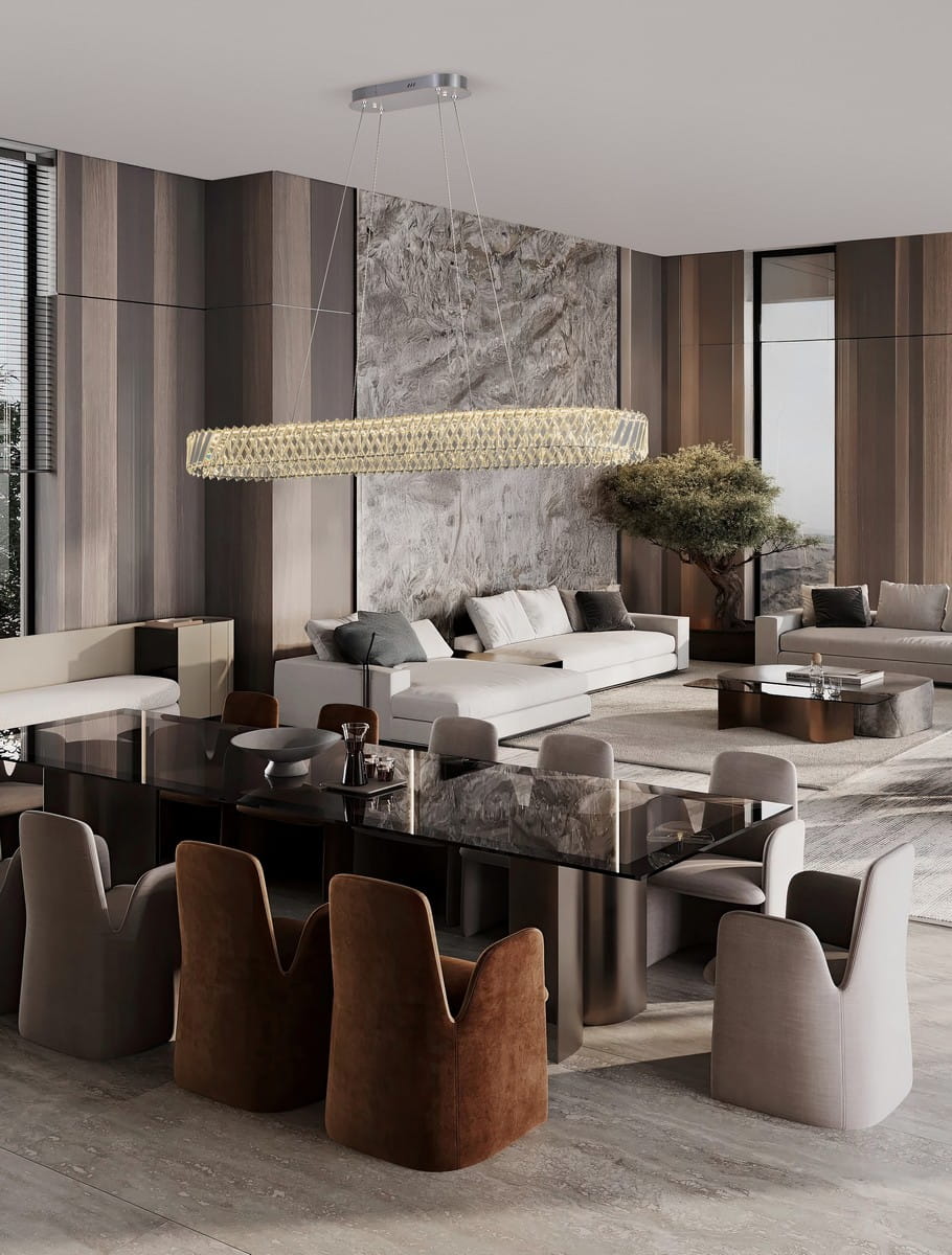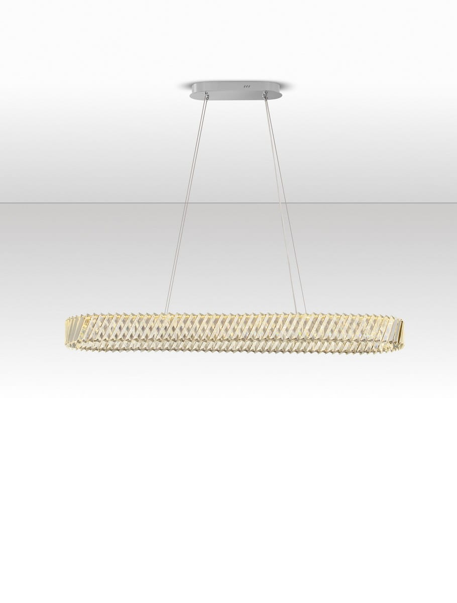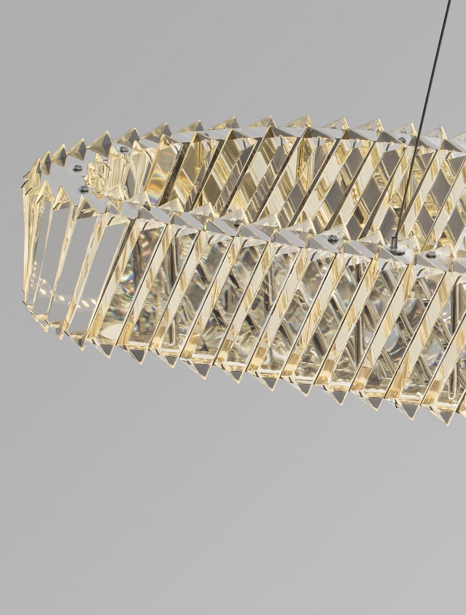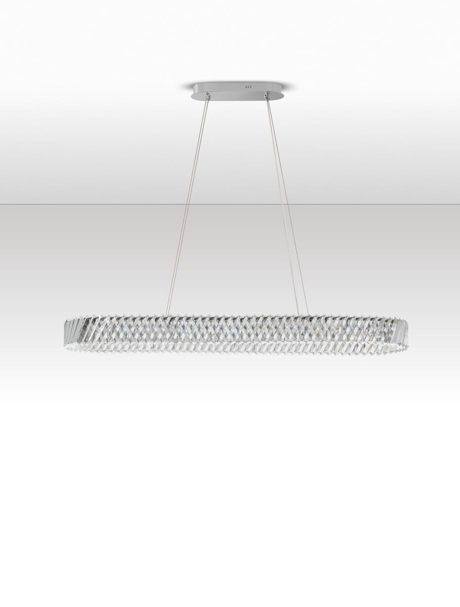 Canlira Oval to nowoczesna interpretacja klasycznego kryształowego żyrandola, która zachwyca smukłą, wydłużoną sylwetką. Jej owalny kształt, zbudowany z precyzyjnie szlifowanych kryształów, tworzy spektakularną grę światła i refleksów, doskonale wpisując się w przestronne wnętrza o wysokim standardzie wykończenia.