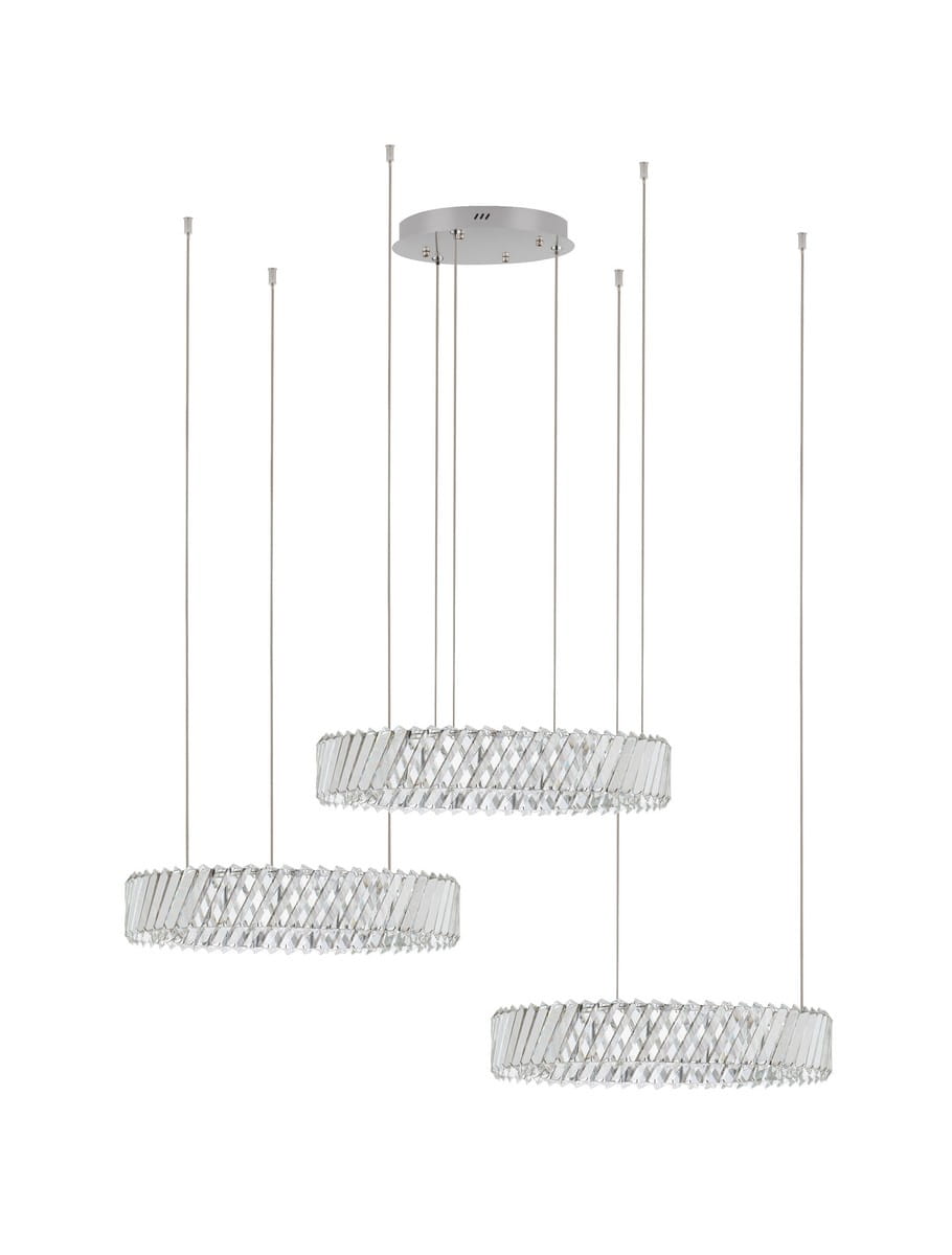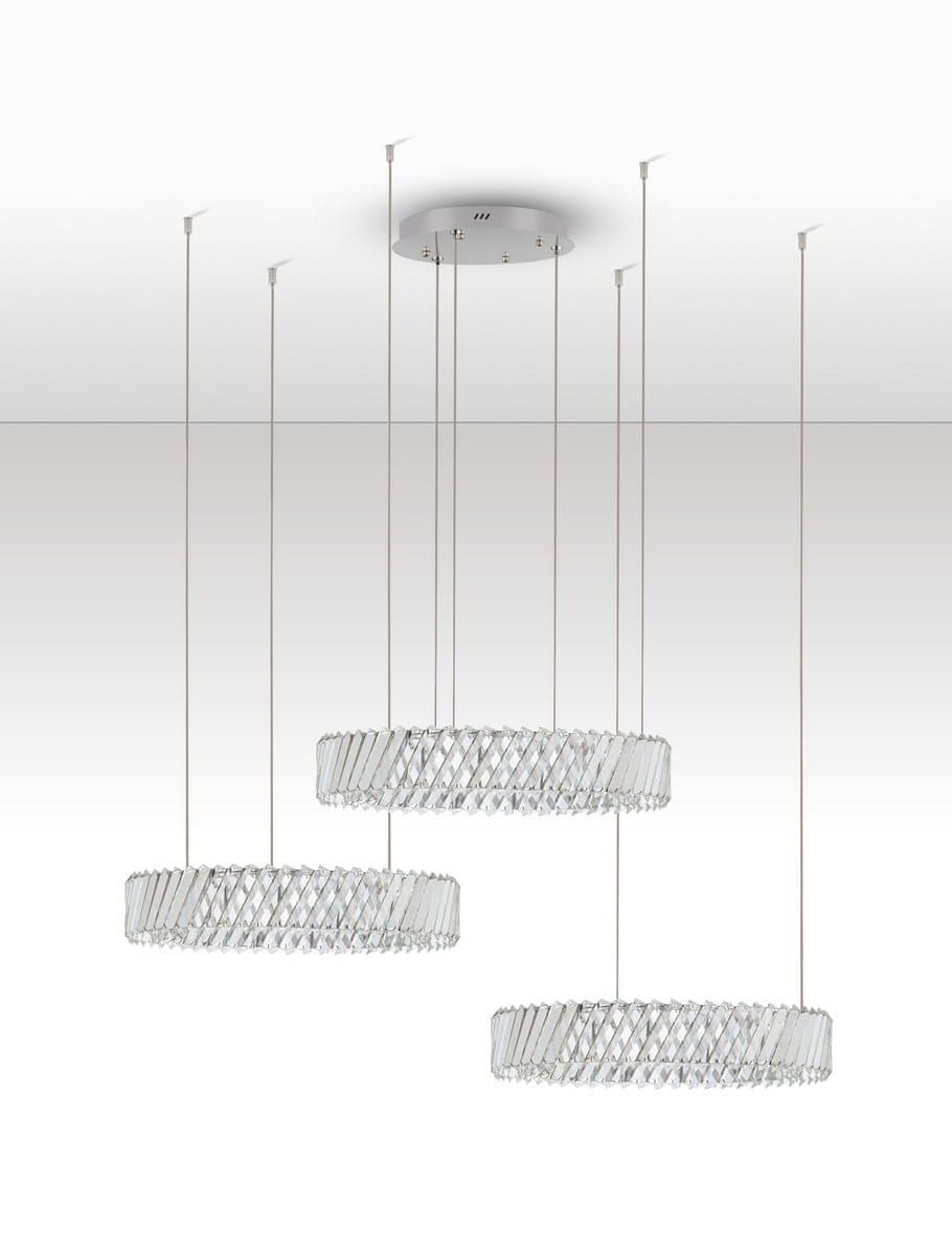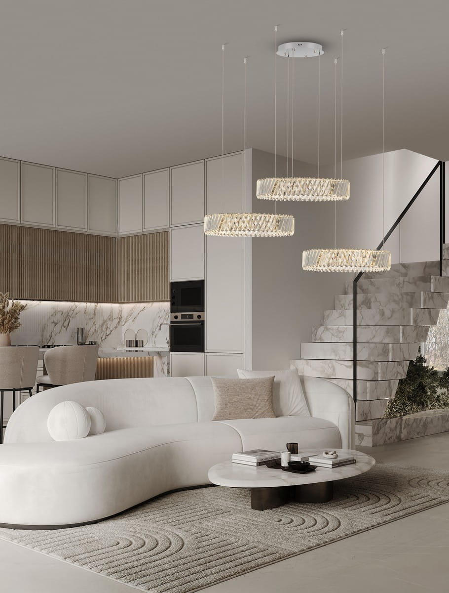 Każdy z elementów został zaprojektowany z dbałością o detal – transparentna geometria kryształów połączona z subtelną metalową konstrukcją daje efekt rzeźby zawieszonej w przestrzeni. Canlira Trio doskonale odnajduje się w wysokich wnętrzach – salonach, holach, klatkach schodowych czy przestrzeniach komercyjnych, gdzie pełni rolę nie tylko źródła światła, ale też spektakularnej instalacji artystycznej.