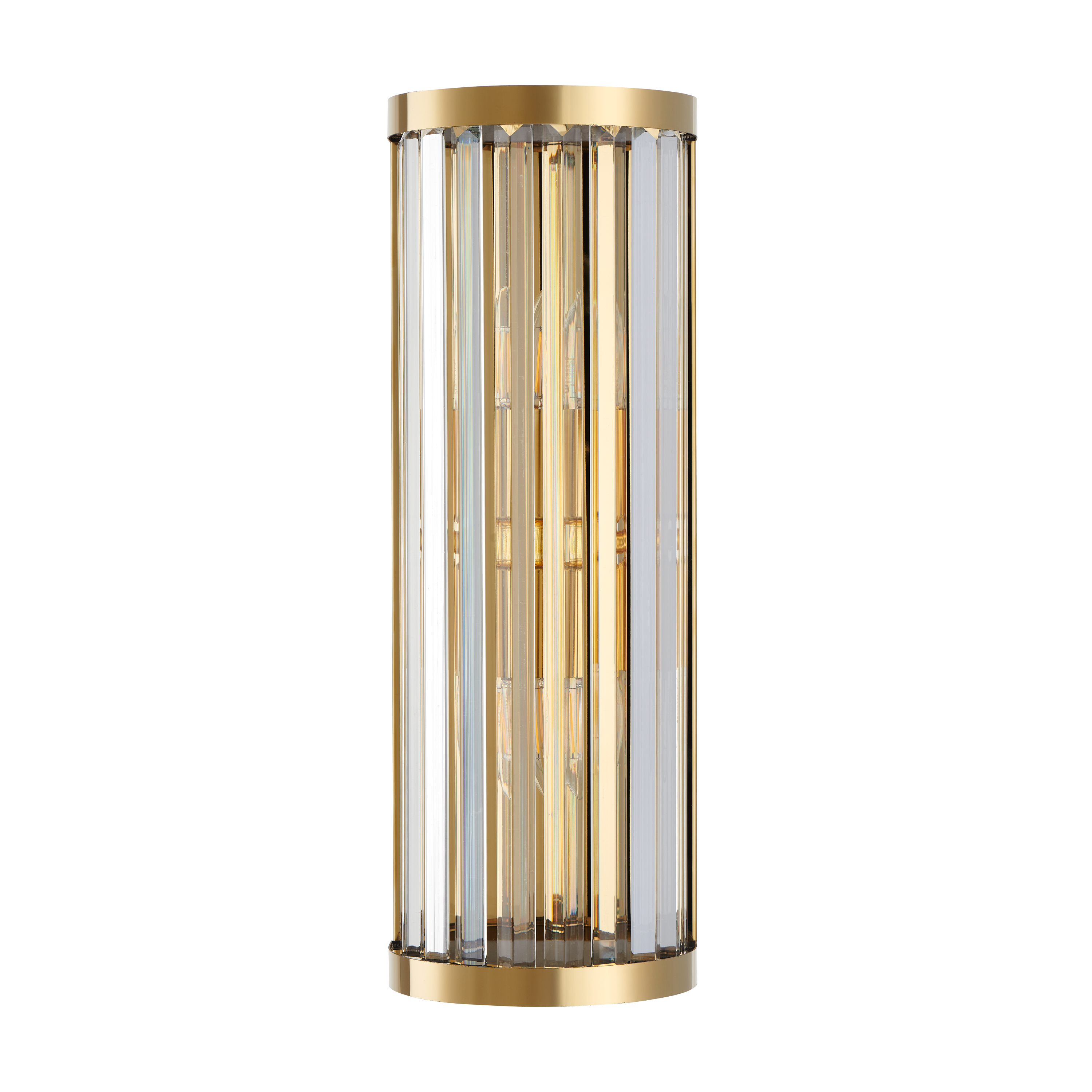 Górna i dolna część lampy wykonane są z metalu w ciepłym, złotym odcieniu, co nadaje całej konstrukcji luksusowego charakteru. Centralna część kinkietu zbudowana jest z pionowych, przezroczystych prętów z kryształowego szkła, które efektownie załamują i rozpraszają światło.