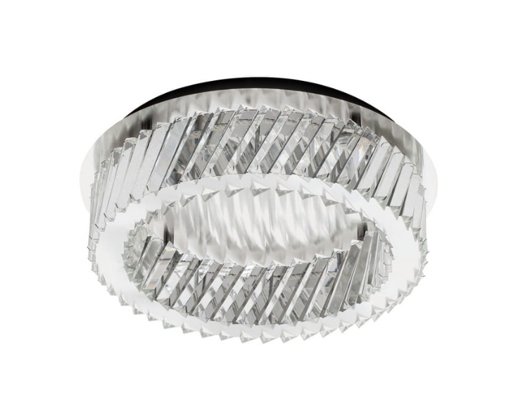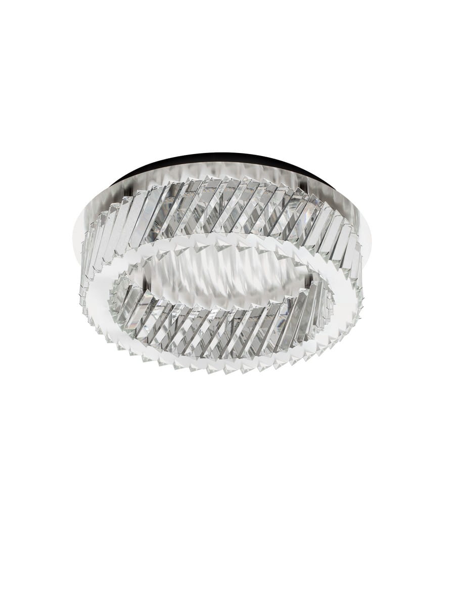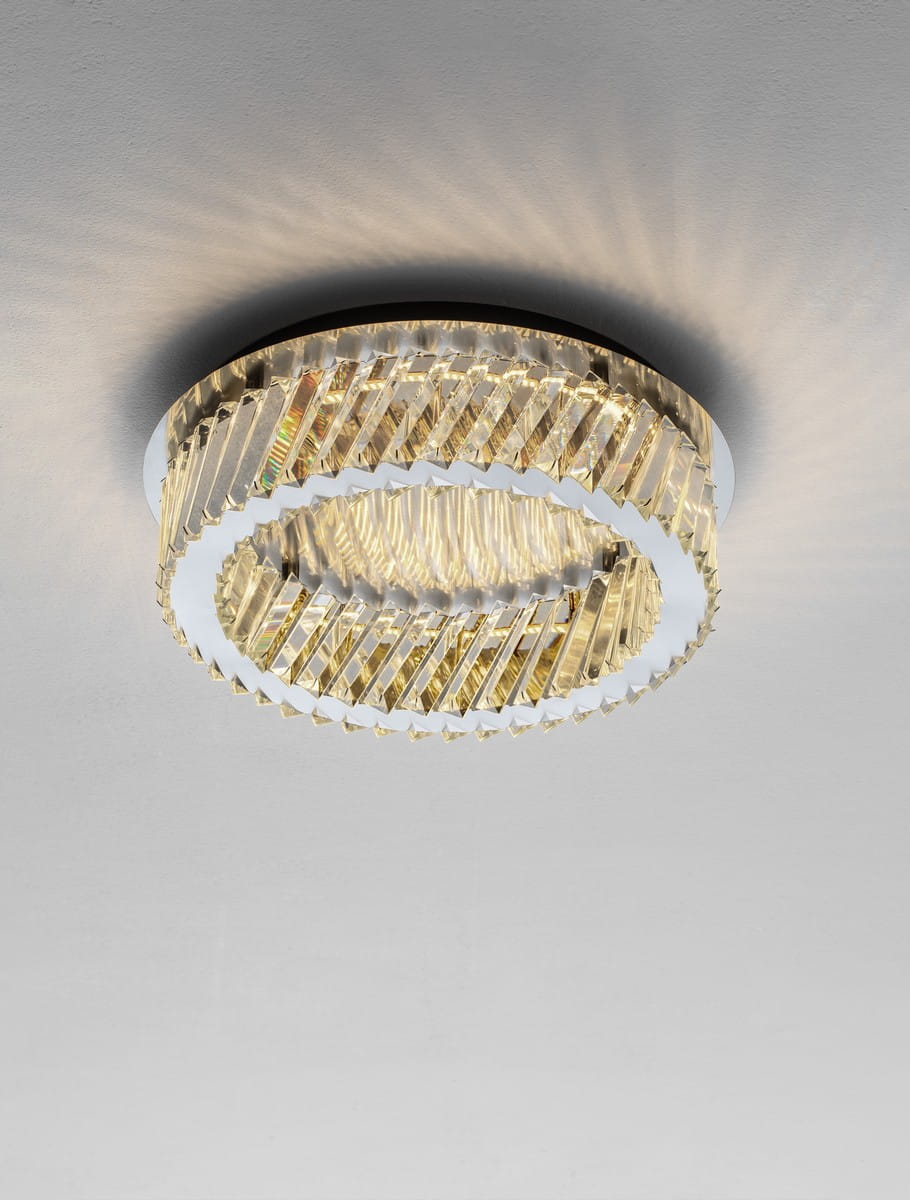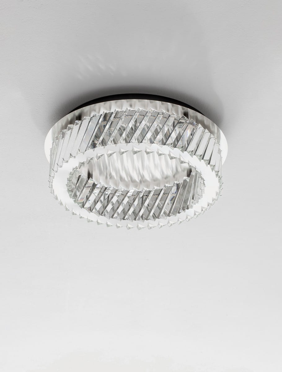 Koncentryczny układ dwóch pierścieni buduje wrażenie głębi i ruchu, a załamujące się światło na szlifowanych powierzchniach kryształu tworzy niezwykły spektakl refleksów na suficie i ścianach. To idealne rozwiązanie dla wnętrz, w których niemożliwe jest zastosowanie wiszącej lampy, ale nie chcemy rezygnować z eleganckiego, biżuteryjnego akcentu.