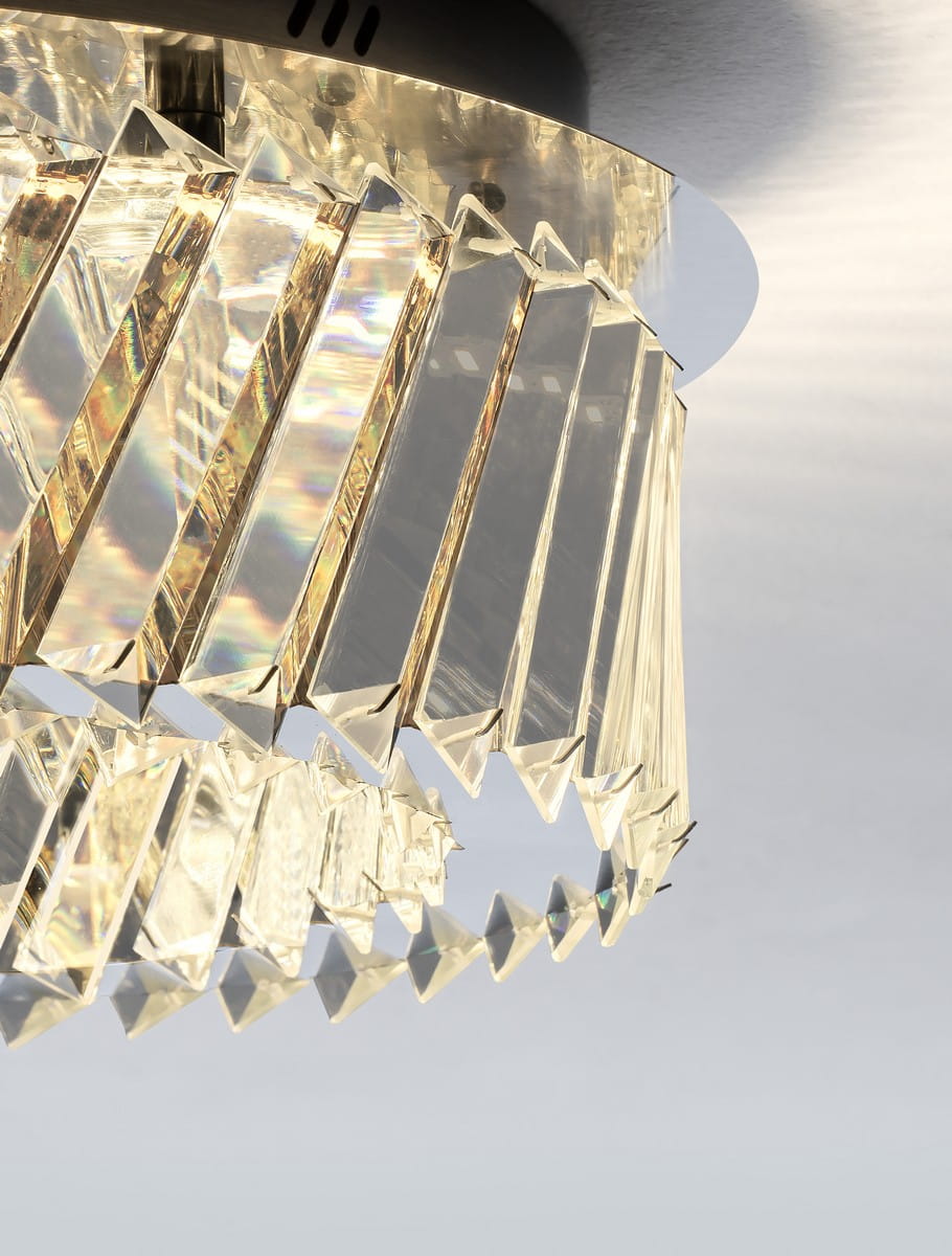 Canlira w formie plafonu to wyrafinowane oświetlenie sufitowe, które zachwyca precyzją wykonania i efektownym wzornictwem. Jego kompaktowa forma nie rezygnuje z luksusowego charakteru – korona z kryształowych segmentów osadzonych w metalowej ramie tworzy subtelną, ale niezwykle dekoracyjną iluminację.