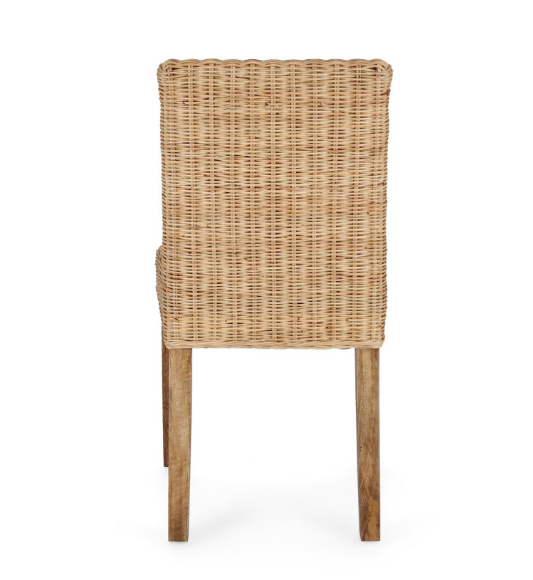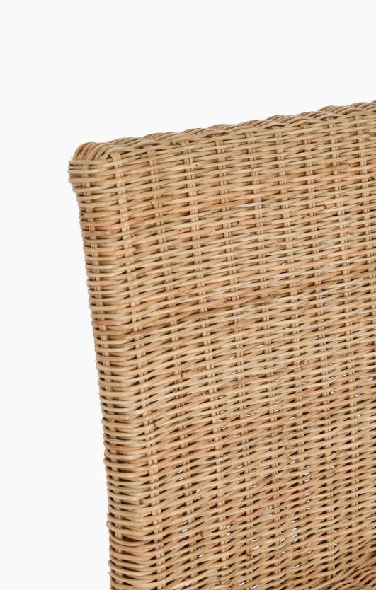 Siedzisko oraz wysokie oparcie krzesła zdobi gęsty, kunsztowny splot z naturalnego rattanu. Rattanowa plecionka nie tylko nadaje meblowi wizualnej lekkości, ale zapewnia również delikatną elastyczność, co przekłada się na wyjątkowy komfort podczas siedzenia. Dzięki pionowemu układowi splotu na oparciu, krzesło zyskuje smukłą i elegancką sylwetkę, która doskonale wpisuje się w aranżacje w stylu boho, ekologicznym czy kolonialnym.