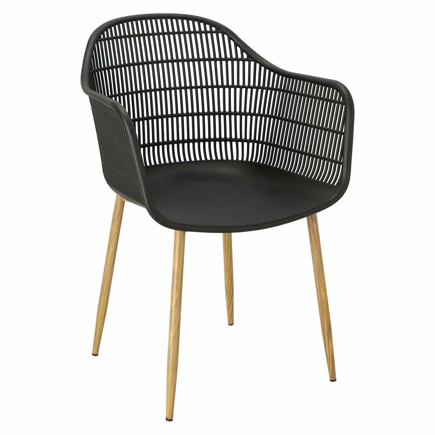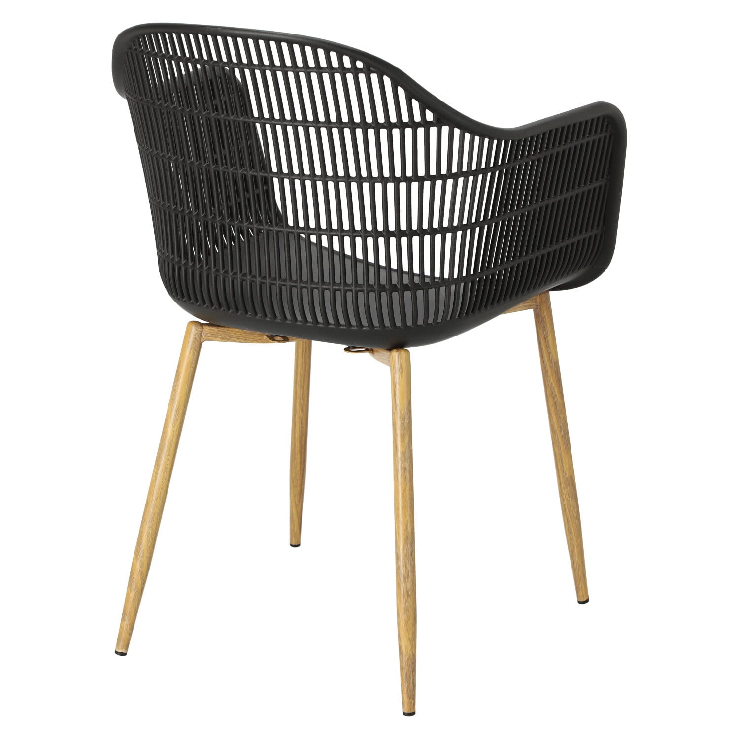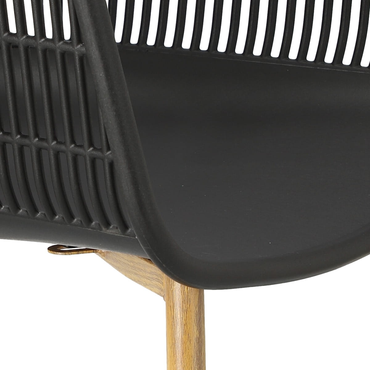 Wyjątkowe siedzisko, podłokietniki i oparcie przypominają siatkę. Podstawa krzesła wykonana została z metalu pokrytego okleiną o strukurze drewna. Wykorzystana w podstawie okleina charakteryzuje się półmatowym wykończeniem.