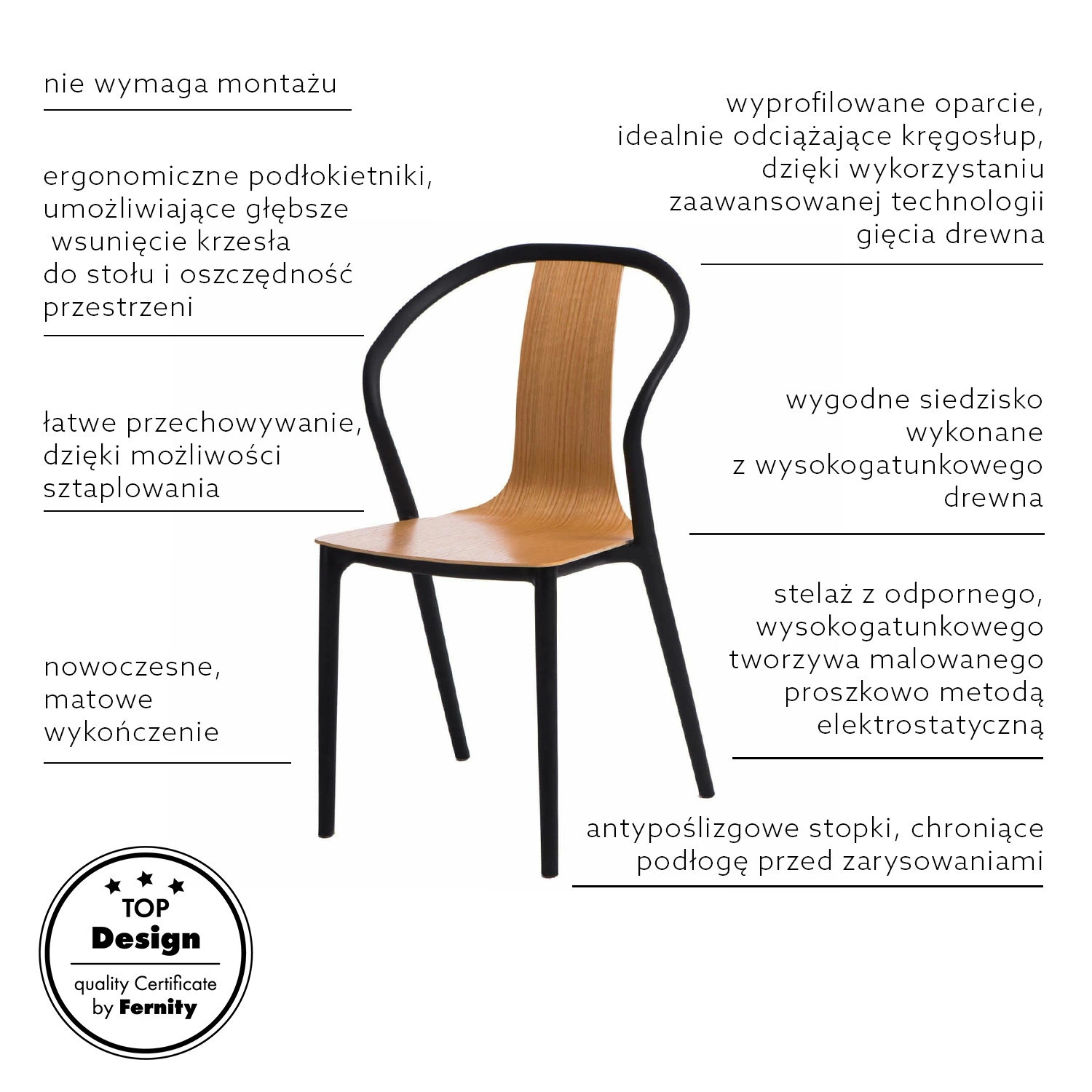 Podstawa krzesła Bella została wykonana z polipropylenu - wytrzymałego i nowoczesnego surowca, które jest dodatkowo bardzo łatwe w czyszczeniu. Do wytworzenia wygodnego siedziska wykorzystano sklejkę w szlachetnym naturalnym kolorze. Oparcie i siedzenie mają piękną, elegancką linię i zapewniają wysoki komfort użytkowania, który dodatkowo podnosi obecność podłokietników. Bella będzie dobrze wyglądać w klasycznej jadalni oraz urządzonym w zgodzie z prawidłami skandynawskiego stylu salonie. Jego trwałość i ponadczasowy wygląd docenią ci, którym zależy na dodatkach nie poddającym się chwilowym modom.