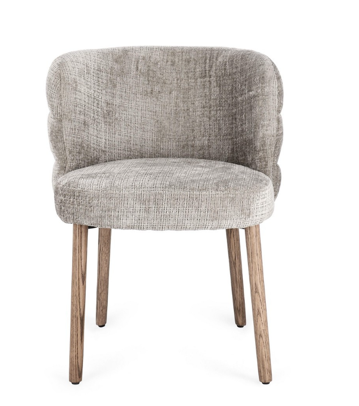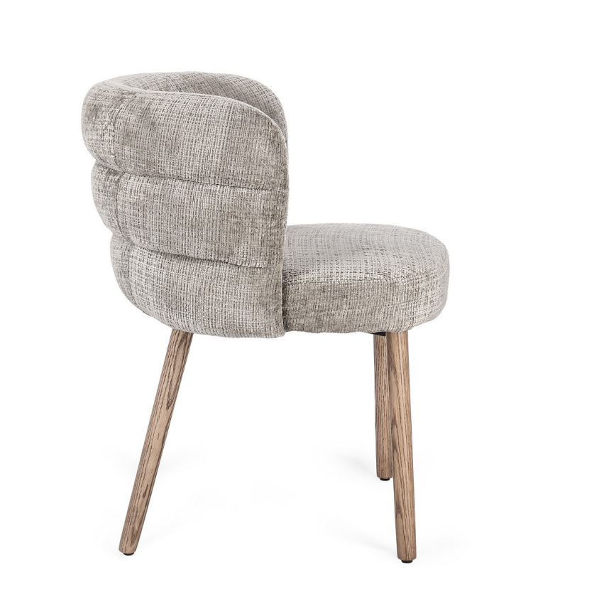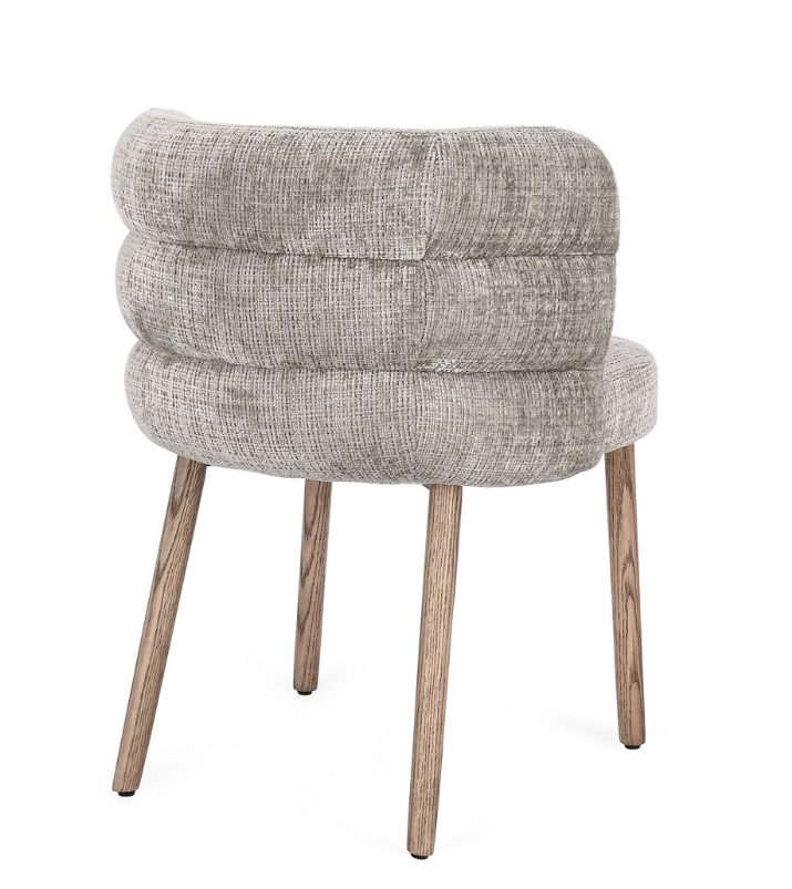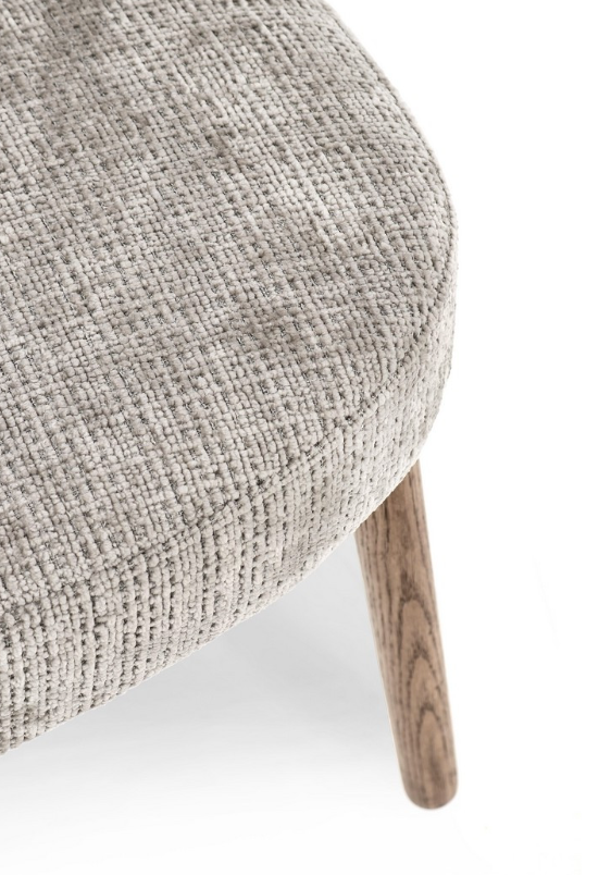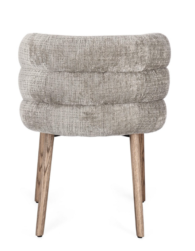 Krzesło z podłokietnikami Ilma to projekt, który z niezwykłą gracją łączy współczesny minimalizm z przytulnością naturalnych materiałów. Uwagę przyciąga przede wszystkim unikalna konstrukcja oparcia, która dzięki poziomym przeszyciom zyskuje trójwymiarową, "segmentową" strukturę, nadającą bryle wyjątkowego charakteru. Tapicerka w subtelnym, popielatym odcieniu posiada wyraźny splot, który wprowadza do wnętrza szlachetną teksturę.