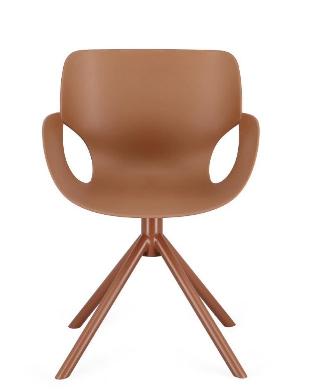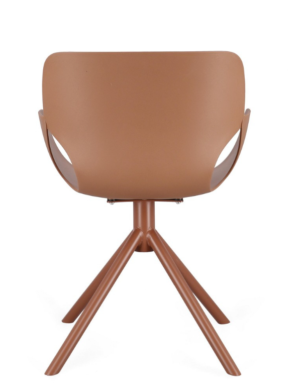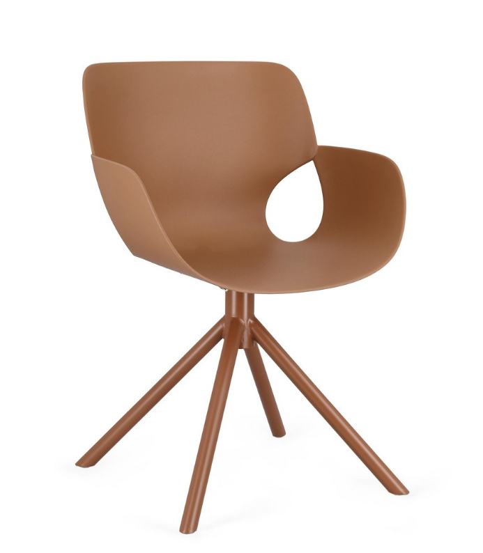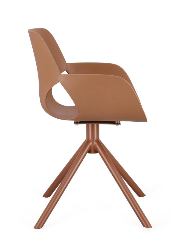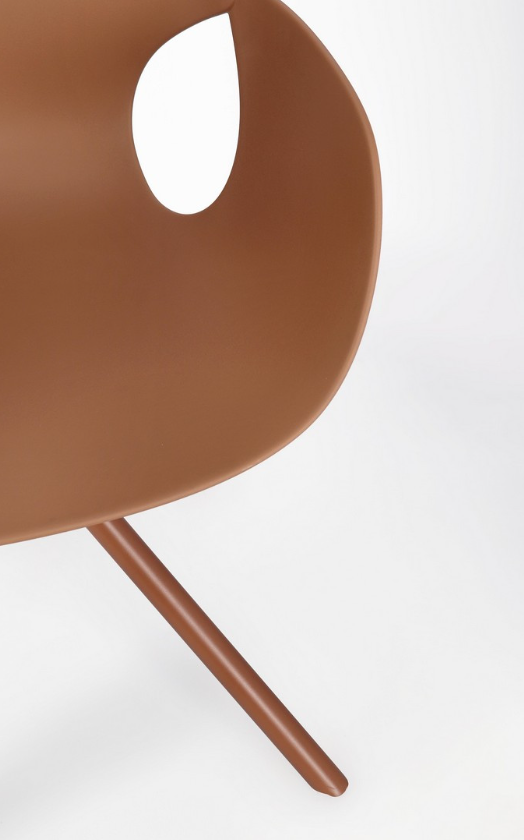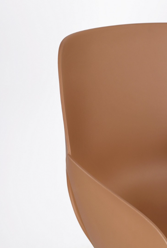 Krzesło Lennon to projekt, który przyciąga wzrok odważną, futurystyczną formą i harmonijną kolorystyką. Siedzisko o kubełkowym kształcie zostało wykonane z wysokiej jakości polipropylenu (PP) w głębokim, karmelowym odcieniu. Materiał ten zapewnia nie tylko doskonałą trwałość i łatwość w pielęgnacji, ale również pozwala na uzyskanie płynnych, organicznych linii, które definiują charakter mebla.