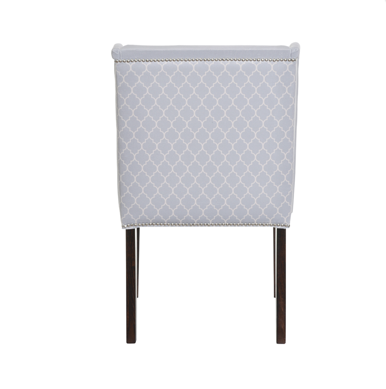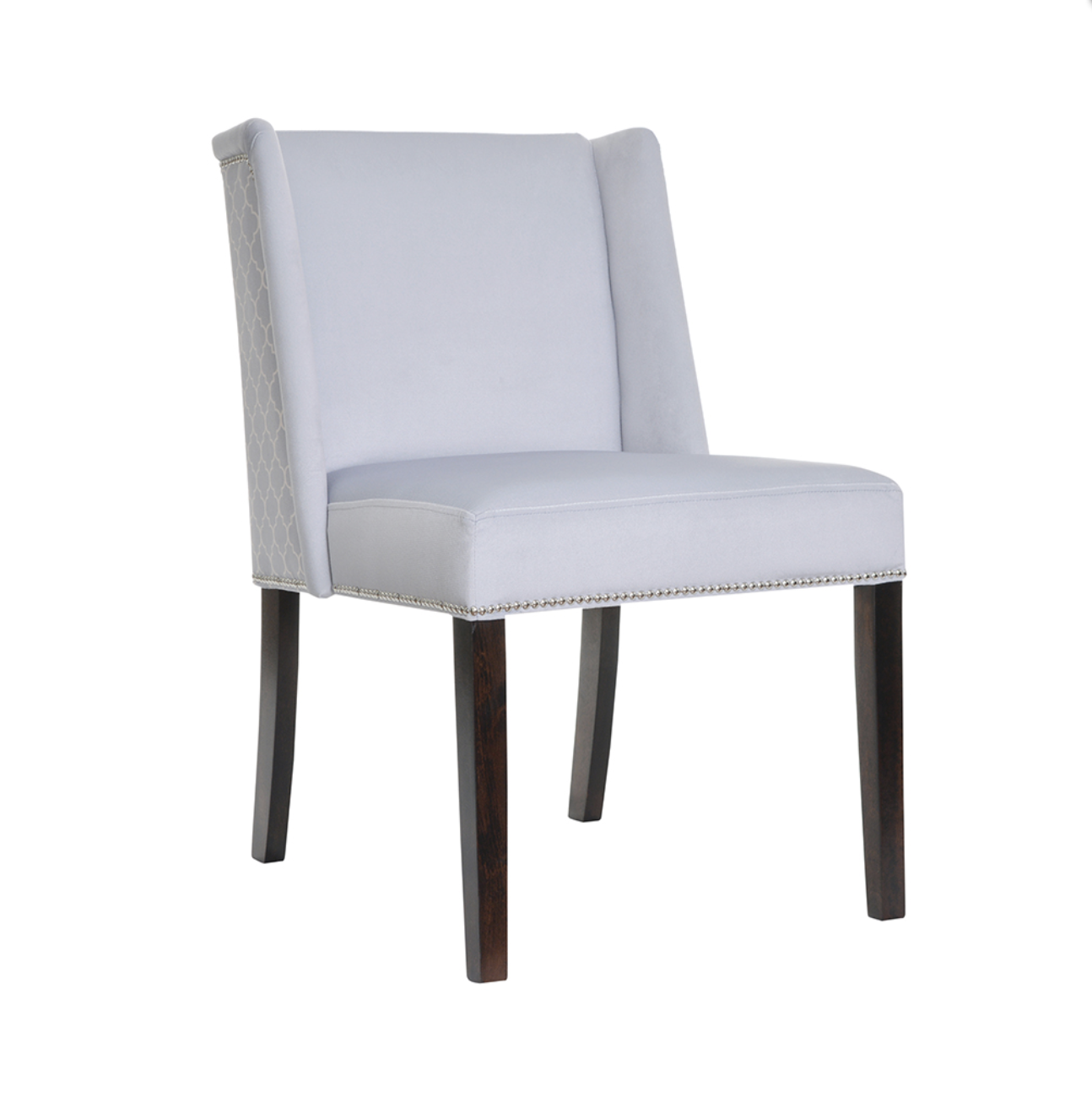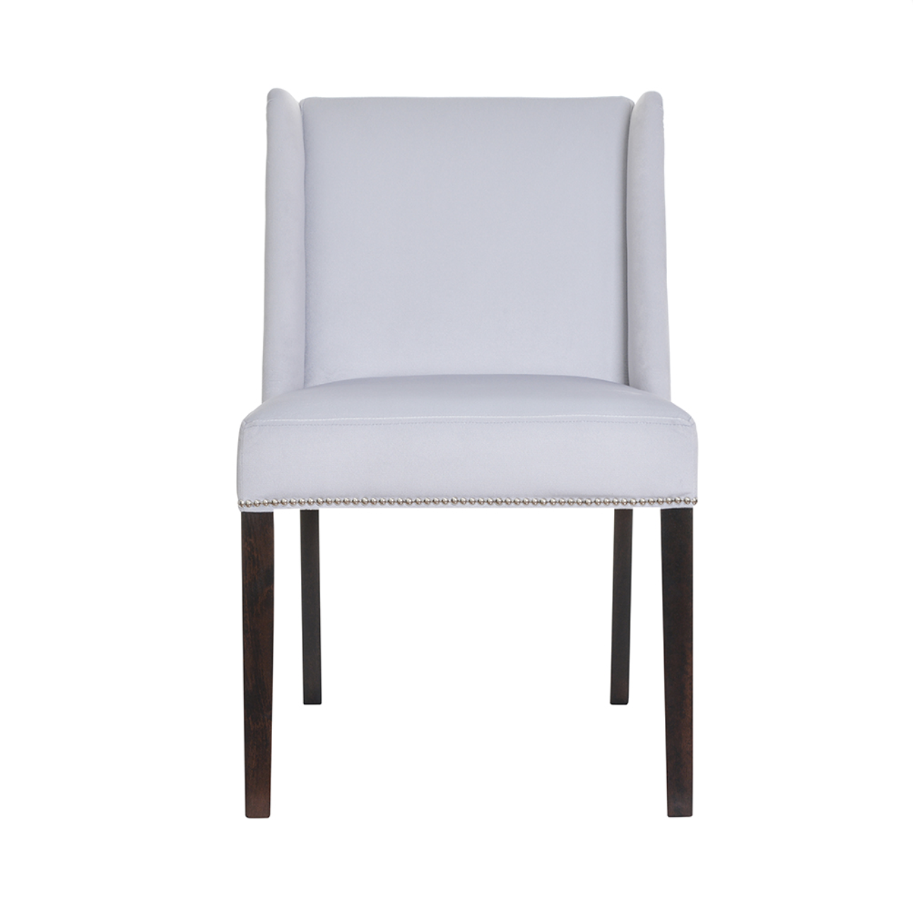 Połączenie welurowej tkaniny i prostych drewnianych nóżek to idealna kombinacja do eleganckich, klasycznych wnętrz. Oparcie krzesła jest idealnie wyprofilowane, dzięki czemu bardzo dobrze dopasowuje się do kształtu pleców. Zapewnia komfort siedzenia na wiele godzin. Tasiemka pineskowa sprawia, że nabiera wyjątkowości i staje się oryginalne.