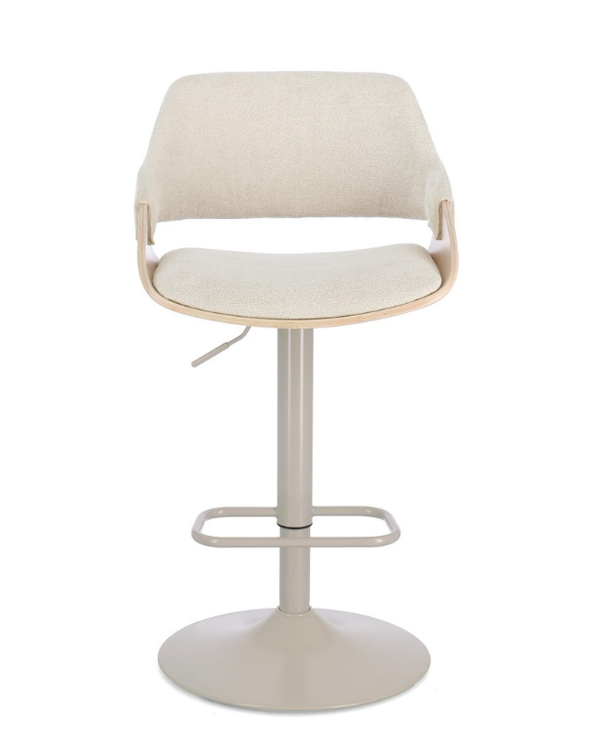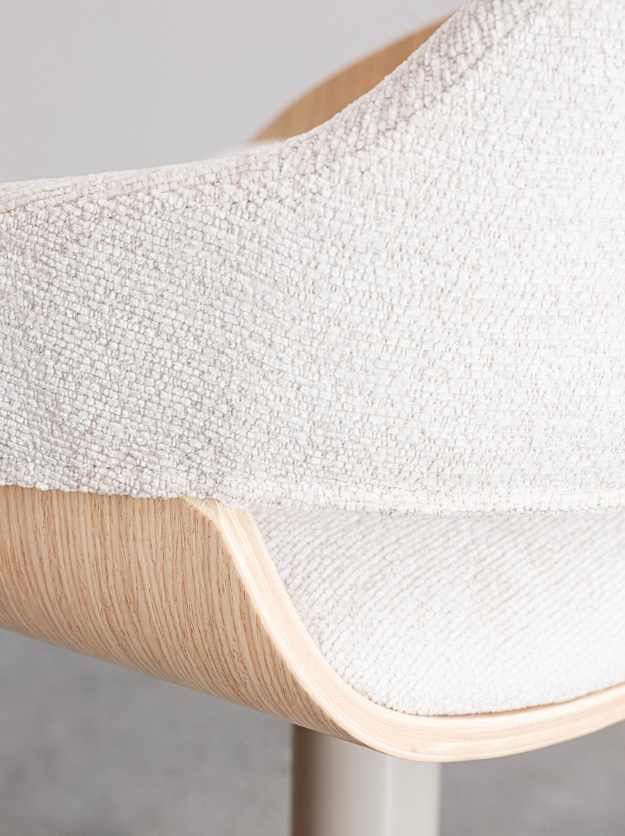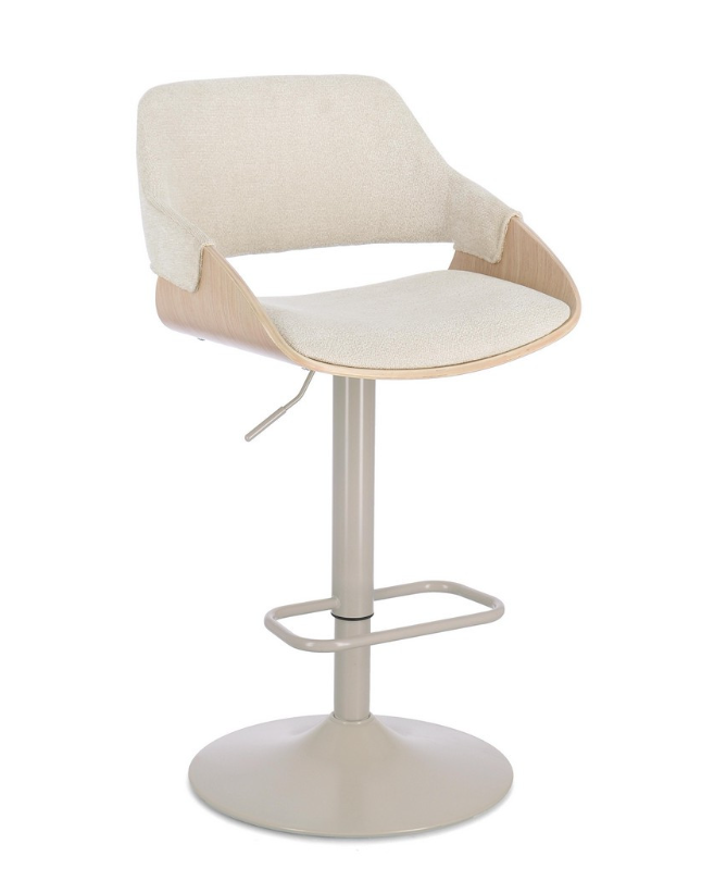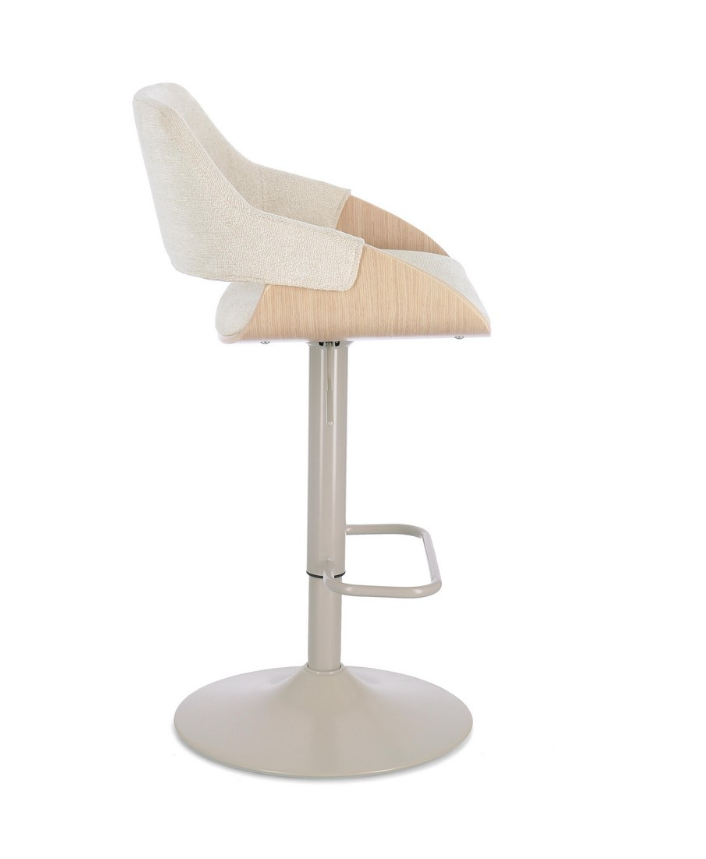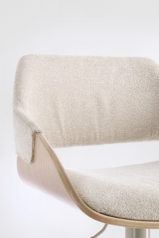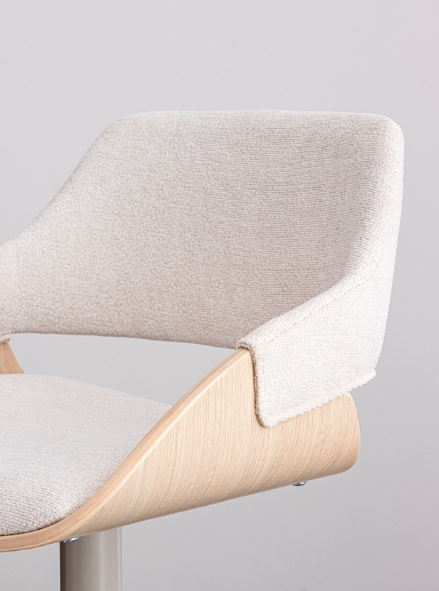 Krzesło barowe Roxanne to propozycja, która wprowadza do wnętrza lekkość i subtelną elegancję. Kubełkowa forma oparcia, wykonana z wyprofilowanej sklejki pokrytej fornirem z jasnego drewna topolowego, płynnie przechodzi w zgrabne podłokietniki. Jasna kolorystyka drewna doskonale współgra z jasnobeżowym obiciem z wytrzymałej tkaniny syntetycznej oraz stalową podstawą utrzymaną w zbliżonej tonacji, tworząc spójną wizualnie, ciepłą bryłę. Wnętrze siedziska wypełnia miękka pianka poliuretanowa, gwarantująca optymalny komfort nawet podczas długich spotkań przy kuchennej wyspie.