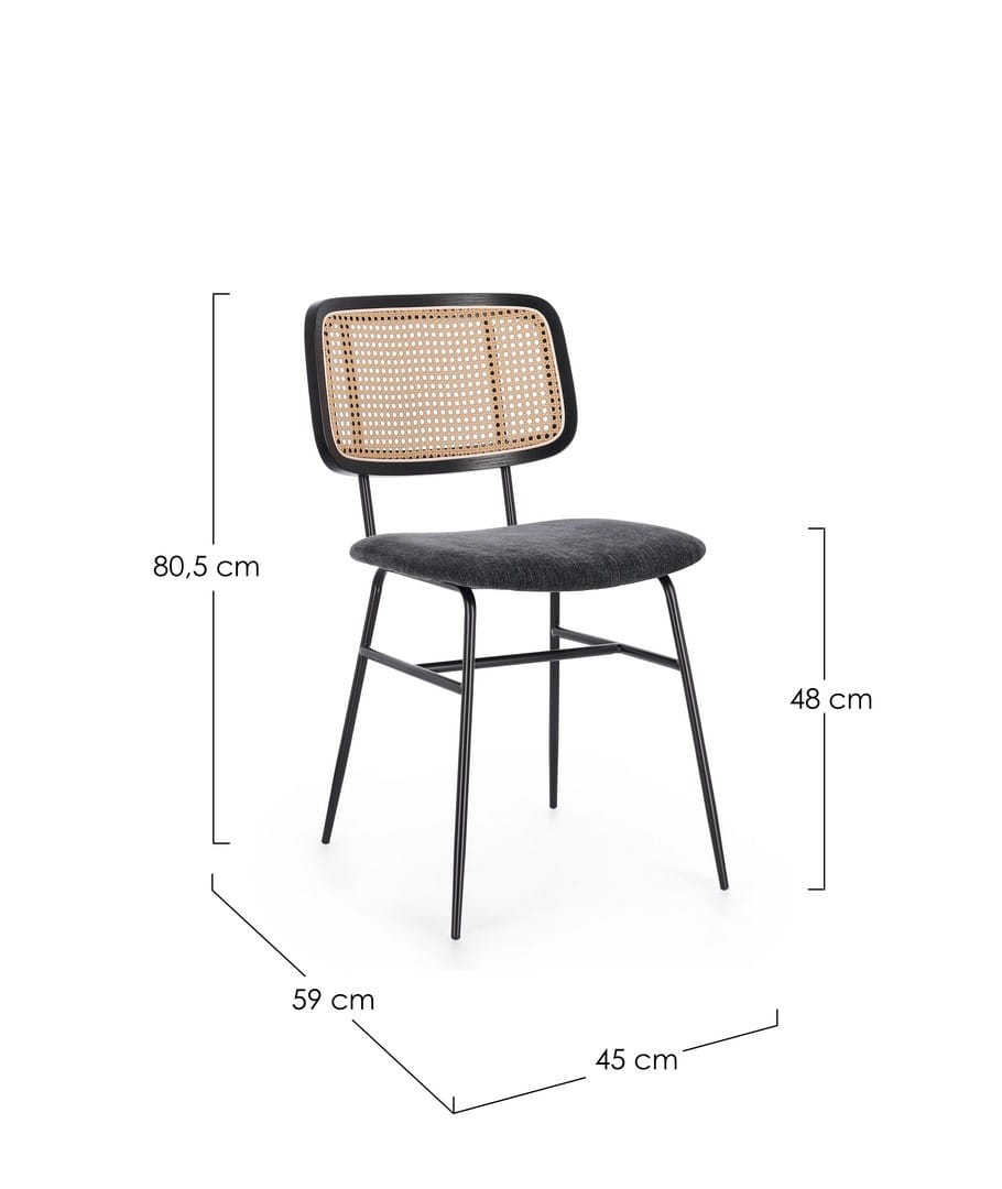 Siedzisko krzesła wykonane ze sklejki, pokryte wysokiej jakości tapicerką z poliestru, gwarantuje komfort i łatwość utrzymania w czystości. Materiał ten jest odporny na ścieranie, dzięki czemu krzesło zachowuje swoją atrakcyjność przez długi czas. Oparcie ze sklejki wzbogacone włóknem syntetycznym imitującym rattan nadaje meblowi unikalny, ciepły wygląd, wprowadzając do wnętrza nutę naturalności i lekkości.