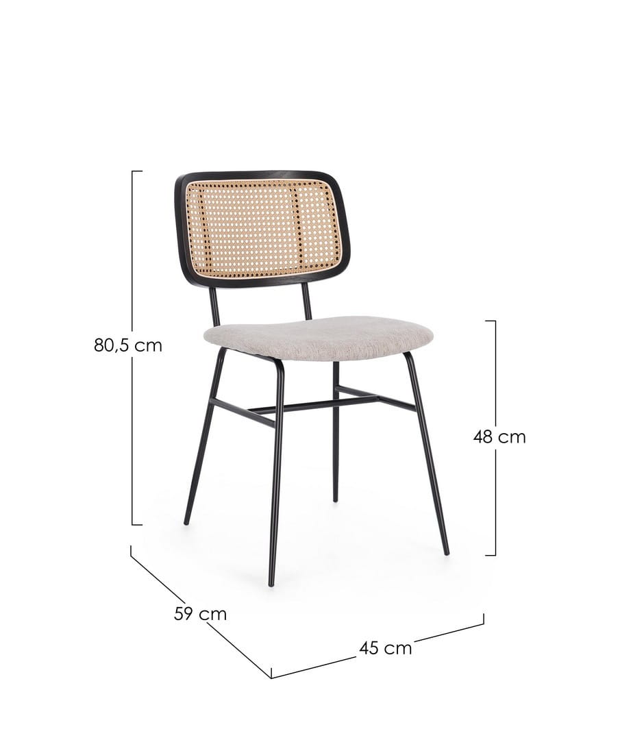 Siedzisko krzesła wykonane ze sklejki, pokryte wysokiej jakości tapicerką z poliestru, gwarantuje komfort i łatwość utrzymania w czystości. Materiał ten jest odporny na ścieranie, dzięki czemu krzesło zachowuje swoją atrakcyjność przez długi czas. Oparcie ze sklejki wzbogacone włóknem syntetycznym imitującym rattan nadaje meblowi unikalny, ciepły wygląd, wprowadzając do wnętrza nutę naturalności i lekkości.
