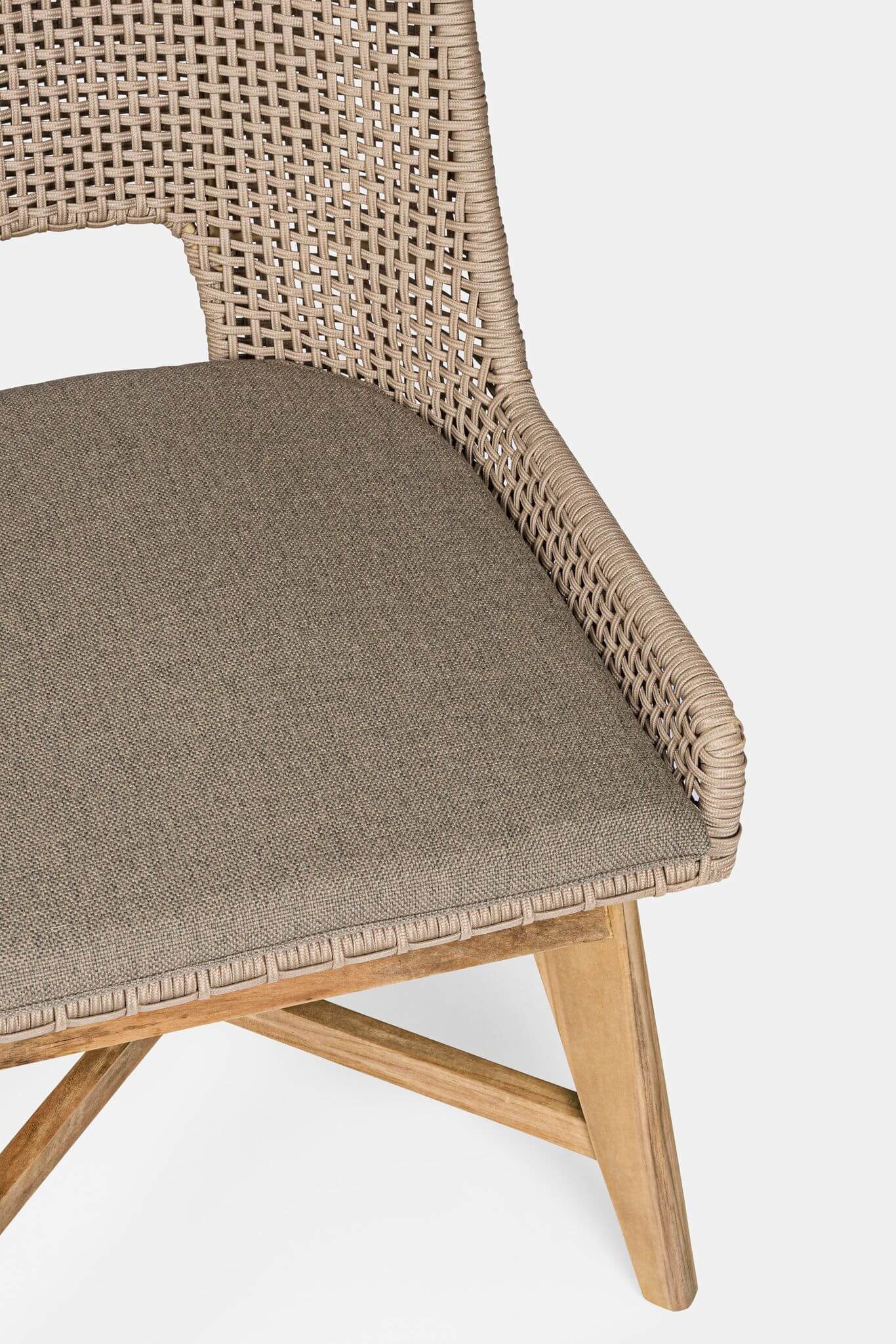 Krzesło ogrodowe Hesperia charakteryzuje się naturalną kolorystyką, wynikającą z połączenia stylowego splotu z drewnianymi nóżkami.