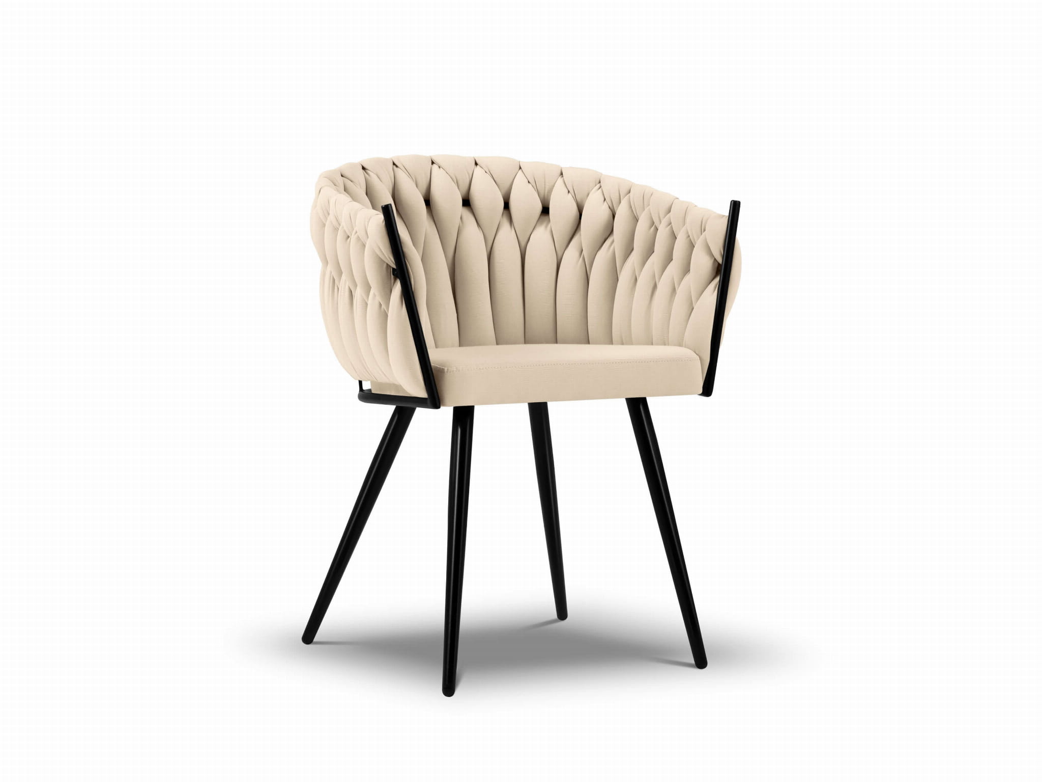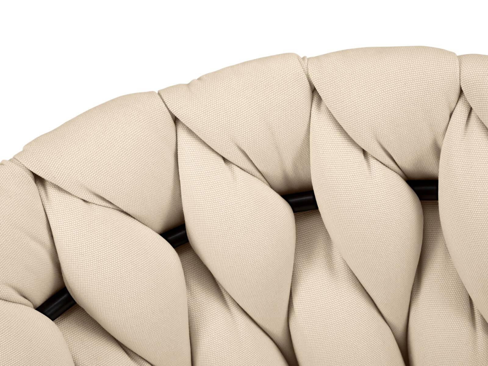 Krzesło pokryte jest beżową tkaniną obiciową Toptextil Garden, przeznaczoną głównie do mebli ogrodowych, tarasowych i balkonowych. Jej gładka struktura, o prostym, płóciennym splocie ma lekko połyskującą powierzchnię. Przyjemna w dotyku. Charakteryzuje się wysoką odpornością na nasłonecznienie.