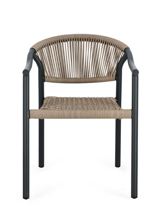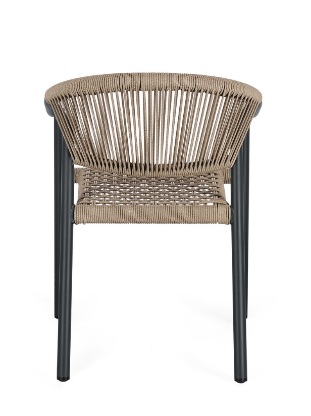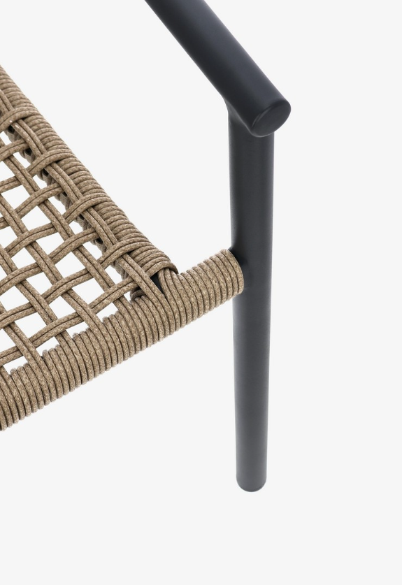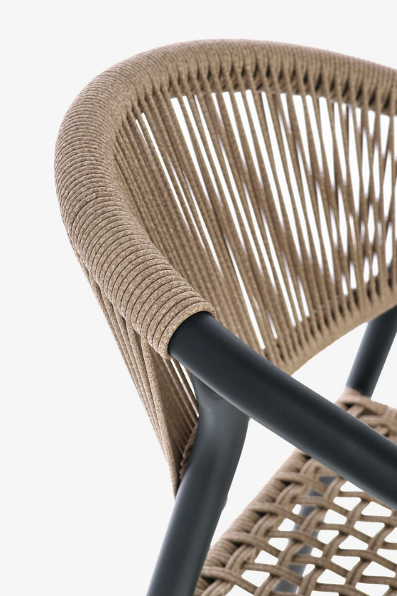 Głównym atutem tego modelu jest wyjątkowe, precyzyjne wykończenie. Zarówno siedzisko, jak i oparcie zostały wyplecione ze skręcanego włókna syntetycznego, które do złudzenia przypomina naturalny sznurek, ale cechuje się znacznie wyższą odpornością na warunki zewnętrzne. Na siedzisku zastosowano gęsty, krzyżowy splot zapewniający optymalną sprężystość i wygodę, natomiast oparcie zdobi efektowna, pionowa plecionka, która pięknie filtruje światło i prezentuje się zjawiskowo od tyłu.