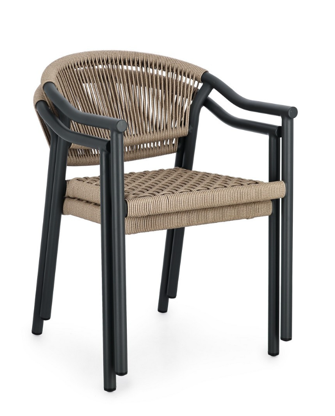 Zestawienie surowej, antracytowej ramy z ciepłym, piaskowym odcieniem sznurka sprawia, że propozycja od włoskiej marki Bizzotto idealnie wpisuje się w najnowsze trendy, tworząc na tarasie wyjątkową atmosferę.