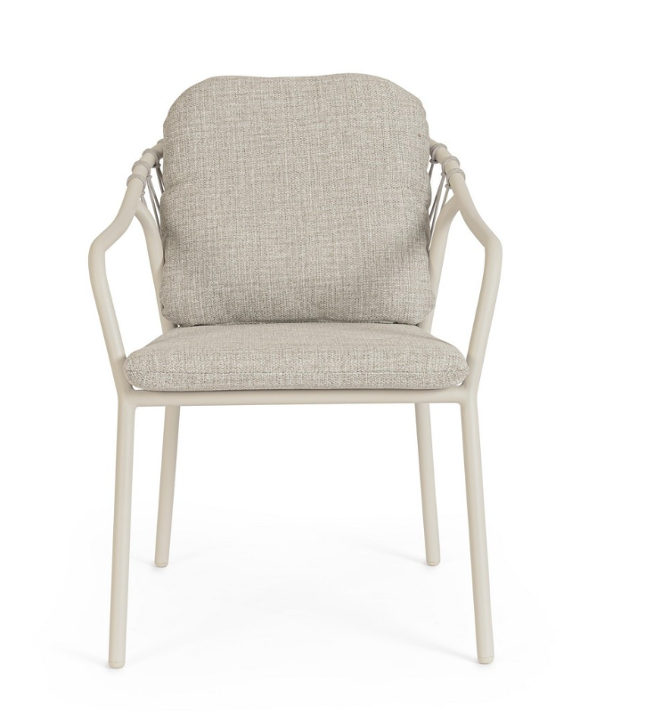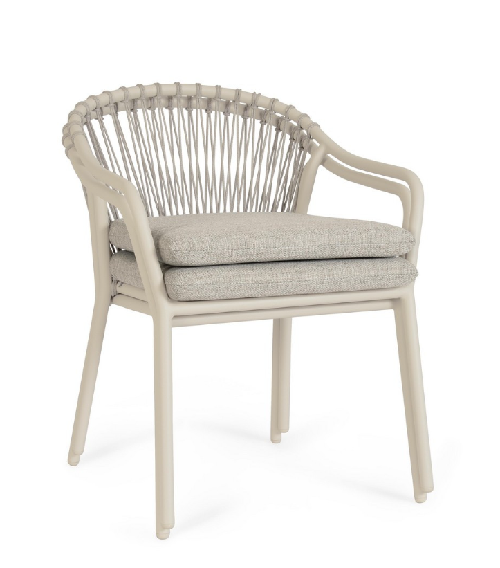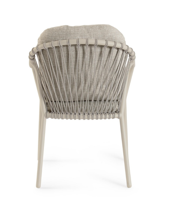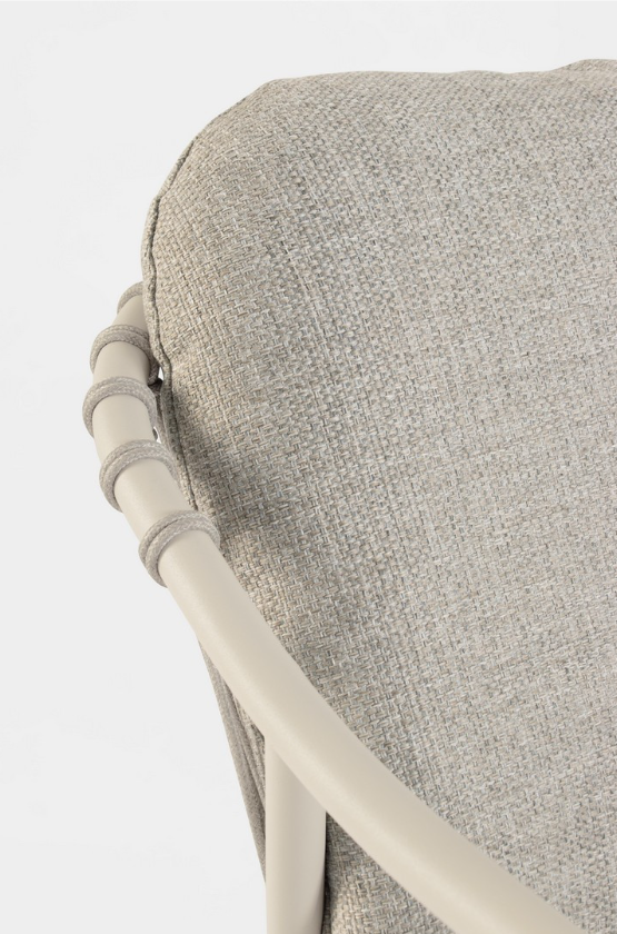 Krzesło ogrodowe Edvige w subtelnym, piaskowym odcieniu to idealna propozycja dla osób ceniących lekkość i naturalną estetykę. Jego stabilna konstrukcja z aluminium malowanego proszkowo zapewnia całkowitą odporność na rdzę, a łagodnie wyprofilowane podłokietniki gwarantują komfortowe podparcie. Prawdziwą ozdobą tego mebla jest tył oparcia, na którym poprowadzono delikatną, pionową plecionkę z wytrzymałej liny. Ten precyzyjny detal nadaje bryle nowoczesnego, rzemieślniczego charakteru.