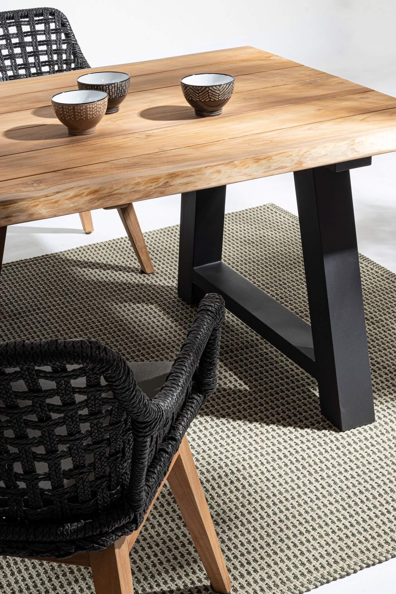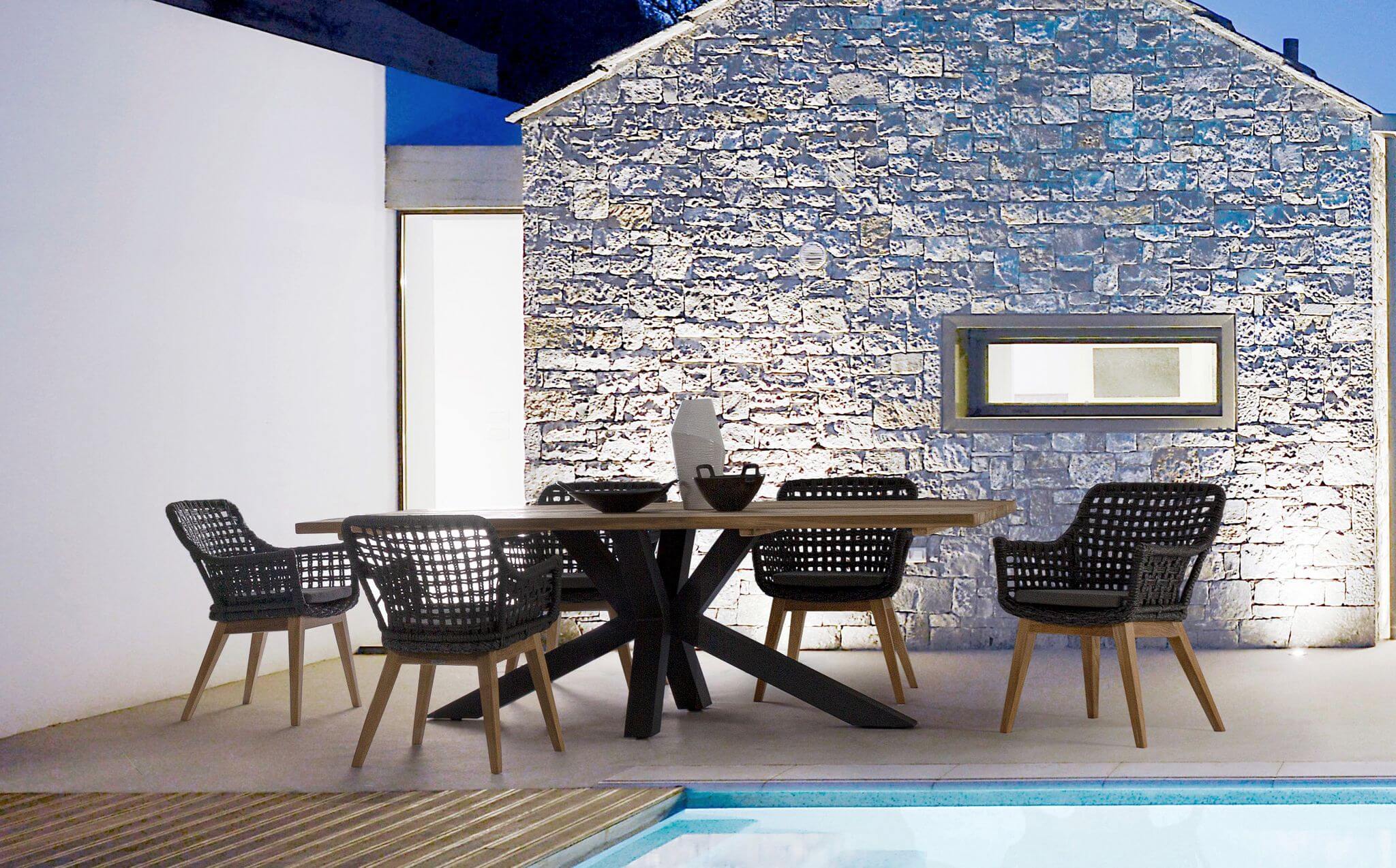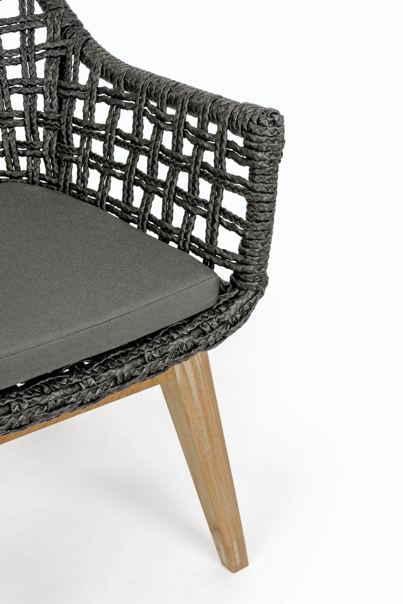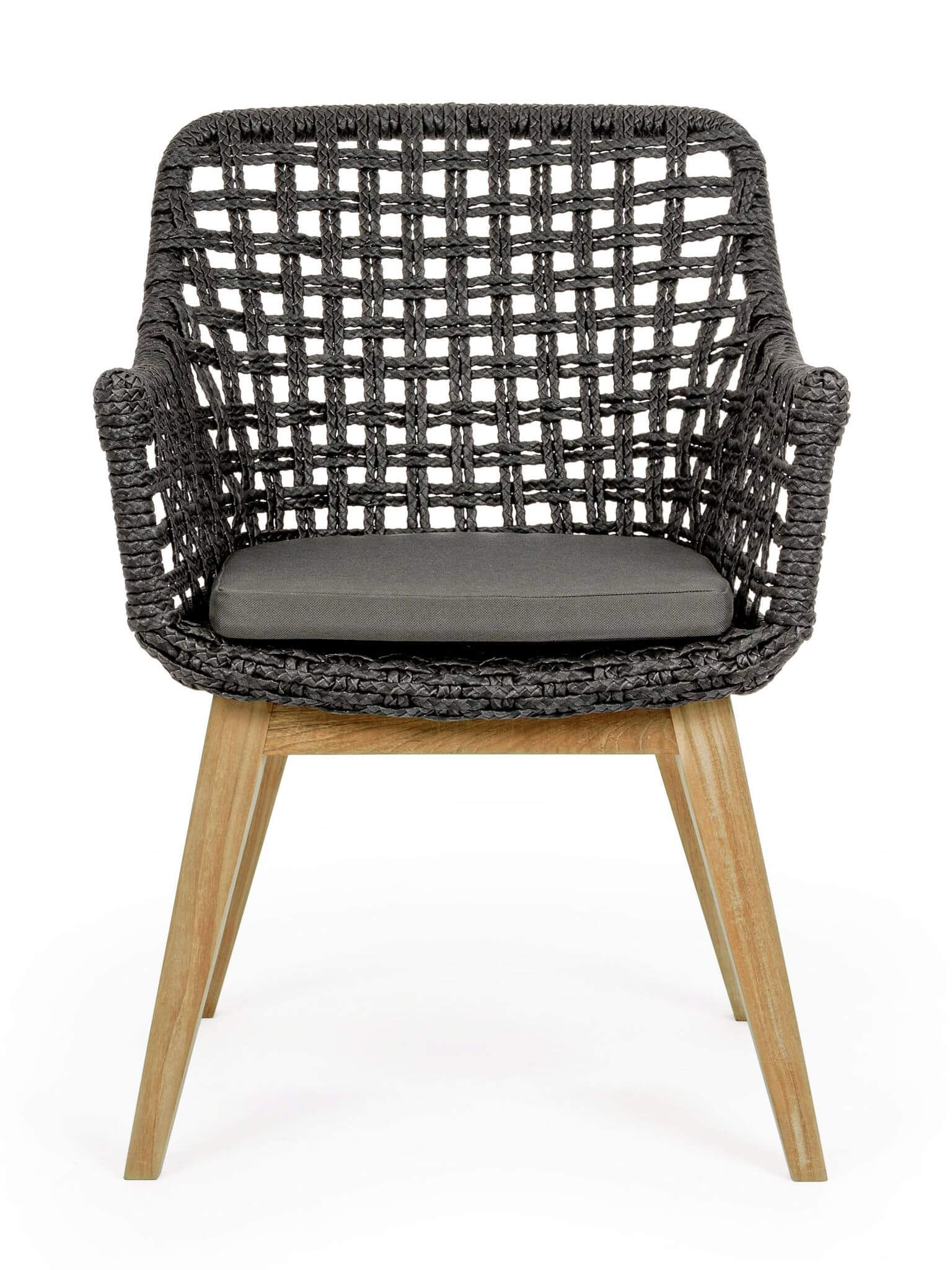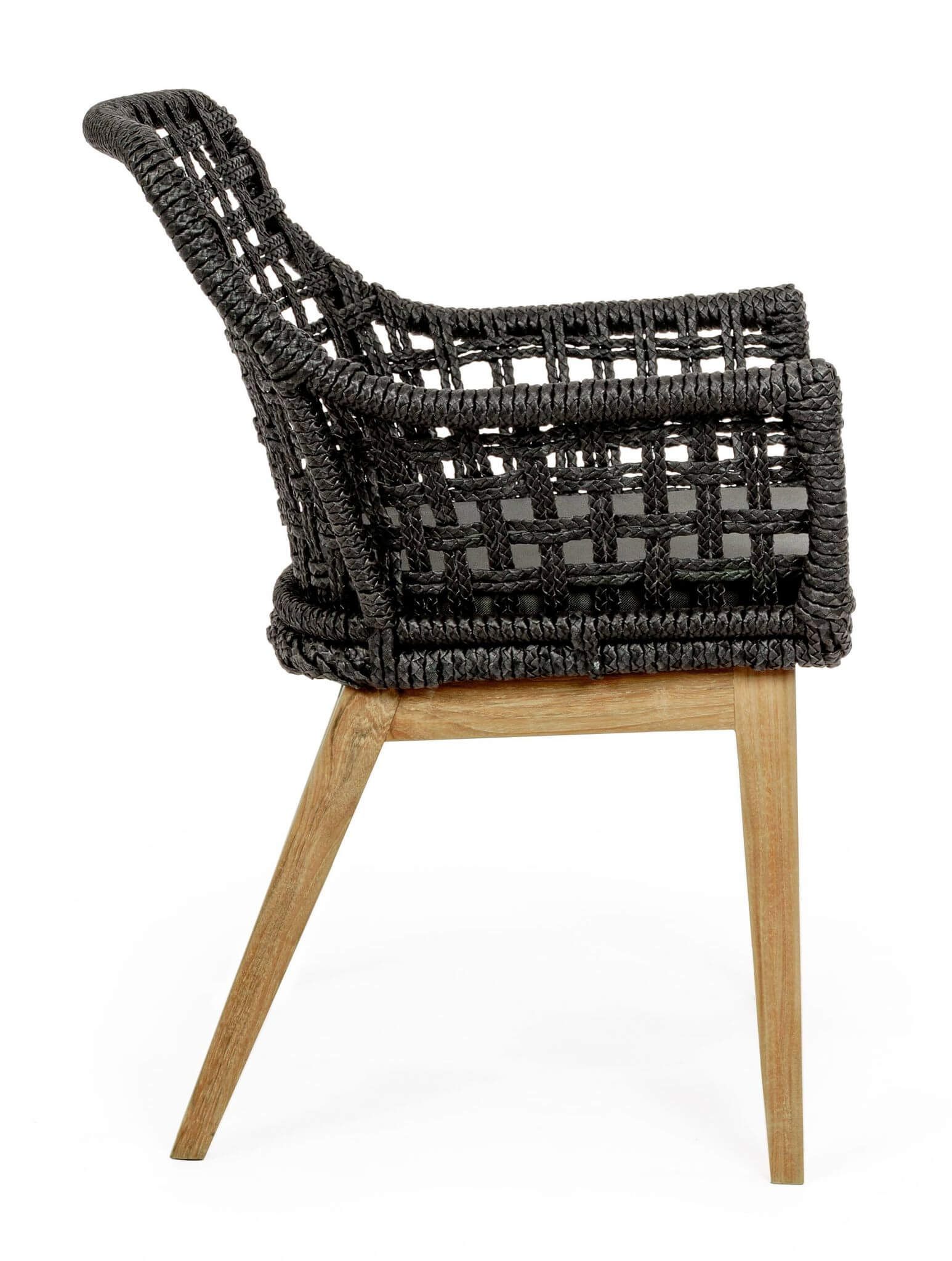 Krzesło ogrodowe z podłokietnikami Madison to ciekawe połączenie nowoczesnej antracytowej plecionki z naturalnymi drewnianymi nogami.