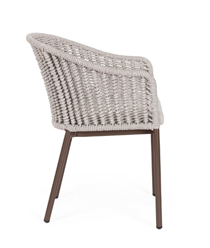Krzesło ogrodowe Salines w głębokim, brązowym odcieniu to wyrafinowana propozycja, która wniesie do Twojej strefy relaksu nutę ponadczasowej elegancji. Solidna konstrukcja z aluminium malowanego proszkowo zapewnia pełną odporność na korozję, a jej ciemny kolor pięknie kontrastuje z jasnym, szaro-beżowym oparciem i siedziskiem. Kubełkowe oparcie, które płynnie przechodzi w podłokietniki, wykończono misterną plecionką z liny poliestrowej. Tworzy ona gęsty, przestrzenny wzór, który przyciąga spojrzenia i doskonale prezentuje się z tyłu oraz z profilu.