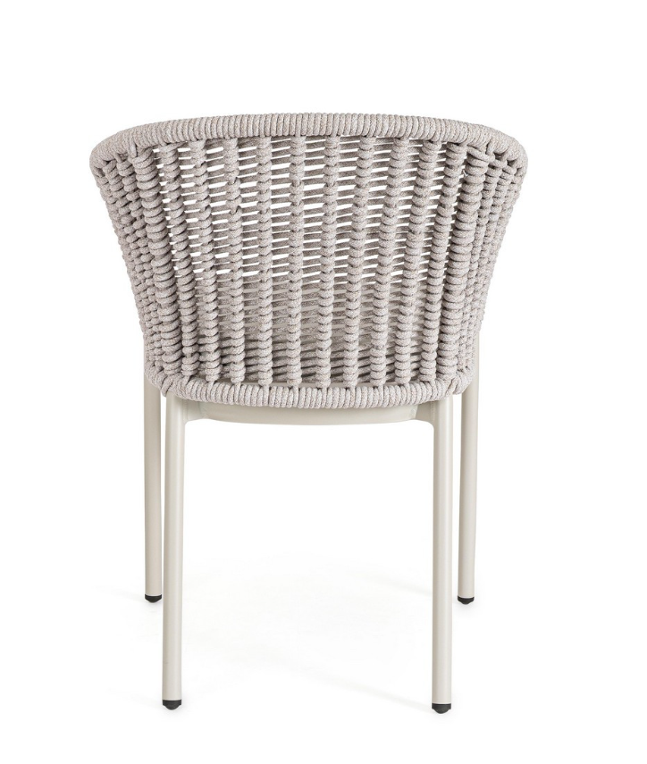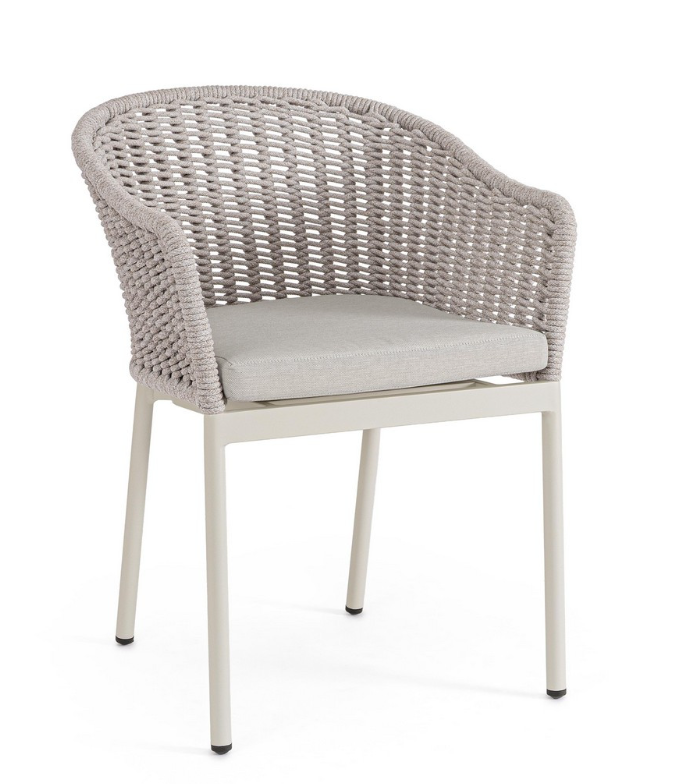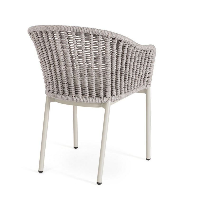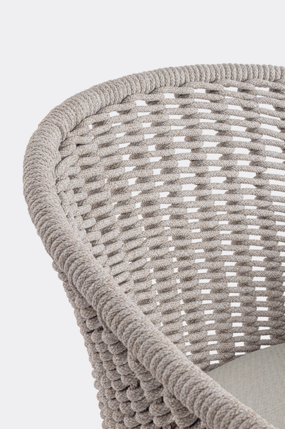 Krzesło ogrodowe Salines w jasnoszarym odcieniu to subtelna i niezwykle uniwersalna propozycja do każdej zewnętrznej strefy relaksu. Solidna konstrukcja z aluminium malowanego proszkowo zapewnia pełną odporność na korozję, a jej jasna, chłodna barwa wprowadza do aranżacji lekkość i świeżość. Kubełkowe oparcie, które płynnie przechodzi w podłokietniki, wykończono misterną plecionką z liny poliestrowej. Tworzy ona gęsty, przestrzenny wzór, który doskonale prezentuje się z każdej perspektywy, stanowiąc główną ozdobę mebla.