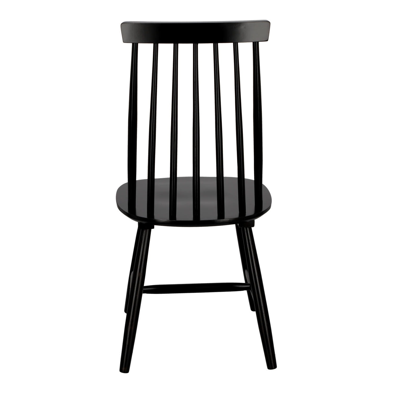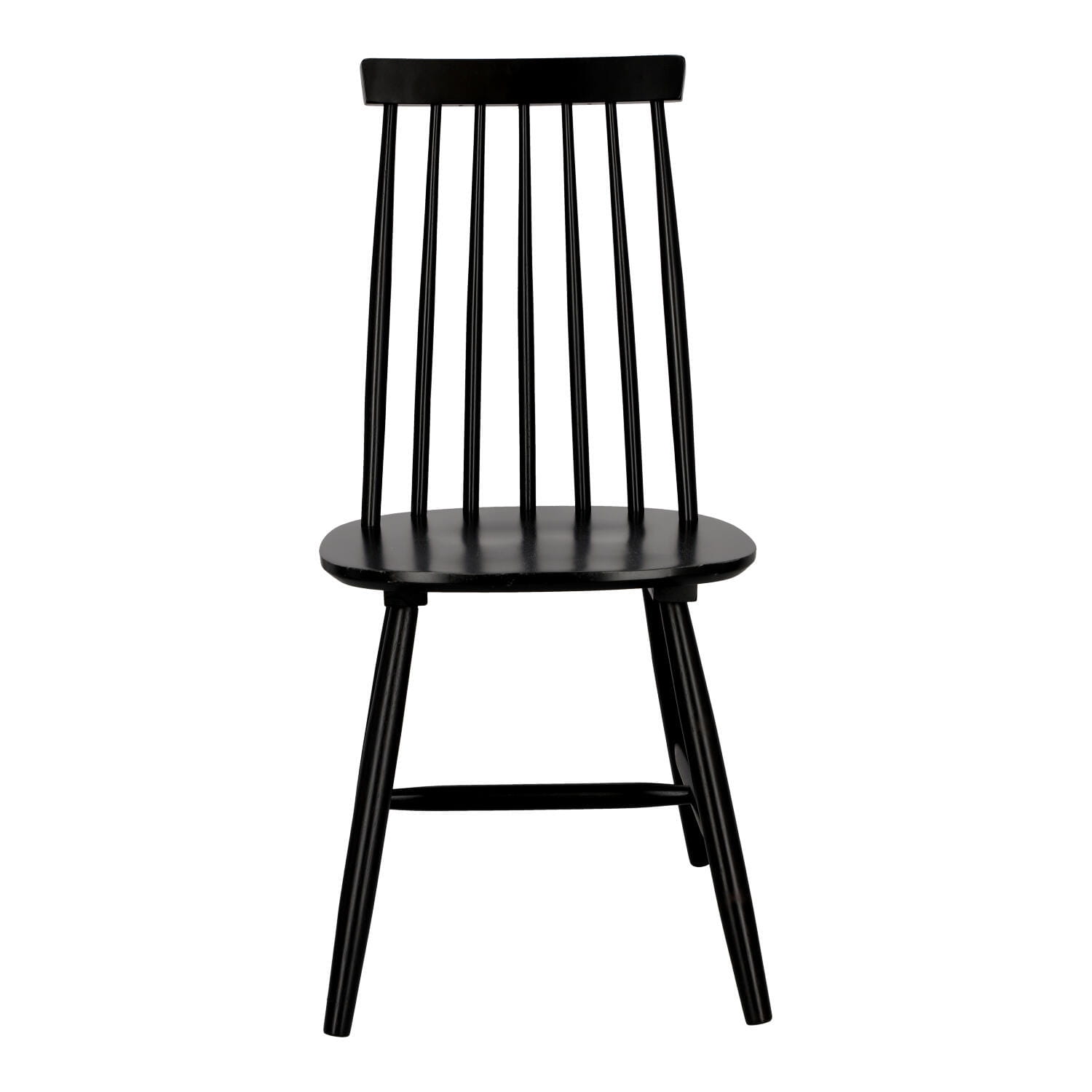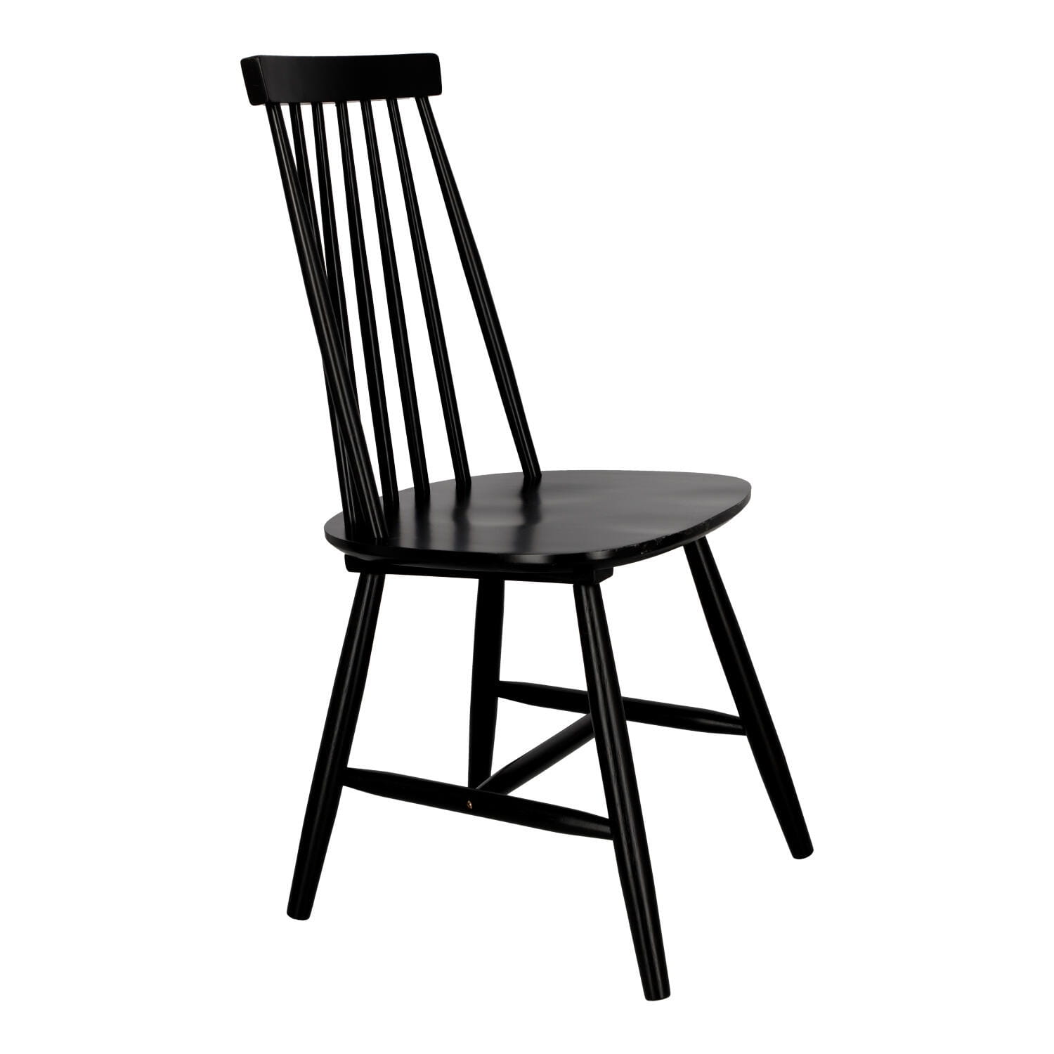 Charakterystyczne szczebelkowe oparcie tworzy spójną strukturę, zapewniając przy tym komfort siedzenia. Podłużne elementy oparcia zestawione zostały z klasycznym, gładkim siedziskiem wspartym na czterech nogach. Nogi delikatnie rozszerzają się i połączone są dodatkową konstrukcją wzmacniającą, co zapewnia dużą stabilizację i wytrzymałość krzesła. Całość wykonana jest z wytrzymałego drewna kauczukowego, malowanego na czarno.