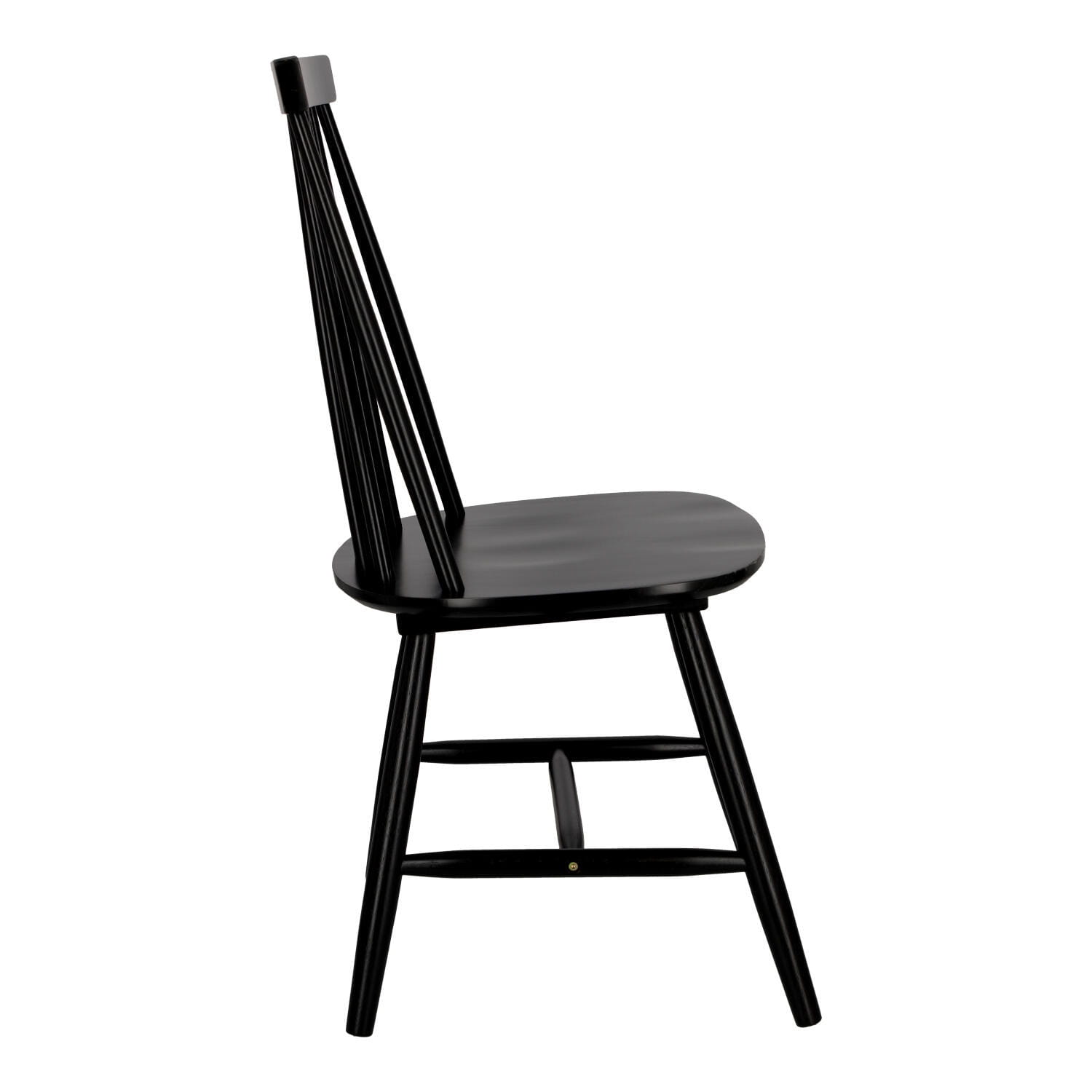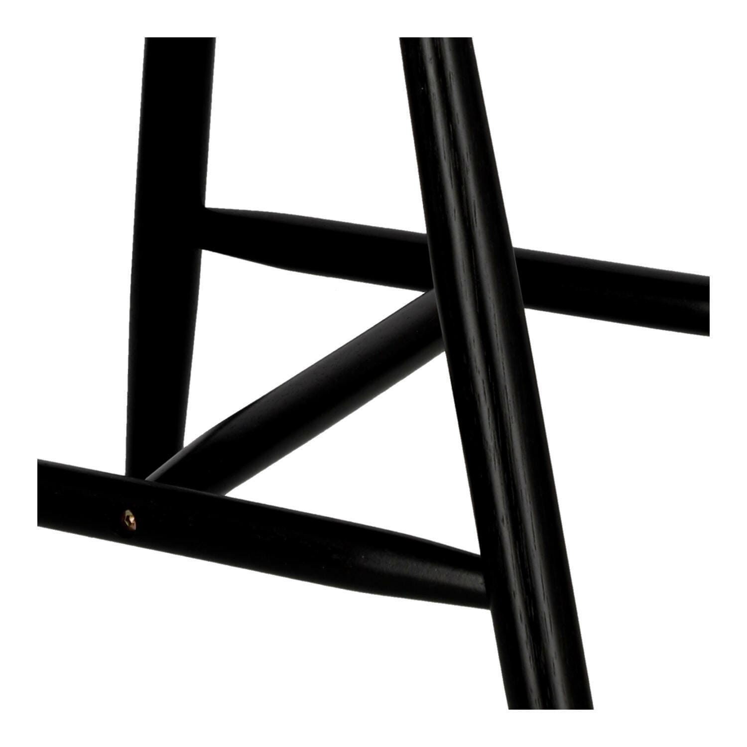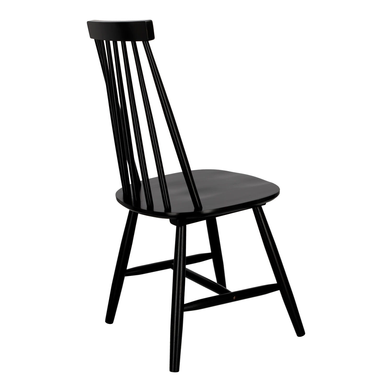Charakterystyczne szczebelkowe oparcie tworzy spójną strukturę, zapewniając przy tym komfort siedzenia. Podłużne elementy oparcia zestawione zostały z klasycznym, gładkim siedziskiem wspartym na czterech nogach. Nogi delikatnie rozszerzają się i połączone są dodatkową konstrukcją wzmacniającą, co zapewnia dużą stabilizację i wytrzymałość krzesła. Całość wykonana jest z wytrzymałego drewna kauczukowego, malowanego na czarno.