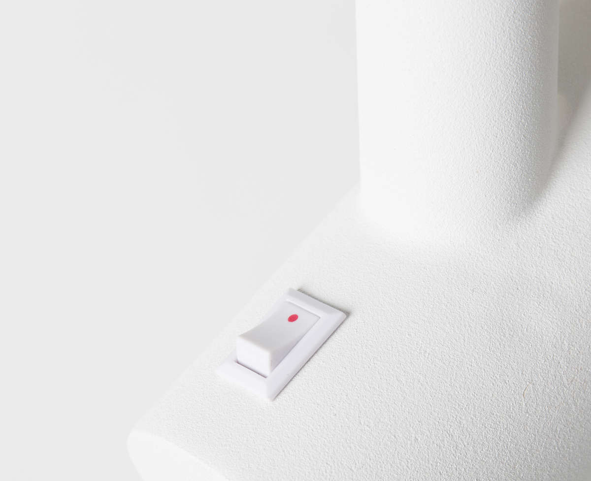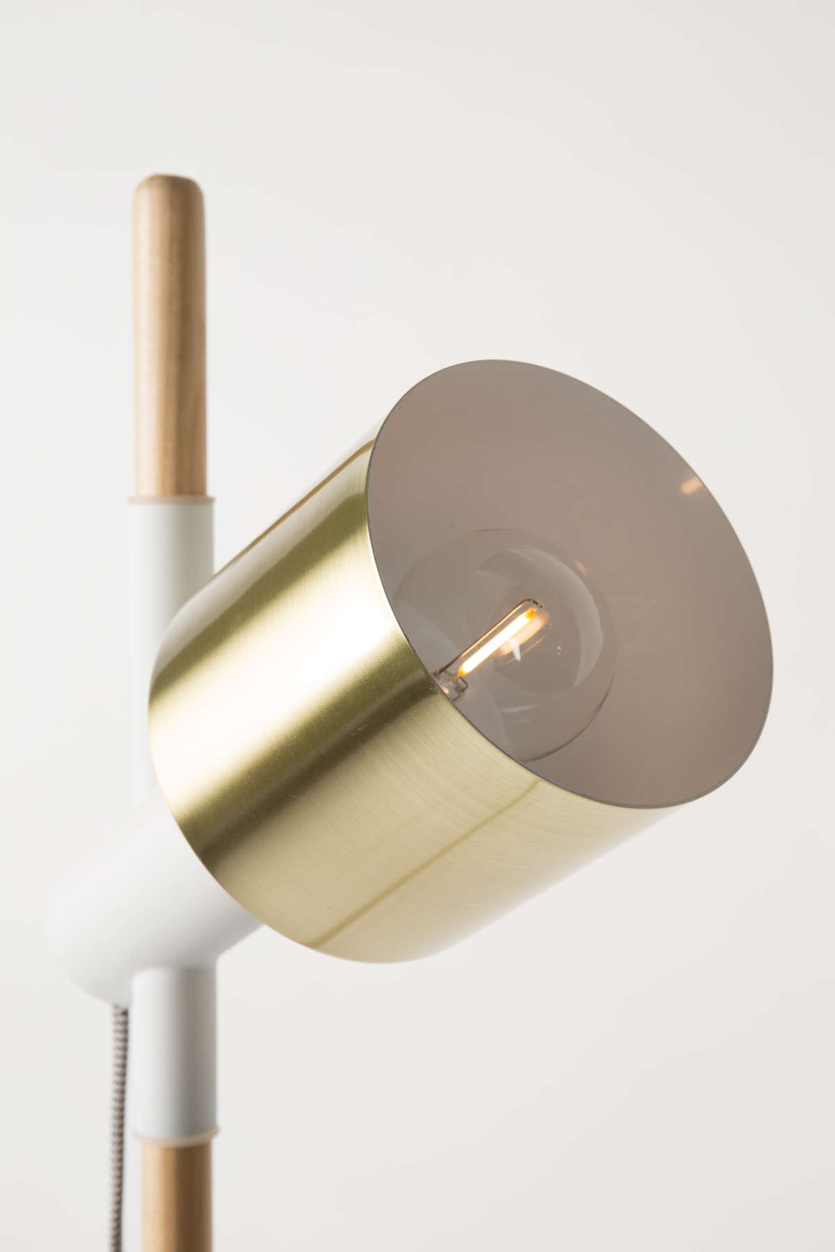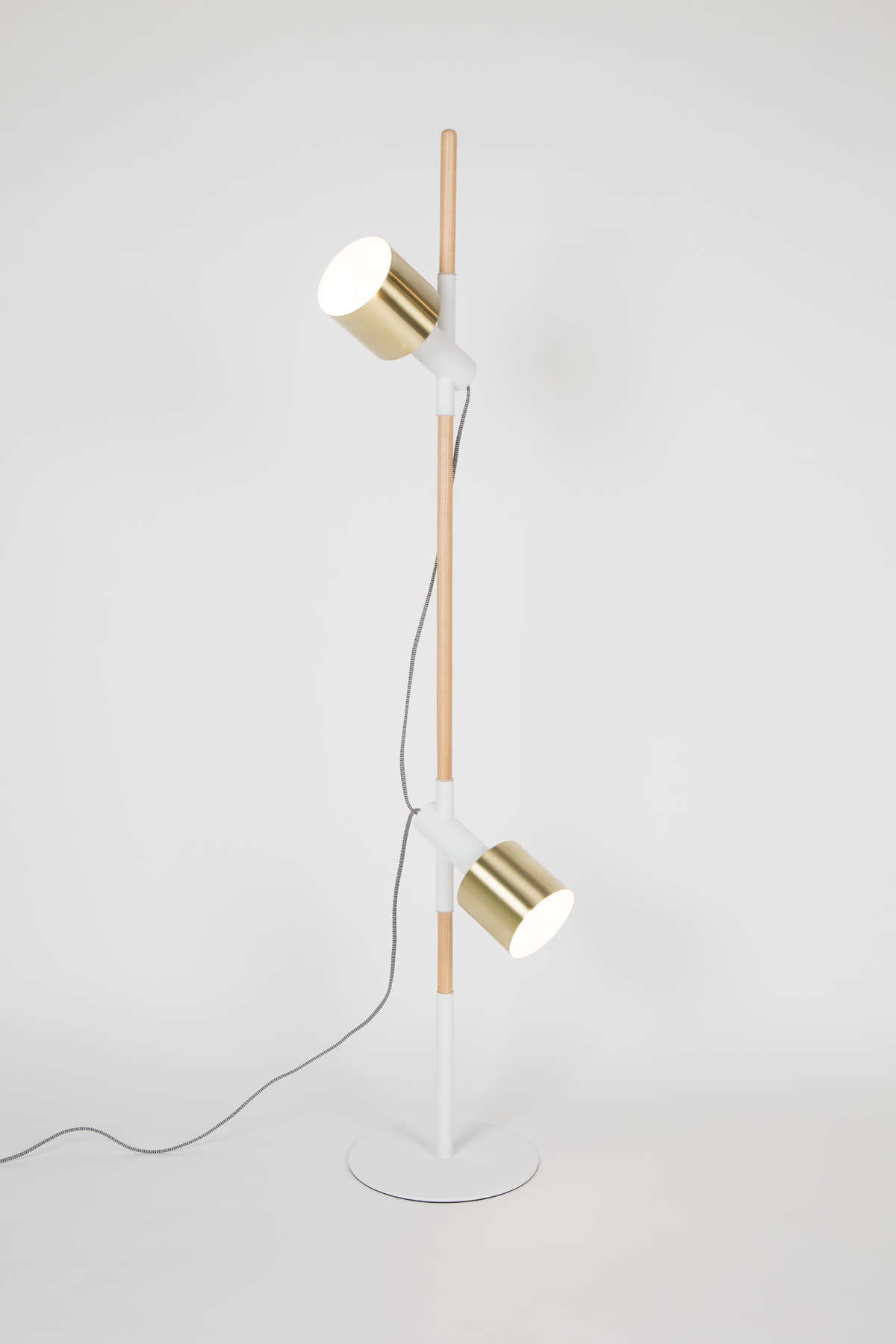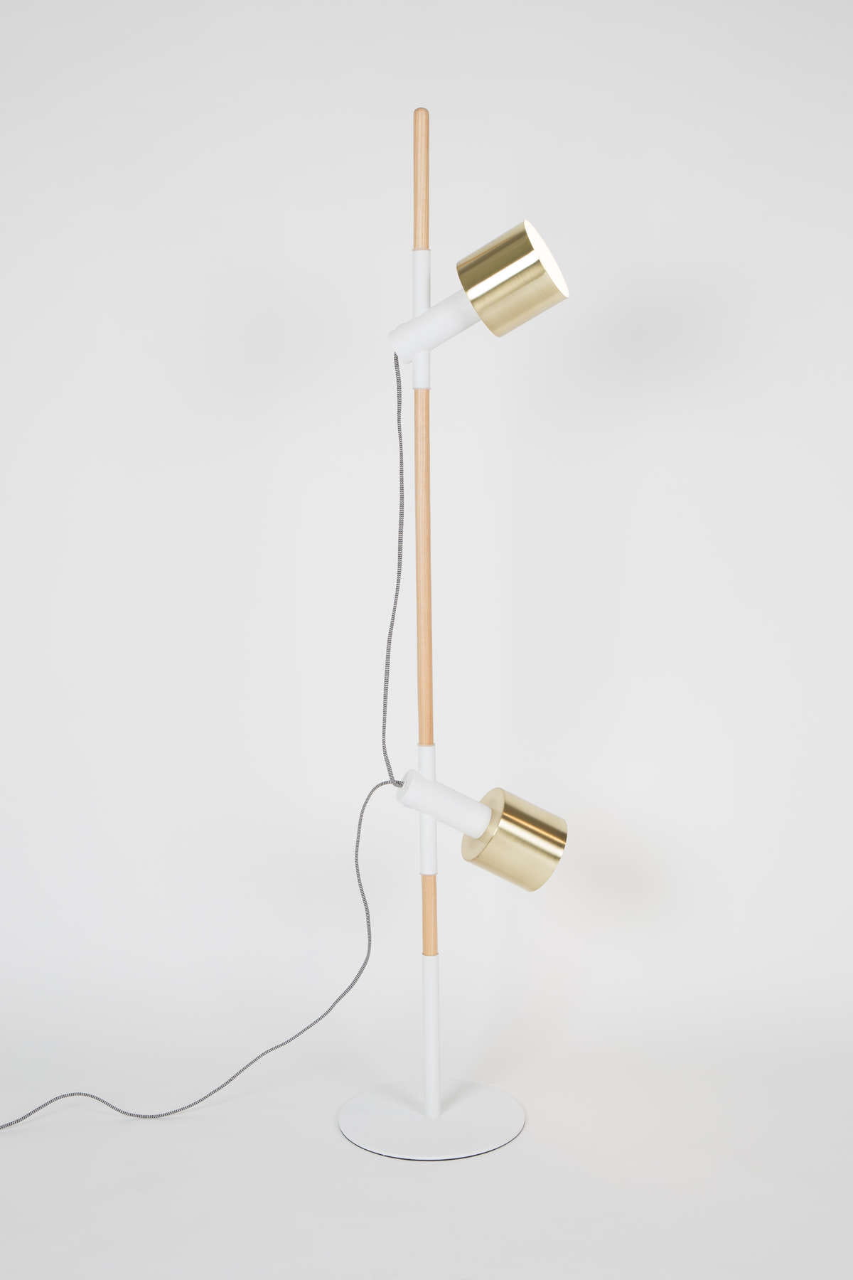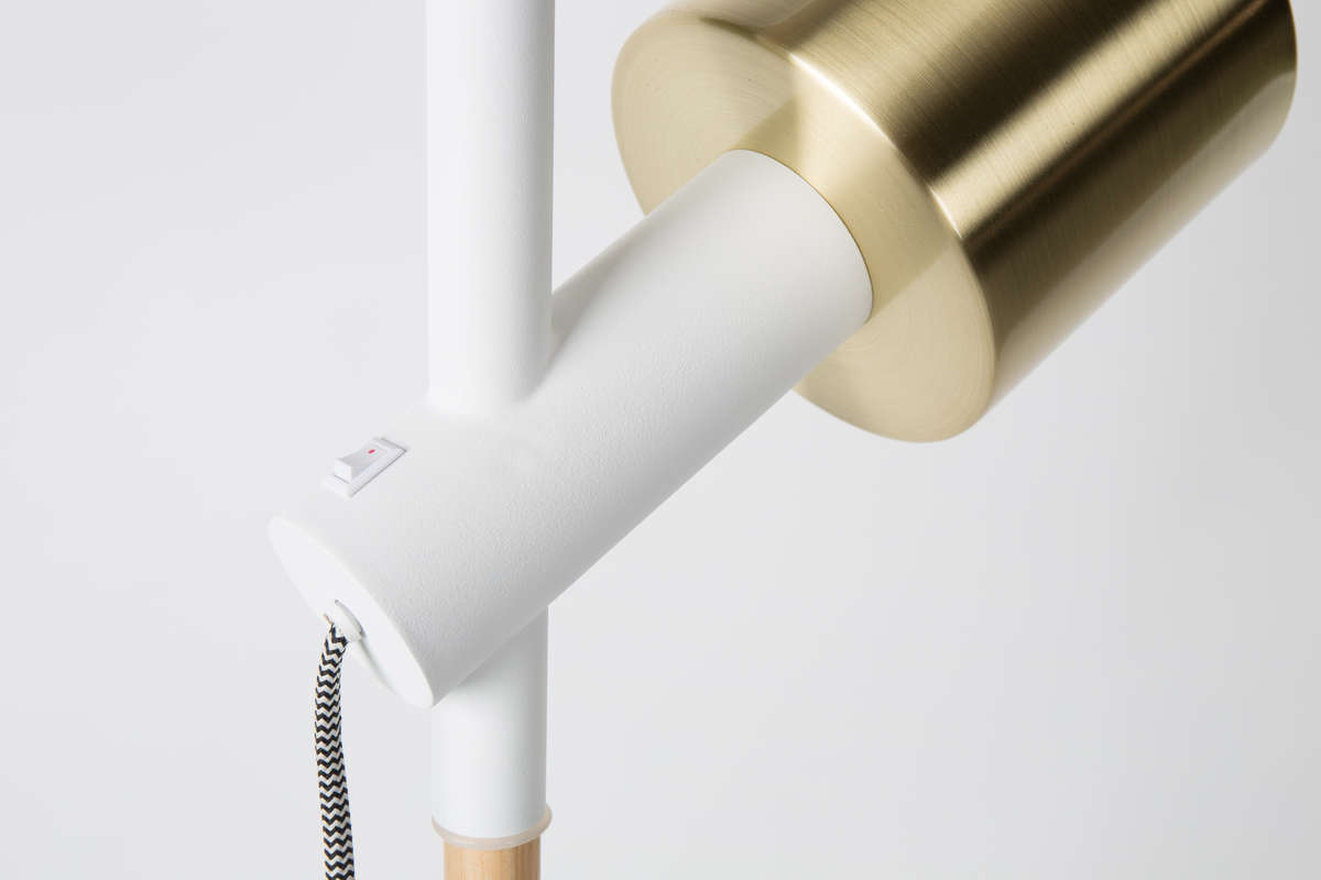 Korpus wykonany jest z litego drewna jesionowego, zestawionego z białą, żelazną podstawą malowaną proszkowo. Powierzchnie pomalowane w ten sposób są gładkie i niezwykle odporne na działanie czynników mechanicznych i chemicznych. Lampa posiada dwa mosiężne klosze w gustownym, złotym kolorze idealnie komponujące się z naturalnym odcieniem drewna i klasyczną bielą.