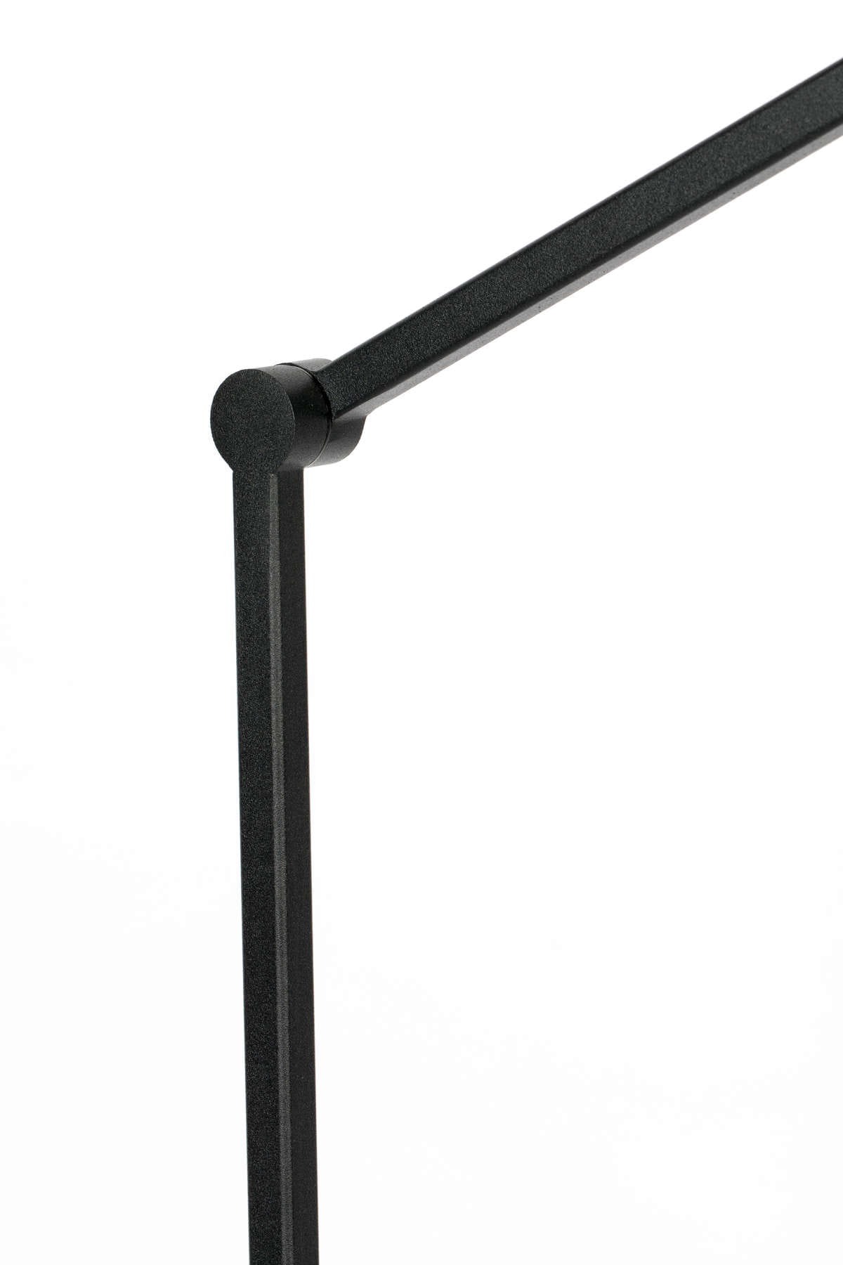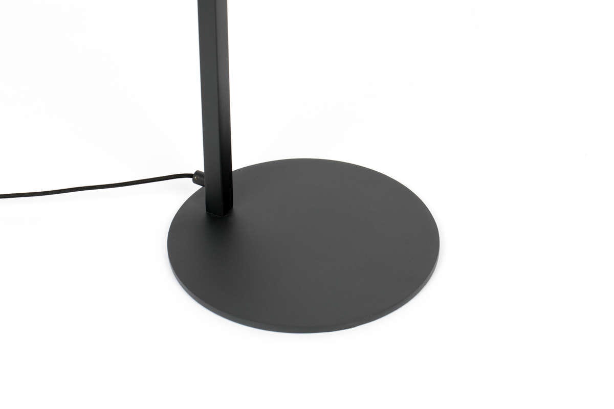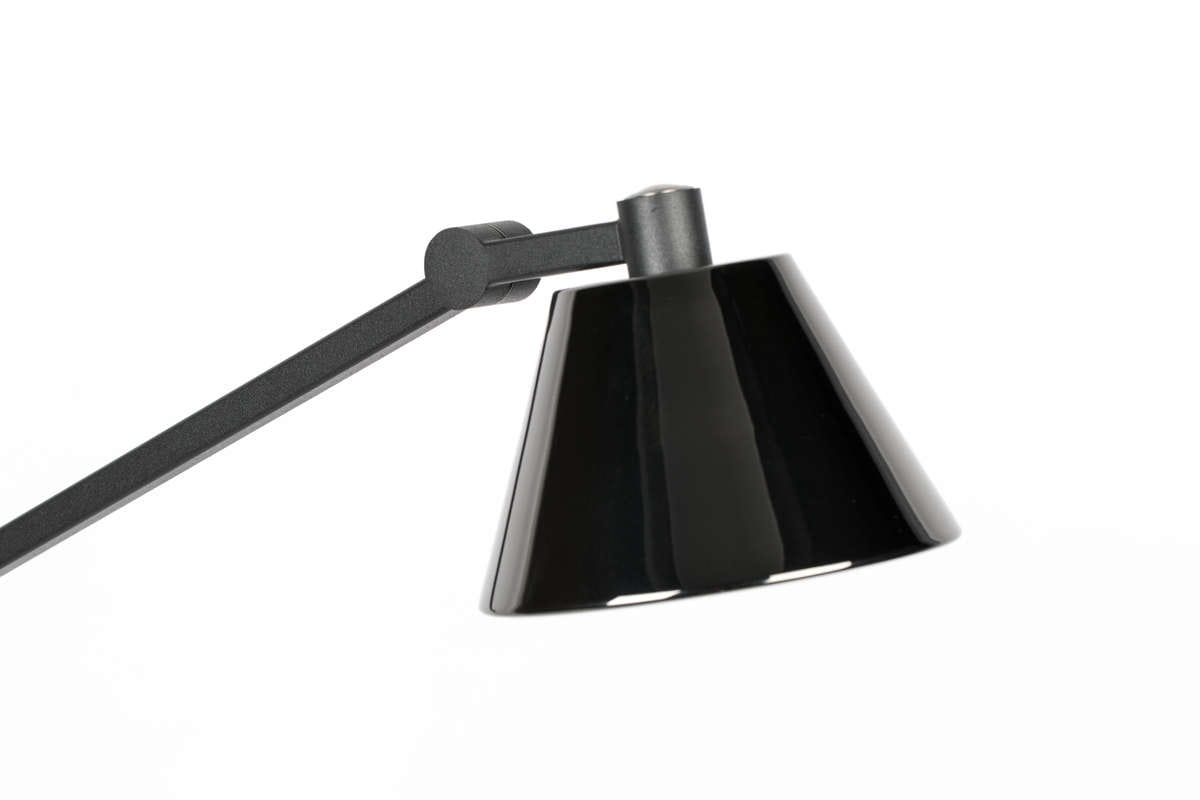 W całości wykonana jest z wytrzymałego, matowego żelaza w klasycznym, czarnym kolorze. Korpus lampy osadzony jest na cienkiej, okrągłej podstawie, która pomimo delikatnego wyglądu zapewnia dobrą stabilizację. Lampa ma regulowane ramię, za pomocą którego możemy kontrolować kąt nachylenia światła. Prosty, zwężający się klosz z błyszczącym wykończeniem stanowi zwieńczenie całej konstrukcji, która urzeka swą ponadczasowością. Klosz od środka wykończony jest białą powłoką, przypominająca ceramikę.