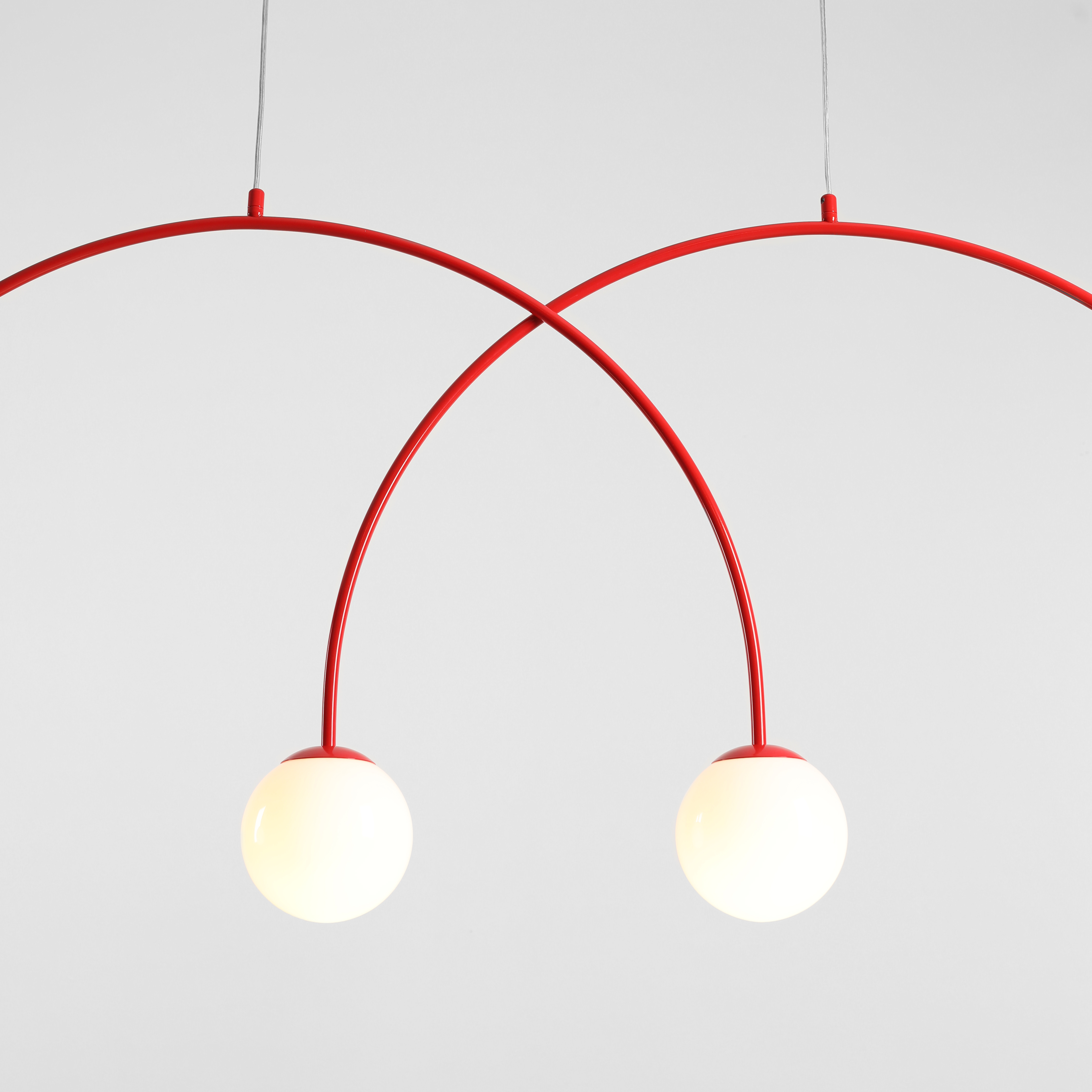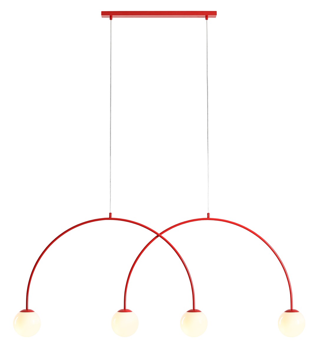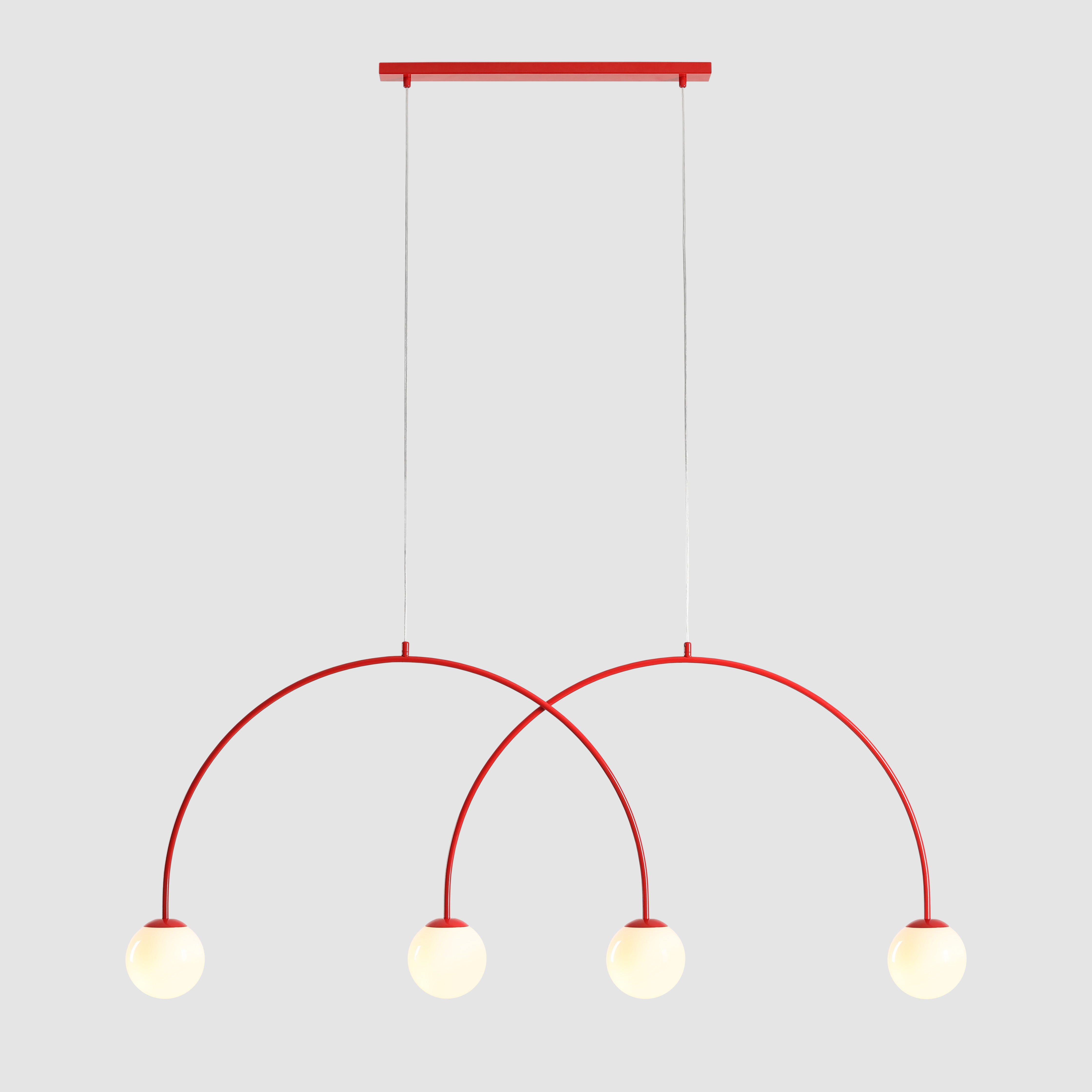Lampa wisząca Una 4 to imponująca forma oświetlenia, która zachwyca lekkością linii i wyrafinowaną symetrią. Jej konstrukcja opiera się na dwóch miękko wygiętych łukach, z których każdy zakończony jest opalowym, kulistym kloszem ze szkła. Harmonijna, architektoniczna forma tworzy niezwykły efekt wizualny i znakomicie sprawdza się jako centralny punkt wnętrza - nad stołem, wyspą kuchenną czy w przestronnym salonie.