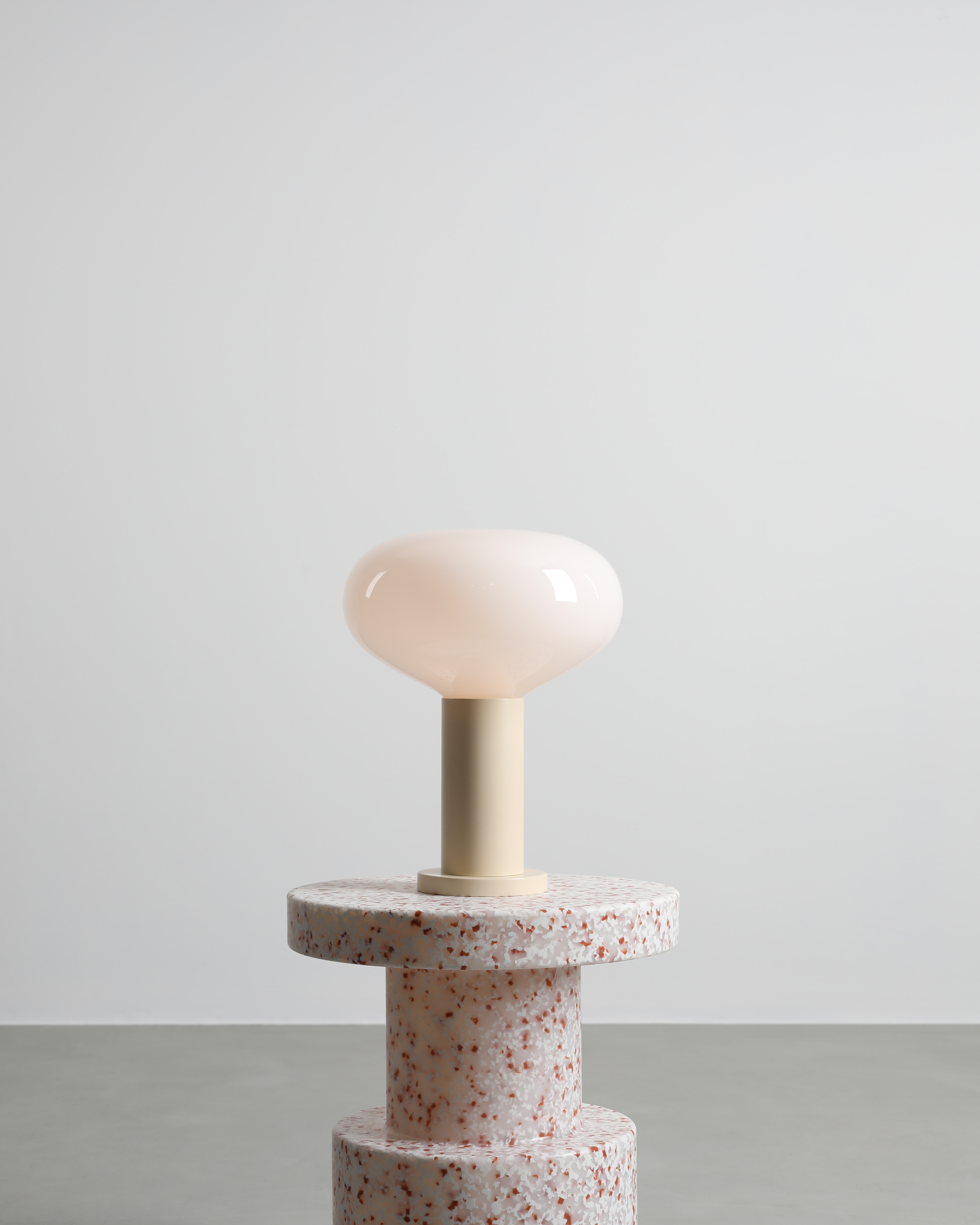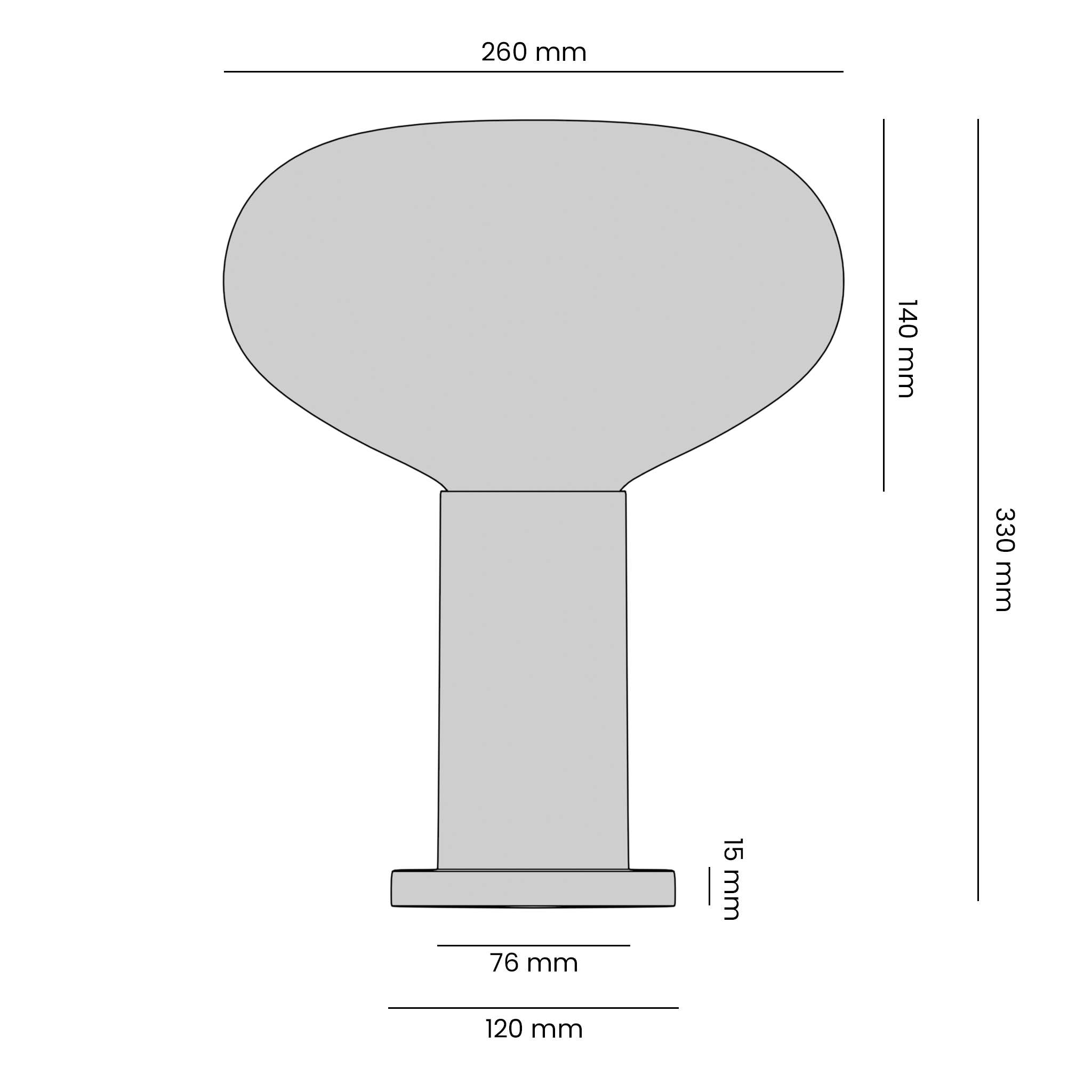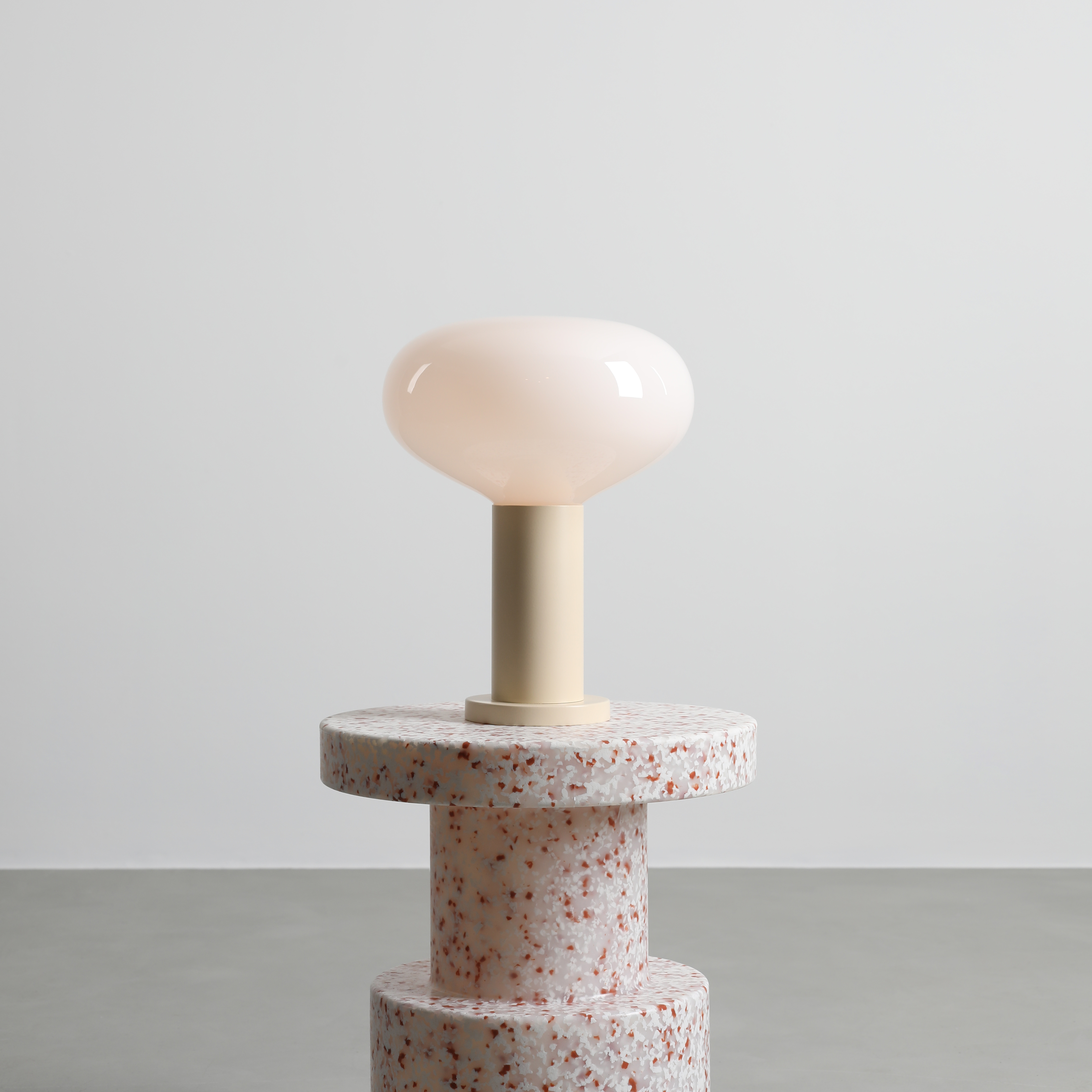 Jej ręcznie formowany klosz z opalowego szkła o organicznej, miękkiej linii delikatnie rozprasza światło, tworząc przytulną atmosferę – idealną do pracy, czytania lub wieczornego relaksu. Prosty, cylindryczny trzon z metalu w matowym wykończeniu nadaje lampie stabilność i nowoczesny charakter.