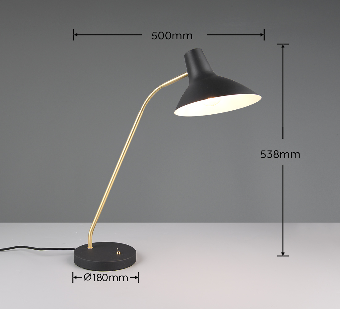 Lampa Traveller to połączenie minimalistycznego wzornictwa i praktycznej funkcjonalności, stworzone z myślą o codziennej pracy, czytaniu i tworzeniu przytulnej atmosfery. W całości wykonana z metalu, zachwyca lekką, elegancką konstrukcją: smukłe ramię w kolorze złota płynnie prowadzi do klasycznego, czarno-matowego klosza o delikatnie rozszerzanej formie, który precyzyjnie kieruje światło tam, gdzie jest najbardziej potrzebne.