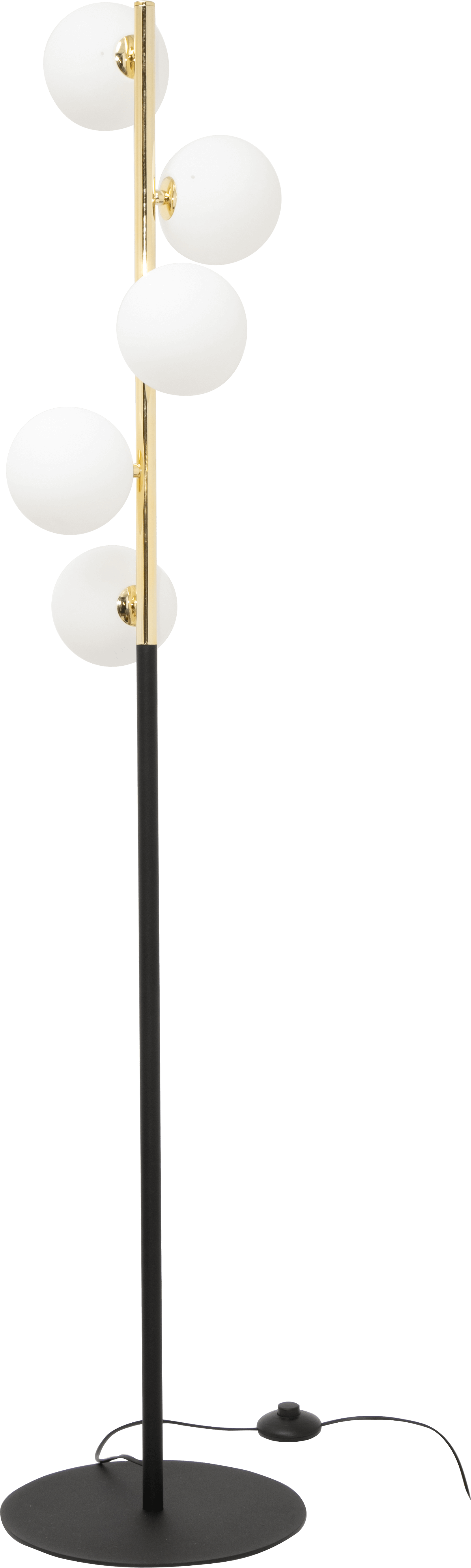 Nowoczesna lampa podłogowa z kulami marki Zuma Line. Pięć białych kloszy w kształcie kul rozmieszczono nieregularnie na metalowej, złotej konstrukcji. Mleczne szkło subtelnie tłumi światło, zapewniając równomierne rozproszenie.