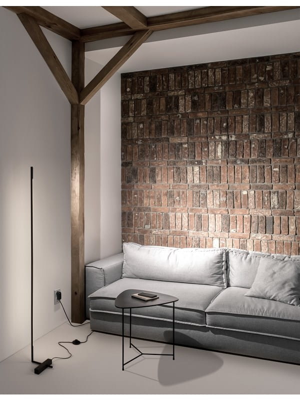 Lampa podłogowa Bell wykonana została z wysokiej jakości metalu, malowanego proszkowo na kolor czarny. Lampa ma formę wąskiego, okrągłego klosza wykonanego z akrylu, pod którym skrywa się wbudowane źródło światła LED. Prosta konstrukcja osadzona została na subtelnej podstawie w kształcie sześcianu, nadając całości lekkości.