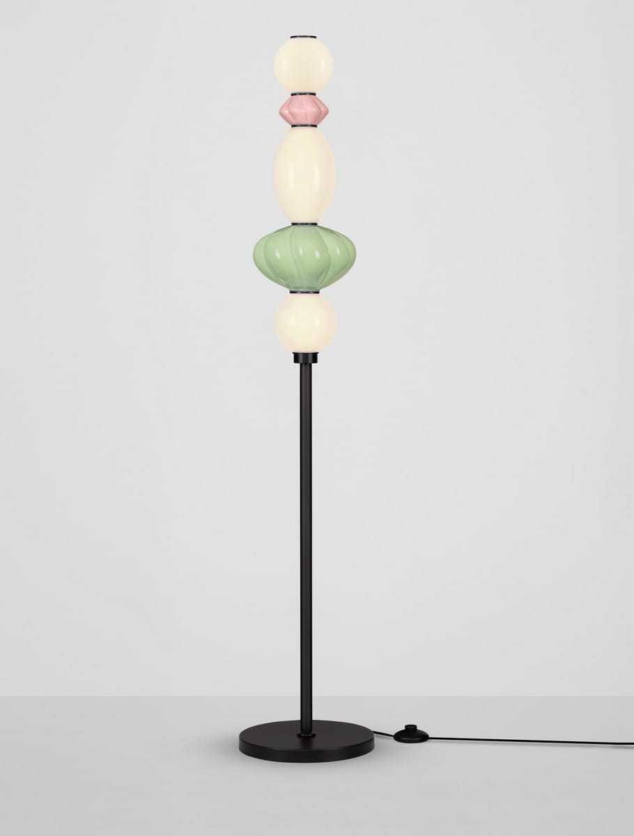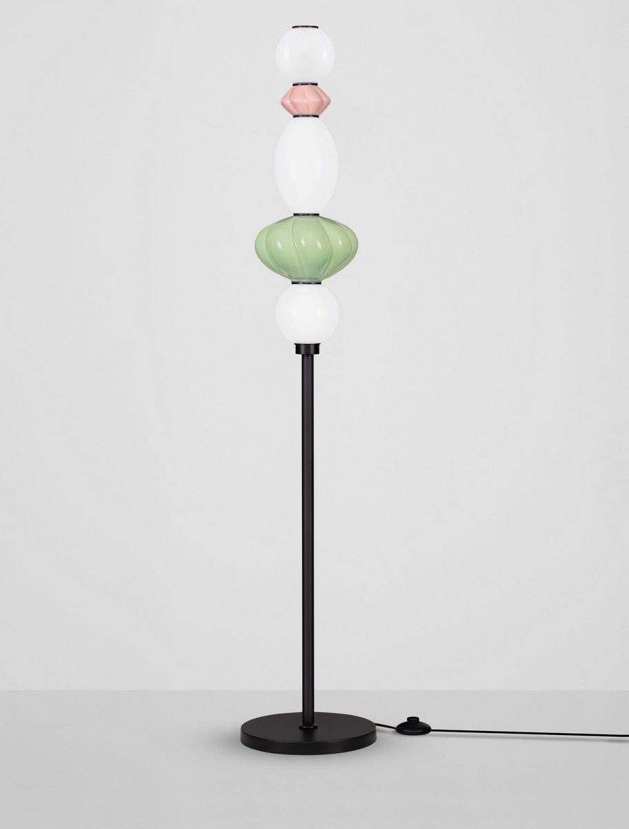 Lampa podłogowa Casurno to wyrazisty akcent dekoracyjny, który łączy artystyczną formę z funkcjonalnością codziennego użytku. Jej smukła, czarna konstrukcja stanowi eleganckie tło dla spektakularnego, kolorowego układu szklanych kloszy w pastelowych odcieniach bieli, różu i zieleni. Każdy element nawiązuje do kształtów koralików lub dekoracyjnych form ceramicznych, tworząc niepowtarzalną kompozycję inspirowaną sztuką użytkową.