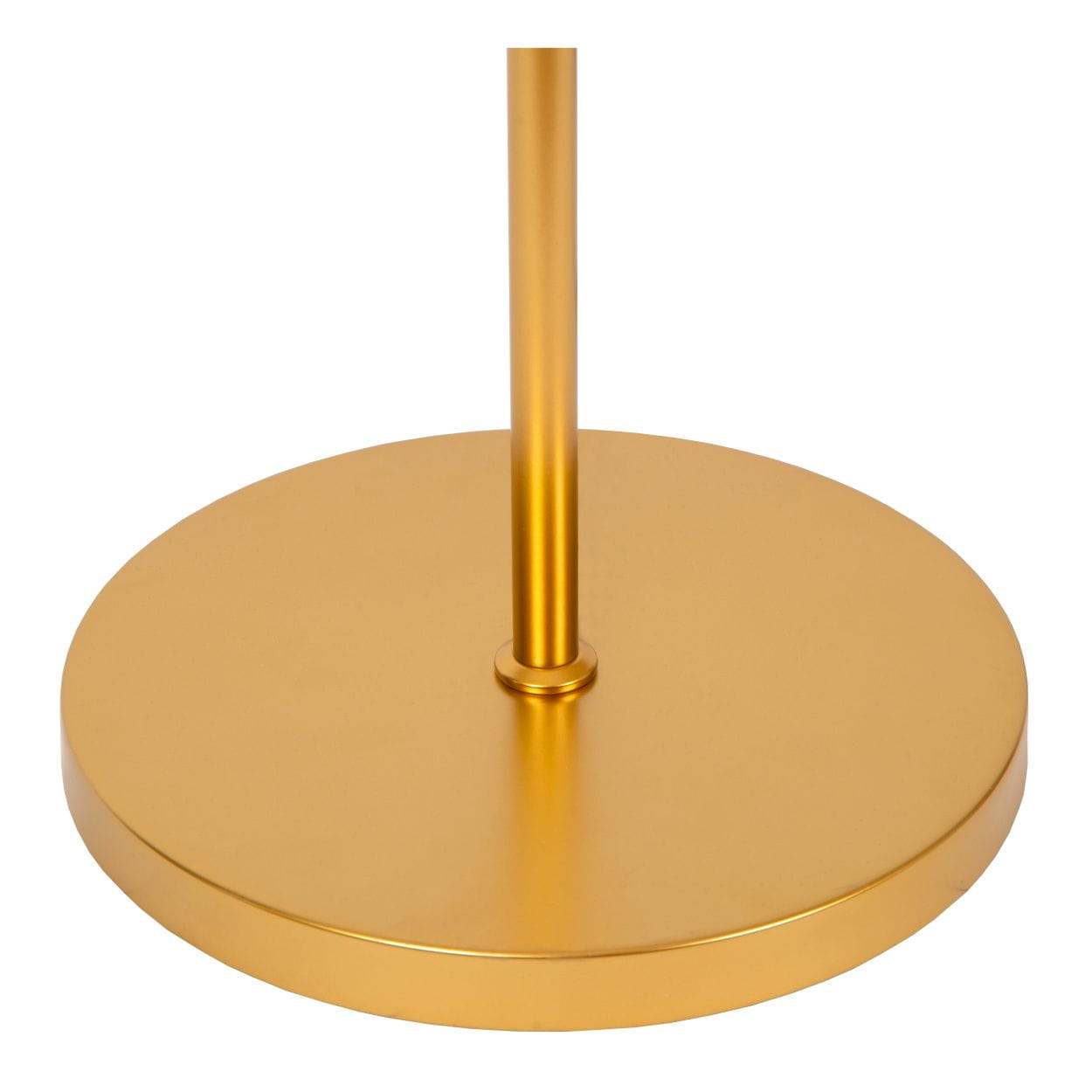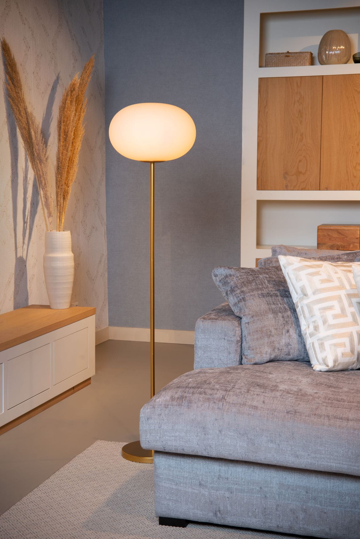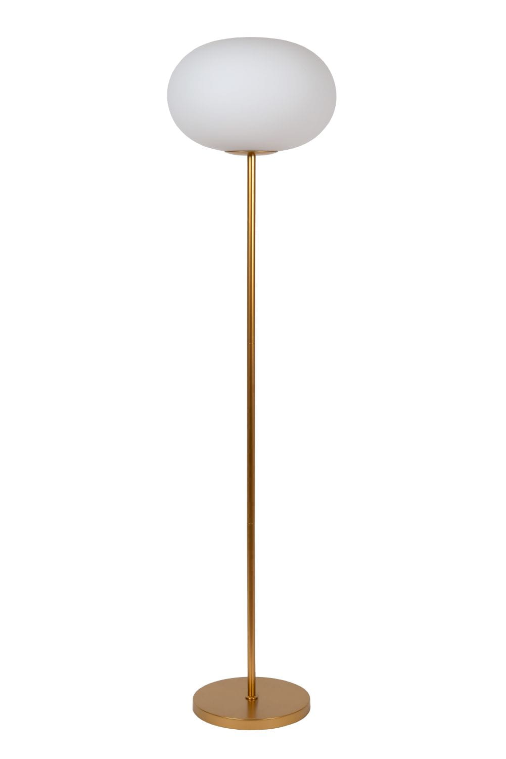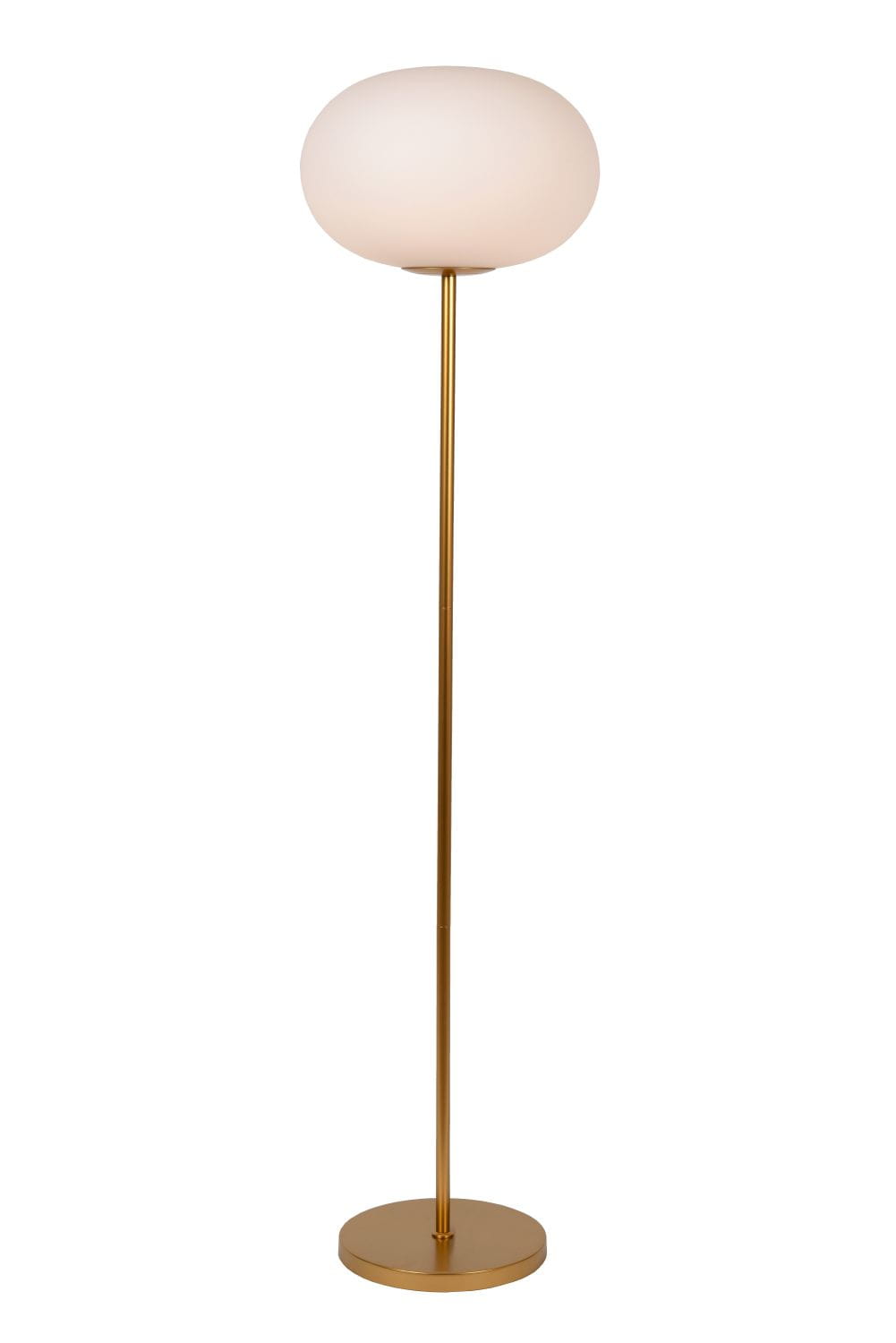Nowoczesna lampa podłogowa ze spłaszczoną kulą, przypominającą jajo. Ustawiona na złotej podstawie, lampa ta idealnie wpasuje się w styl glamour, modern classic czy też eklektyczny.