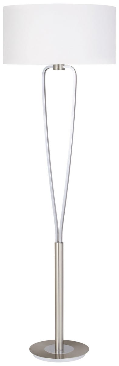 Stelaż wykonany został z wysokiej jakości metalu, który doskonale łączy odcień srebra z białym akcentem oraz tworzy niezwykle estetyczny kontrast kolorystyczny. To nie tylko gustowna dekoracja wnętrza, ale również stabilna i trwała konstrukcja, która niewątpliwie posłuży na długi czas. Abażur stanowi tkanina w kolorze klasycznej bieli, która nadaje lampie swoistej lekkości i delikatności. Całość utrzymuje okrągła podstawa wraz z pionowym ramieniem, który rozdwaja się, tworząc przy tym kształt owalnego trójkąta.