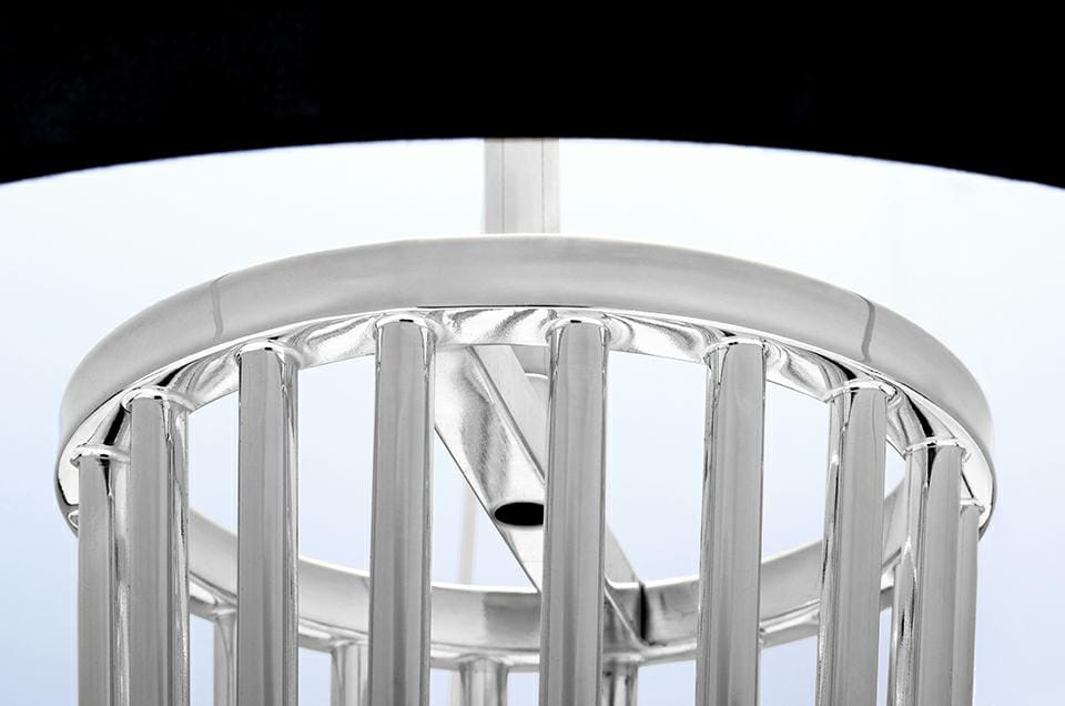 Lampa wykonana ze stali węglowej w kolorze chromowym, błyszczącym.