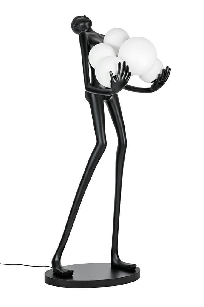 Lampa Human to figura kobiecej sylwetki, wykonana z czarnego włókna szklanego, rozmiarem i wysokością dorównuje naturalnemu wzrostowi człowieka. Świecąca figura dźwiga przed sobą świetlne kule wypełniające wnętrze miękkim, przyjemnym światłem.