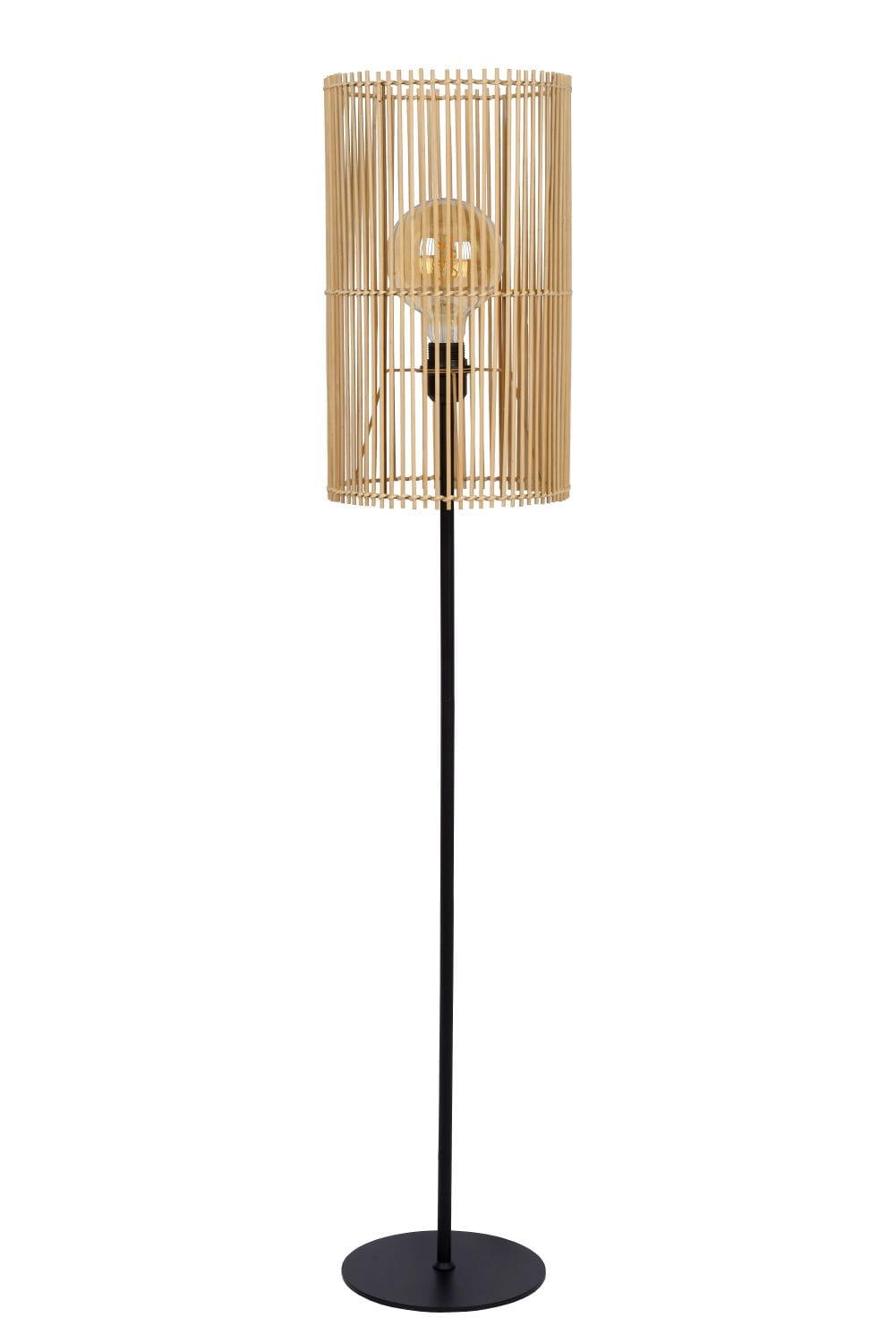 Stelaż lampy wykonany został z wysokiej jakości metalu w kolorze klasycznej czerni, dzięki czemu lampa to wysoce designerski dodatek aranżacyjny oraz stabilna i trwała konstrukcja. Klosz wykonany został z rattanu, który charakteryzuje się wyjątkową odpornością na uszkodzenia mechaniczne, temperaturę i wilgoć. Poza funkcjonalnymi aspektami jest także wysoce atrakcyjny wizualnie, a jego obecność we wnętrzu nadaje ciepłej atmosfery. Całość utrzymuje okrągła podstawa wraz ze smukłym ramieniem, do którego został przymocowany cylindryczny klosz. Włącznik światła umieszczony został na kablu.
